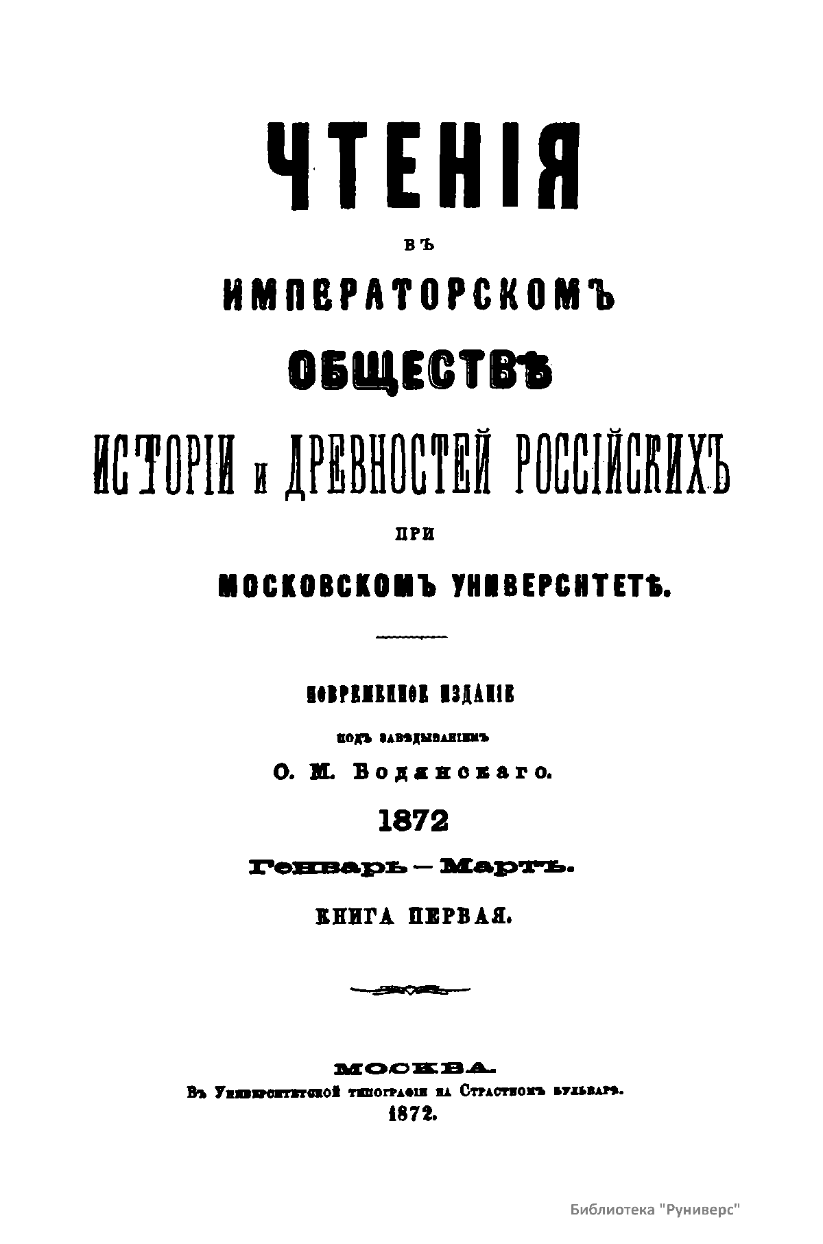 Чтенiя въ Императорскомъ Обществѣ Исторiи и Древностей Россiйскихъ при Московскомъ Университетѣ. 1872. Генварь-Мартъ. Книга первая