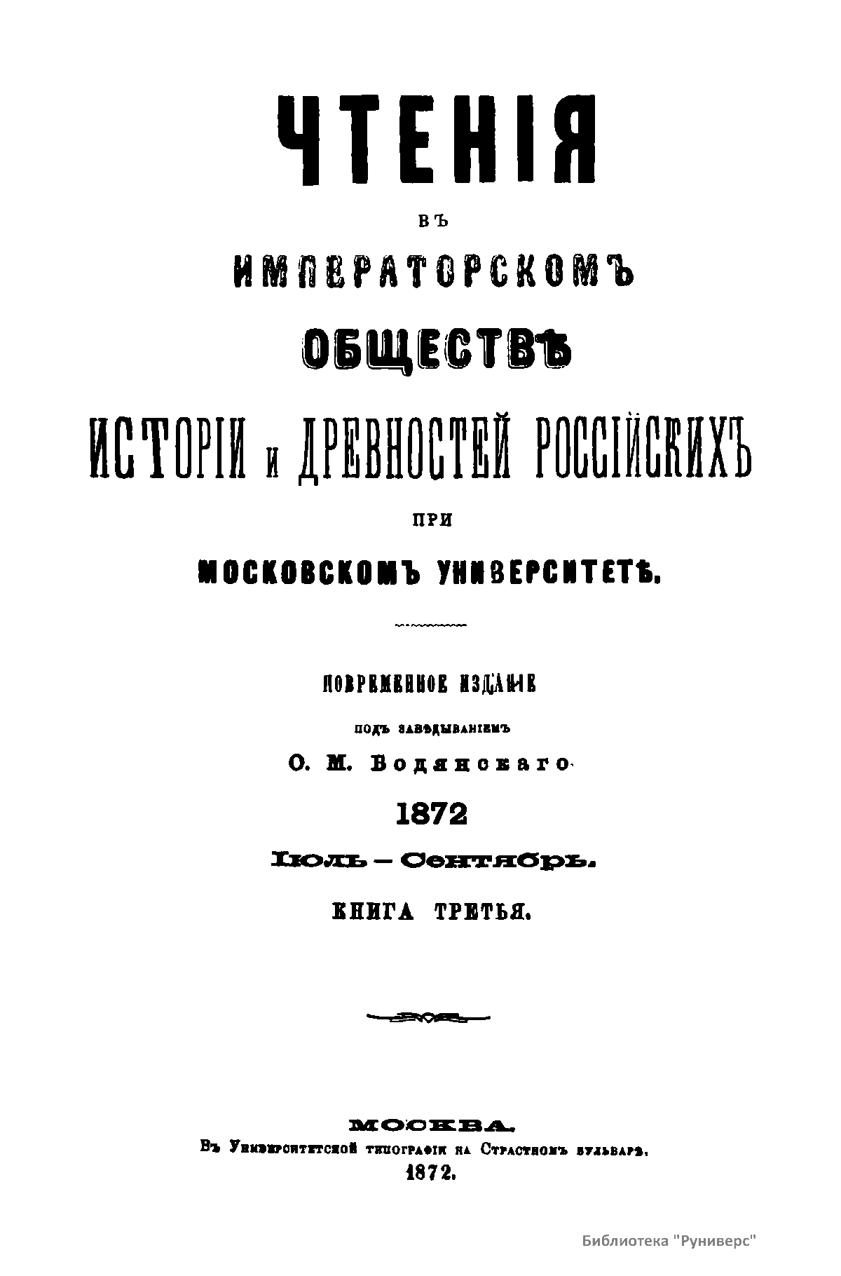 Чтенiя въ Императорскомъ Обществѣ Исторiи и Древностей Россiйскихъ при Московскомъ Университетѣ. 1872. Iюль-Сентябрь. Книга третья