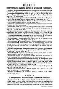 «Чтения в Императорском обществе истории и древностей российских» – периодическое издание трудов Общества. Выпускались отдельными книгами на протяжении 72 лет с десятилетним перерывом. Первая книга вышла в свет в январе 1846 г. Каждая книга состояла из четырех разделов: исторических исследований, отечественных исторических документальных материалов, иностранных материалов и смеси. Публиковались также исследования и материалы по археологии, этнографии, нумизматике, палеографии и другим дисциплинам. До июня 1848 г. было выпущено 23 книги «Чтений». В июньской книге за 1848 г. О. М. Бодянский поместил записки Дж. Флетчера о Московском государстве, что вызвало недовольство Николая I. «Чтения» были закрыты, а Бодянский удален из Московского университета. Издание «Чтений» возобновилось только в 1858 г., когда Бодянский снова стал секретарем общества. Издание приняло славянофильское направление, к прежним четырем разделам «Чтений» прибавился раздел славянских материалов. С 1858 г. «Чтения» выходили в свет четыре раза в год.