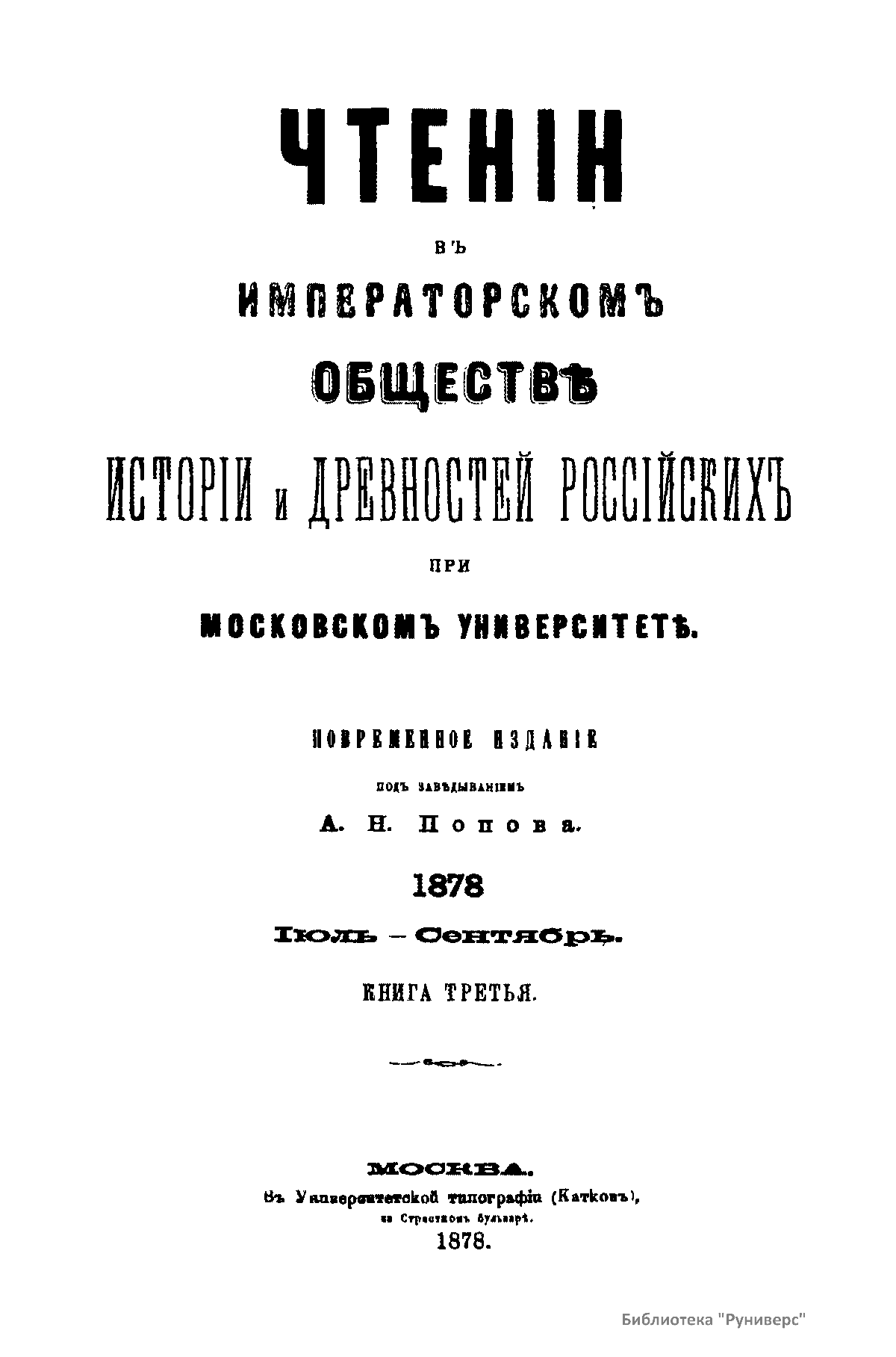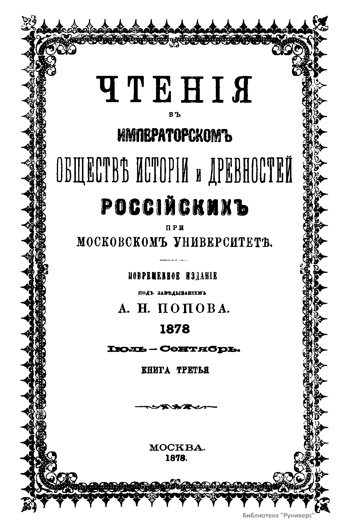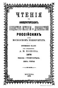 Чтенiя въ Императорскомъ Обществѣ Исторiи и Древностей Россiйскихъ при Московскомъ Университетѣ. 1878. Iюль-Сентябрь. Книга третья