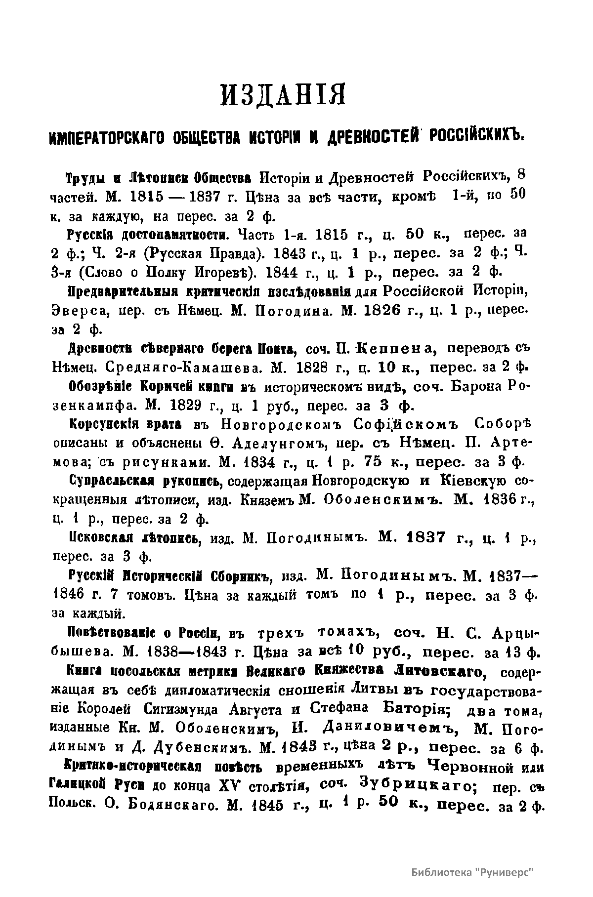 «Чтения в Императорском обществе истории и древностей российских» – периодическое издание трудов Общества. Выпускались отдельными книгами на протяжении 72 лет с десятилетним перерывом. Первая книга вышла в свет в январе 1846 г. Каждая книга состояла из четырех разделов: исторических исследований, отечественных исторических документальных материалов, иностранных материалов и смеси. Публиковались также исследования и материалы по археологии, этнографии, нумизматике, палеографии и другим дисциплинам. До июня 1848 г. было выпущено 23 книги «Чтений». В июньской книге за 1848 г. О. М. Бодянский поместил записки Дж. Флетчера о Московском государстве, что вызвало недовольство Николая I. «Чтения» были закрыты, а Бодянский удален из Московского университета. Издание «Чтений» возобновилось только в 1858 г., когда Бодянский снова стал секретарем общества. Издание приняло славянофильское направление, к прежним четырем разделам «Чтений» прибавился раздел славянских материалов. С 1858 г. «Чтения» выходили в свет четыре раза в год.