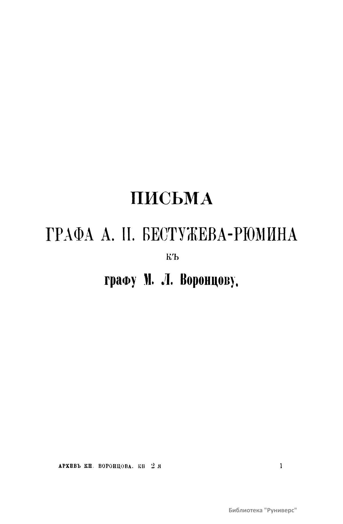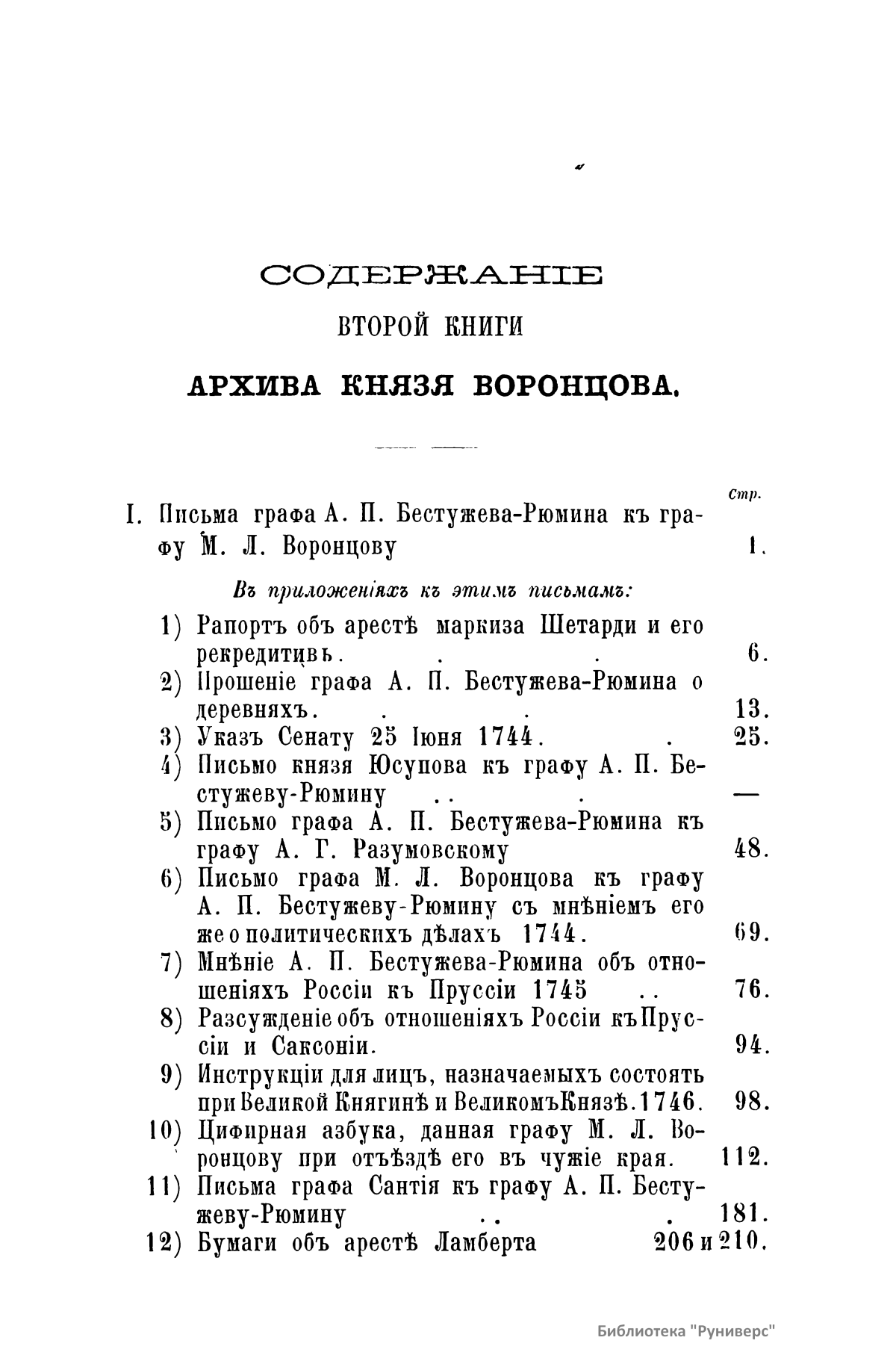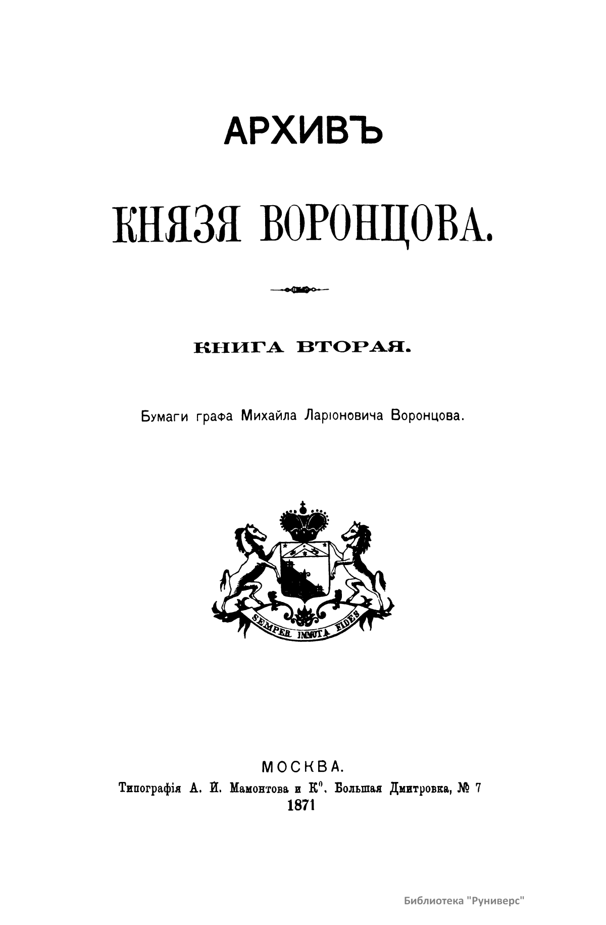 Издание представляет документы из архива графов (с 1845 г. князей) Воронцовых, крупных политических деятелей России XVIII и XIX вв.: Михаила Илларионовича (1714 – 1767) – канцлера при Елизавете Петровне; Романа Илларионовича (1707 – 1783); Александра Романовича (1741 – 1805) – канцлера в 1802 – 1804 гг.; Семена Романовича (1744 – 1832) – посла в Англии в 1785 – 1806 гг.; Михаила Семеновича (1782 – 1856) – фельдмаршала, наместника Кавказа в 1845 – 1853 гг. Архив издан в 40 тт. (1870 – 1895) под редакцией П. И. Бартенева. Содержит огромный материал по внешней политике, по управлению хозяйством Елизаветы Петровны (кн. 1), по делу Миниха и Бирона (кн. 2), о «чумном бунте» 1771 г. в Москве, о движении Е. И. Пугачева (кн. 16), о А. Н. Радищеве (кн. 5, 12, 24). Книга 21-я занята «Записками» Е. Р. Воронцовой (Дашковой). В книге 24-й – свыше 100 писем А. В. Суворова. Среди обширной переписки Воронцовых встречаются письма Вольтера, Д'Аламбера, Жозефа де Местра, Костюшки, Талейрана, Питта и др.