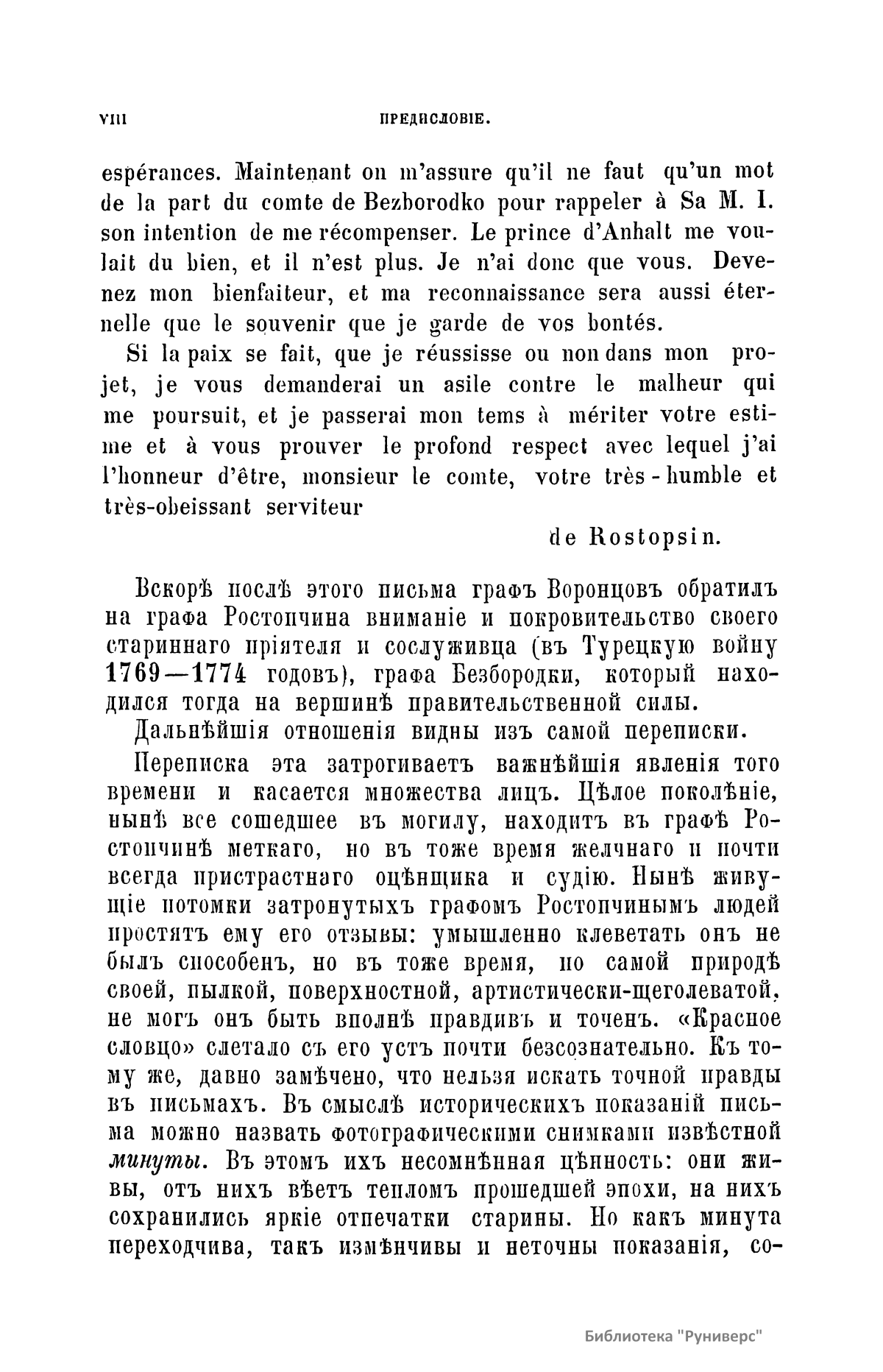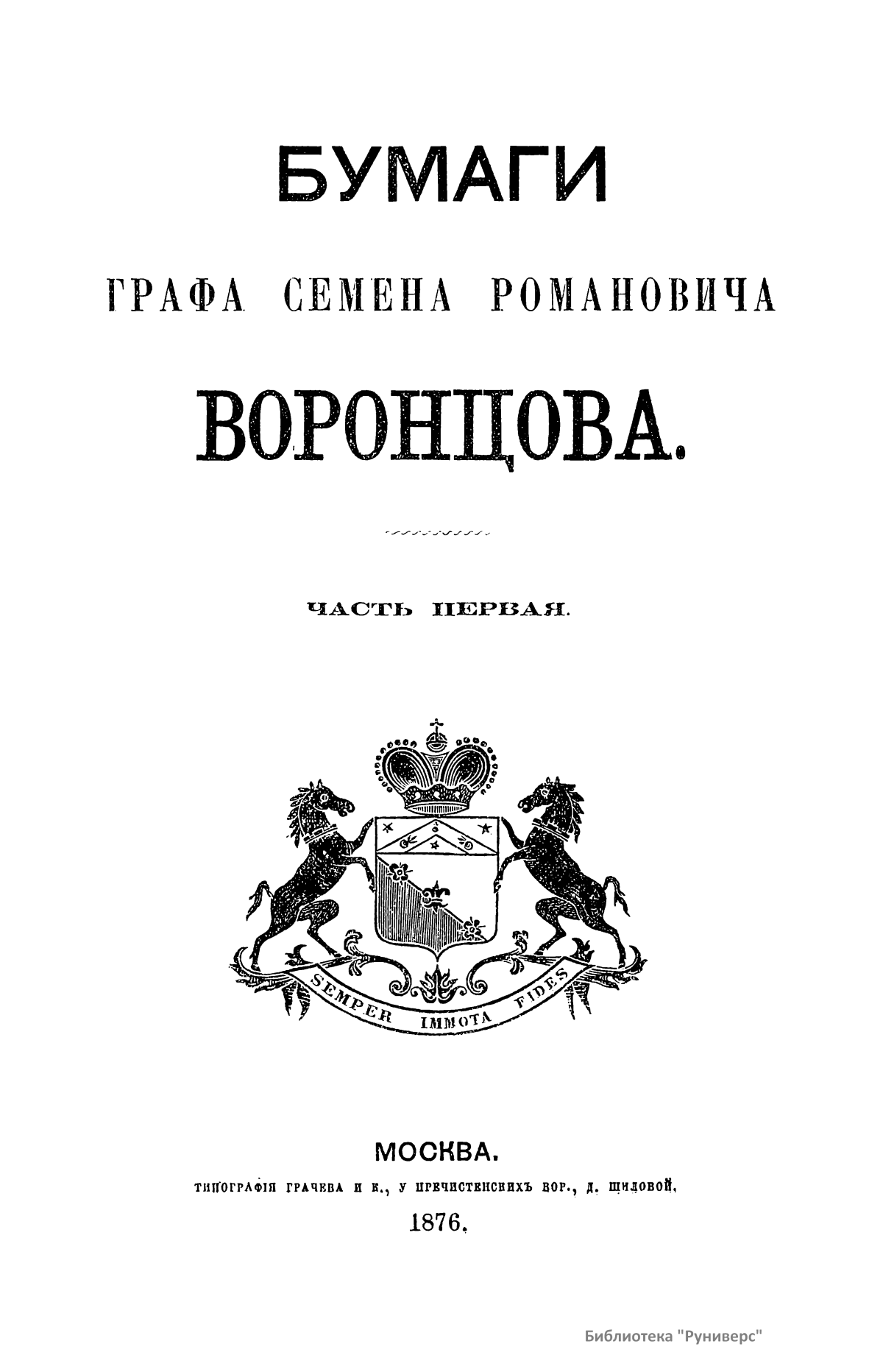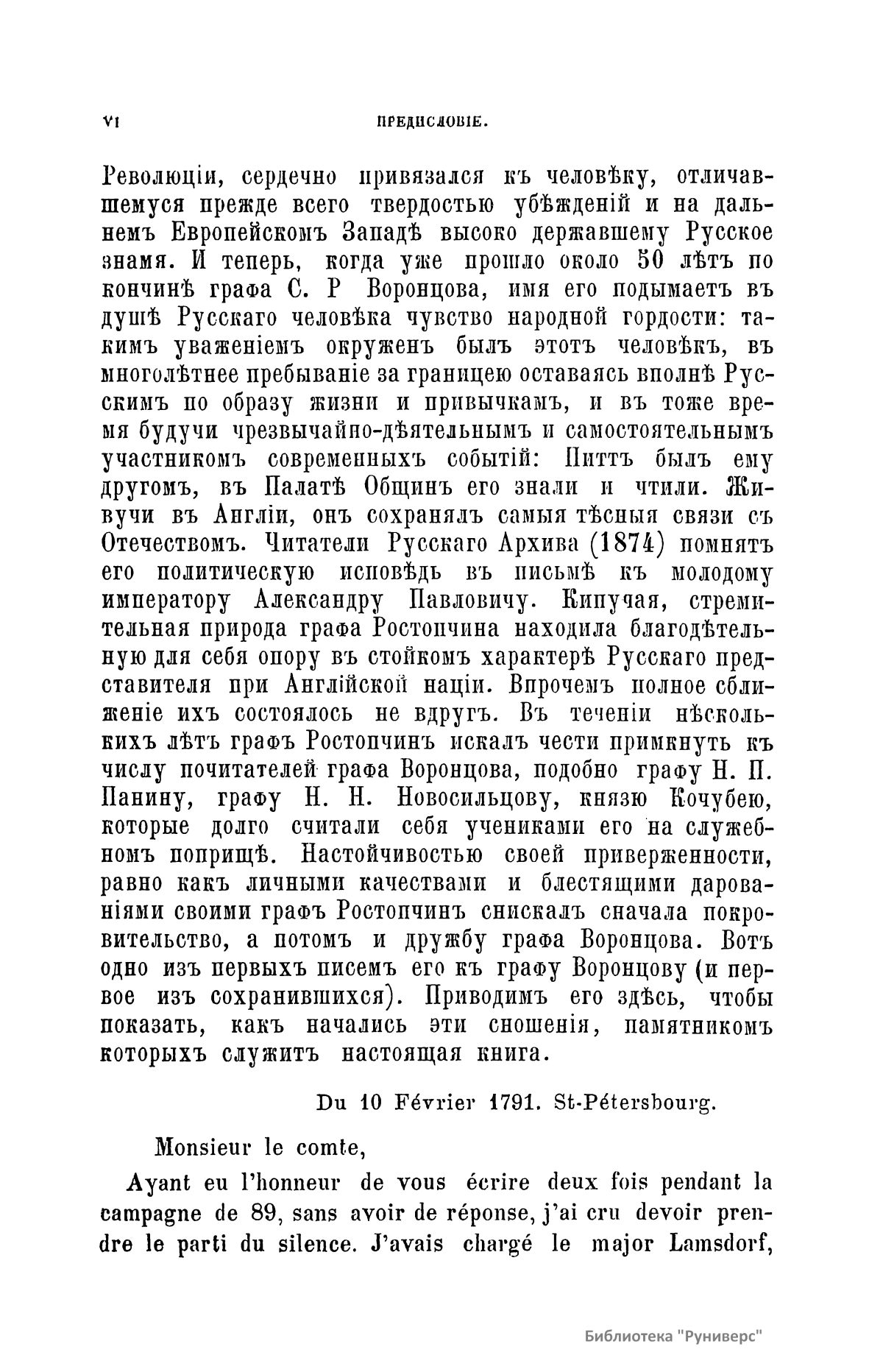 Издание представляет документы из архива графов (с 1845 г. князей) Воронцовых, крупных политических деятелей России XVIII и XIX вв.: Михаила Илларионовича (1714 – 1767) – канцлера при Елизавете Петровне; Романа Илларионовича (1707 – 1783); Александра Романовича (1741 – 1805) – канцлера в 1802 – 1804 гг.; Семена Романовича (1744 – 1832) – посла в Англии в 1785 – 1806 гг.; Михаила Семеновича (1782 – 1856) – фельдмаршала, наместника Кавказа в 1845 – 1853 гг. Архив издан в 40 тт. (1870 – 1895) под редакцией П. И. Бартенева. Содержит огромный материал по внешней политике, по управлению хозяйством Елизаветы Петровны (кн. 1), по делу Миниха и Бирона (кн. 2), о «чумном бунте» 1771 г. в Москве, о движении Е. И. Пугачева (кн. 16), о А. Н. Радищеве (кн. 5, 12, 24). Книга 21-я занята «Записками» Е. Р. Воронцовой (Дашковой). В книге 24-й – свыше 100 писем А. В. Суворова. Среди обширной переписки Воронцовых встречаются письма Вольтера, Д'Аламбера, Жозефа де Местра, Костюшки, Талейрана, Питта и др.
