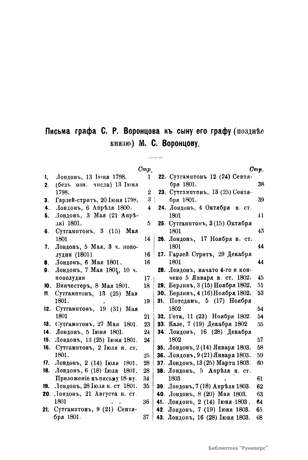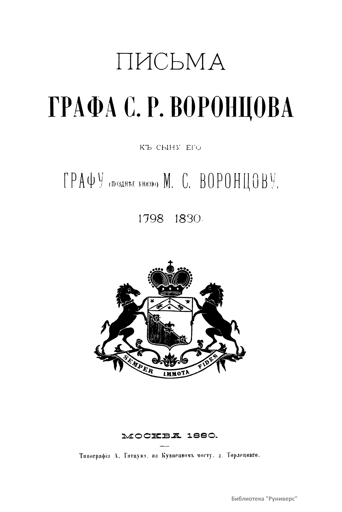 Издание представляет документы из архива графов (с 1845 г. князей) Воронцовых, крупных политических деятелей России XVIII и XIX вв.: Михаила Илларионовича (1714 – 1767) – канцлера при Елизавете Петровне; Романа Илларионовича (1707 – 1783); Александра Романовича (1741 – 1805) – канцлера в 1802 – 1804 гг.; Семена Романовича (1744 – 1832) – посла в Англии в 1785 – 1806 гг.; Михаила Семеновича (1782 – 1856) – фельдмаршала, наместника Кавказа в 1845 – 1853 гг. Архив издан в 40 тт. (1870 – 1895) под редакцией П. И. Бартенева. Содержит огромный материал по внешней политике, по управлению хозяйством Елизаветы Петровны (кн. 1), по делу Миниха и Бирона (кн. 2), о «чумном бунте» 1771 г. в Москве, о движении Е. И. Пугачева (кн. 16), о А. Н. Радищеве (кн. 5, 12, 24). Книга 21-я занята «Записками» Е. Р. Воронцовой (Дашковой). В книге 24-й – свыше 100 писем А. В. Суворова. Среди обширной переписки Воронцовых встречаются письма Вольтера, Д'Аламбера, Жозефа де Местра, Костюшки, Талейрана, Питта и др.