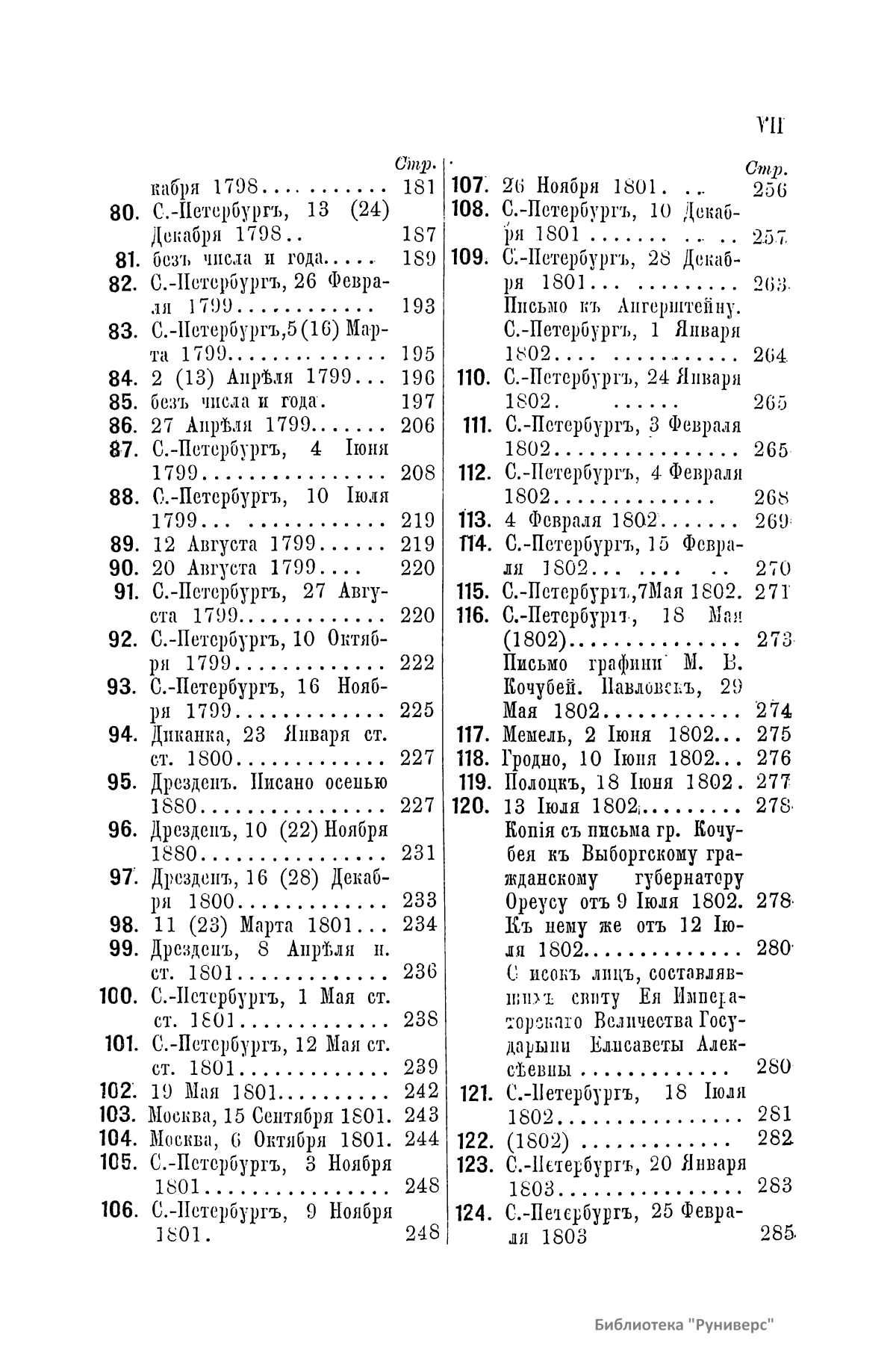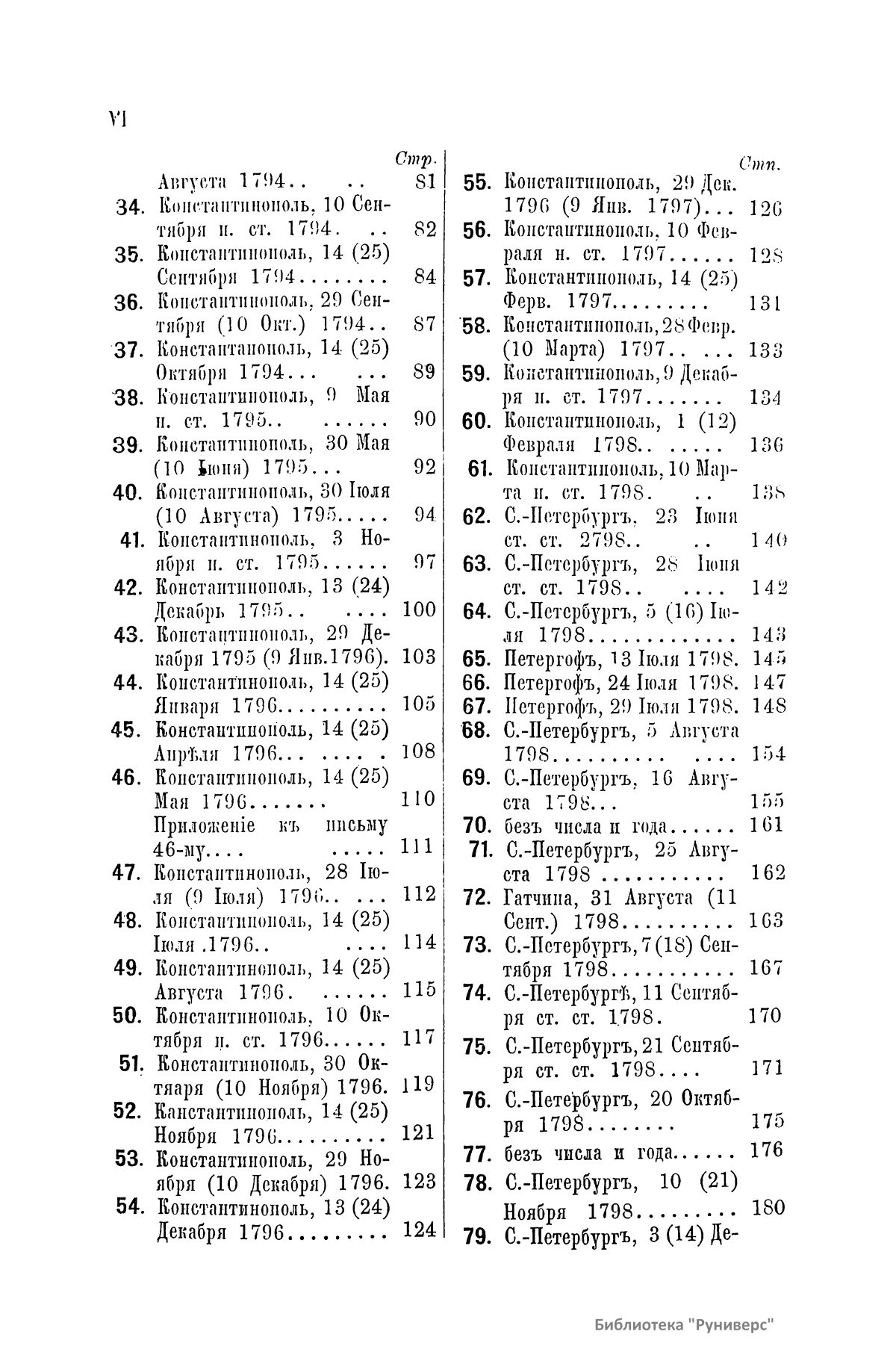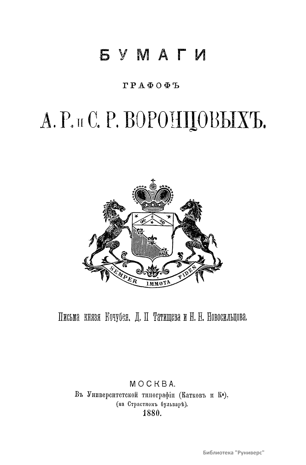 Издание представляет документы из архива графов (с 1845 г. князей) Воронцовых, крупных политических деятелей России XVIII и XIX вв.: Михаила Илларионовича (1714 – 1767) – канцлера при Елизавете Петровне; Романа Илларионовича (1707 – 1783); Александра Романовича (1741 – 1805) – канцлера в 1802 – 1804 гг.; Семена Романовича (1744 – 1832) – посла в Англии в 1785 – 1806 гг.; Михаила Семеновича (1782 – 1856) – фельдмаршала, наместника Кавказа в 1845 – 1853 гг. Архив издан в 40 тт. (1870 – 1895) под редакцией П. И. Бартенева. Содержит огромный материал по внешней политике, по управлению хозяйством Елизаветы Петровны (кн. 1), по делу Миниха и Бирона (кн. 2), о «чумном бунте» 1771 г. в Москве, о движении Е. И. Пугачева (кн. 16), о А. Н. Радищеве (кн. 5, 12, 24). Книга 21-я занята «Записками» Е. Р. Воронцовой (Дашковой). В книге 24-й – свыше 100 писем А. В. Суворова. Среди обширной переписки Воронцовых встречаются письма Вольтера, Д'Аламбера, Жозефа де Местра, Костюшки, Талейрана, Питта и др.