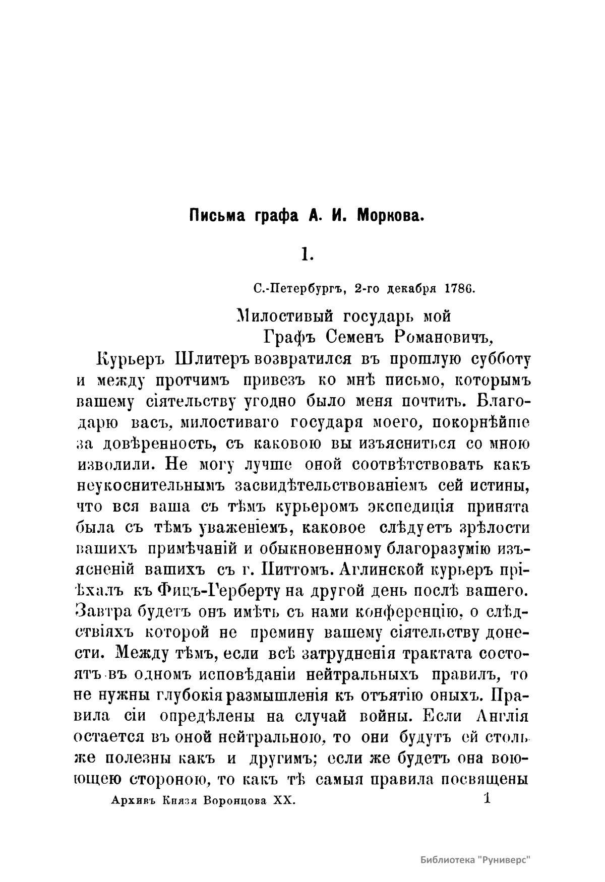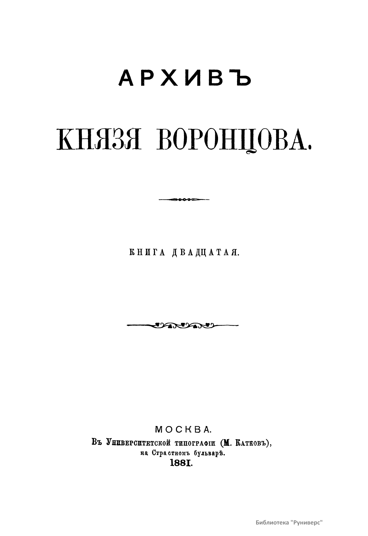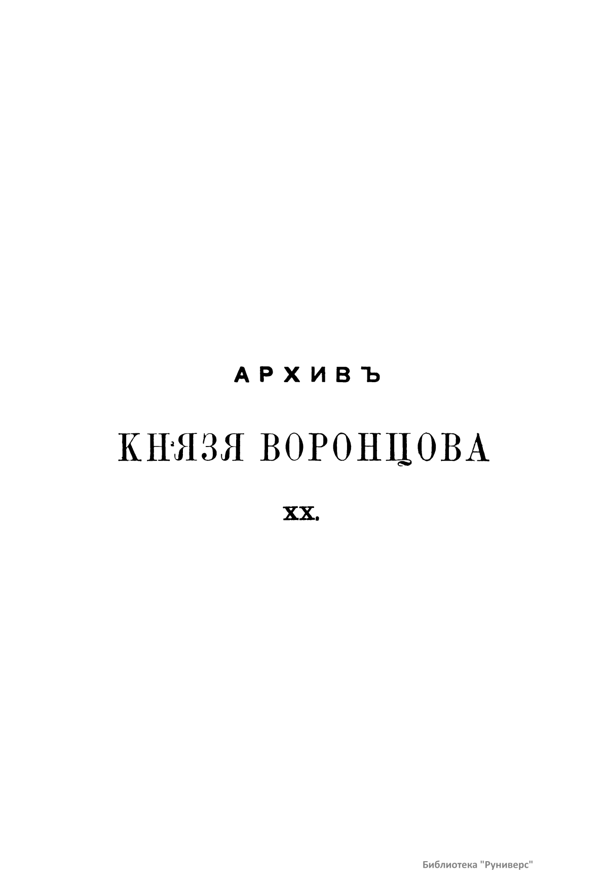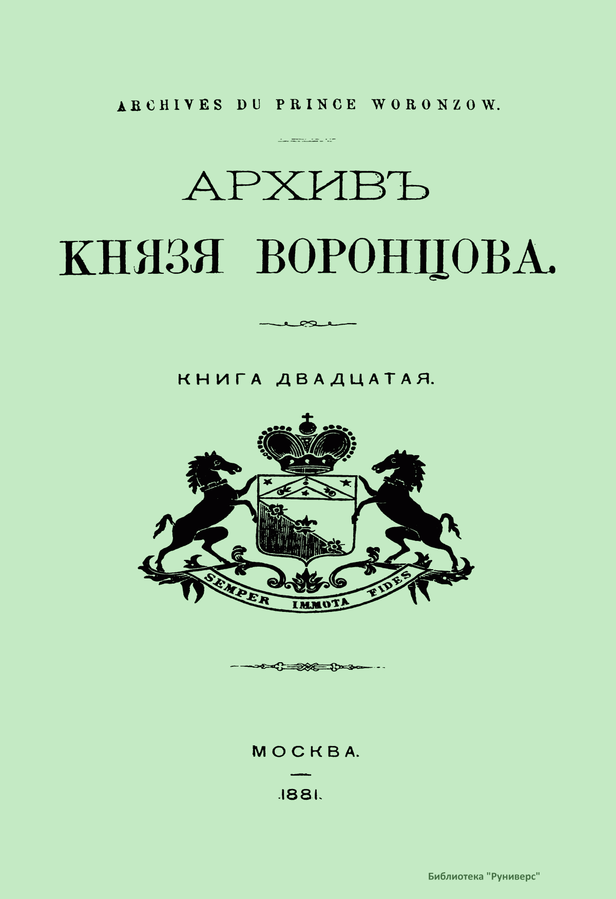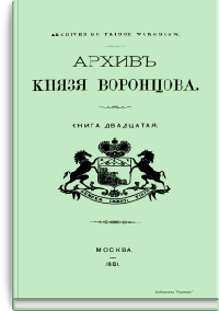 Издание представляет документы из архива графов (с 1845 г. князей) Воронцовых, крупных политических деятелей России XVIII и XIX вв.: Михаила Илларионовича (1714 – 1767) – канцлера при Елизавете Петровне; Романа Илларионовича (1707 – 1783); Александра Романовича (1741 – 1805) – канцлера в 1802 – 1804 гг.; Семена Романовича (1744 – 1832) – посла в Англии в 1785 – 1806 гг.; Михаила Семеновича (1782 – 1856) – фельдмаршала, наместника Кавказа в 1845 – 1853 гг. Архив издан в 40 тт. (1870 – 1895) под редакцией П. И. Бартенева. Содержит огромный материал по внешней политике, по управлению хозяйством Елизаветы Петровны (кн. 1), по делу Миниха и Бирона (кн. 2), о «чумном бунте» 1771 г. в Москве, о движении Е. И. Пугачева (кн. 16), о А. Н. Радищеве (кн. 5, 12, 24). Книга 21-я занята «Записками» Е. Р. Воронцовой (Дашковой). В книге 24-й – свыше 100 писем А. В. Суворова. Среди обширной переписки Воронцовых встречаются письма Вольтера, Д'Аламбера, Жозефа де Местра, Костюшки, Талейрана, Питта и др.