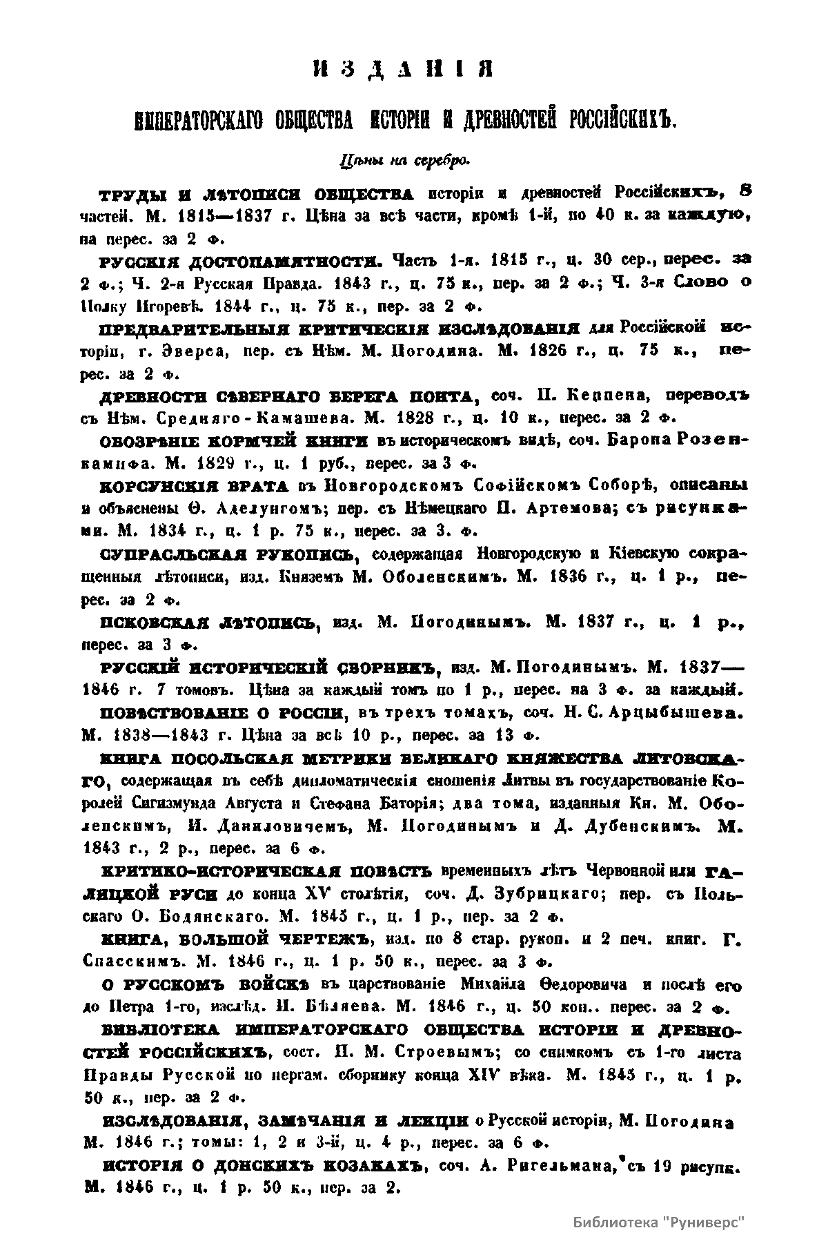 «Чтения в Императорском обществе истории и древностей российских» – периодическое издание трудов Общества. Выпускались отдельными книгами на протяжении 72 лет с десятилетним перерывом. Первая книга вышла в свет в январе 1846 г. Каждая книга состояла из четырех разделов: исторических исследований, отечественных исторических документальных материалов, иностранных материалов и смеси. Публиковались также исследования и материалы по археологии, этнографии, нумизматике, палеографии и другим дисциплинам. До июня 1848 г. было выпущено 23 книги «Чтений». В июньской книге за 1848 г. О. М. Бодянский поместил записки Дж. Флетчера о Московском государстве, что вызвало недовольство Николая I. «Чтения» были закрыты, а Бодянский удален из Московского университета. Издание «Чтений» возобновилось только в 1858 г., когда Бодянский снова стал секретарем общества. Издание приняло славянофильское направление, к прежним четырем разделам «Чтений» прибавился раздел славянских материалов. С 1858 г. «Чтения» выходили в свет четыре раза в год.