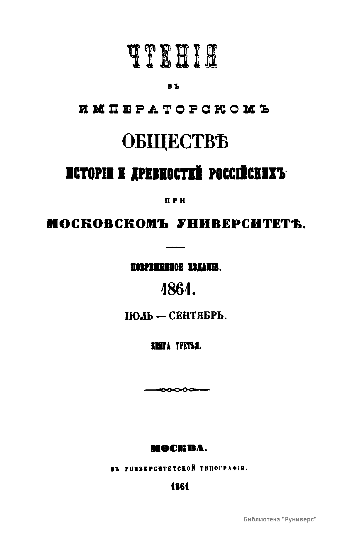 Чтенiя въ Императорскомъ Обществѣ Исторiи и Древностей Россiйскихъ при Московскомъ Университетѣ. 1861. Iюль-Сентябрь. Книга третья