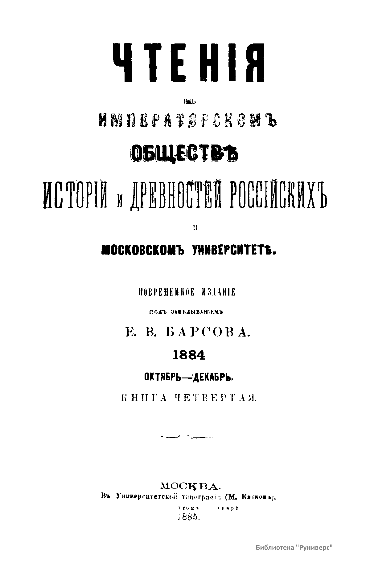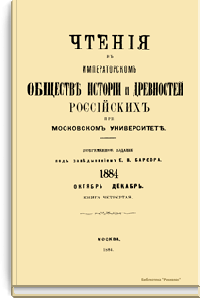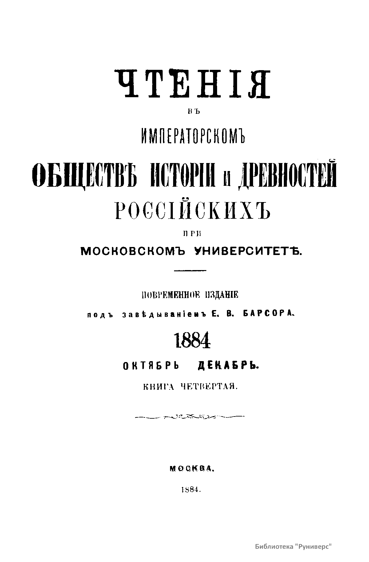 Чтенiя въ Императорскомъ Обществѣ Исторiи и Древностей Россiйскихъ при Московскомъ Университетѣ. 1884. Октябрь-Декабрь. Книга четвертая