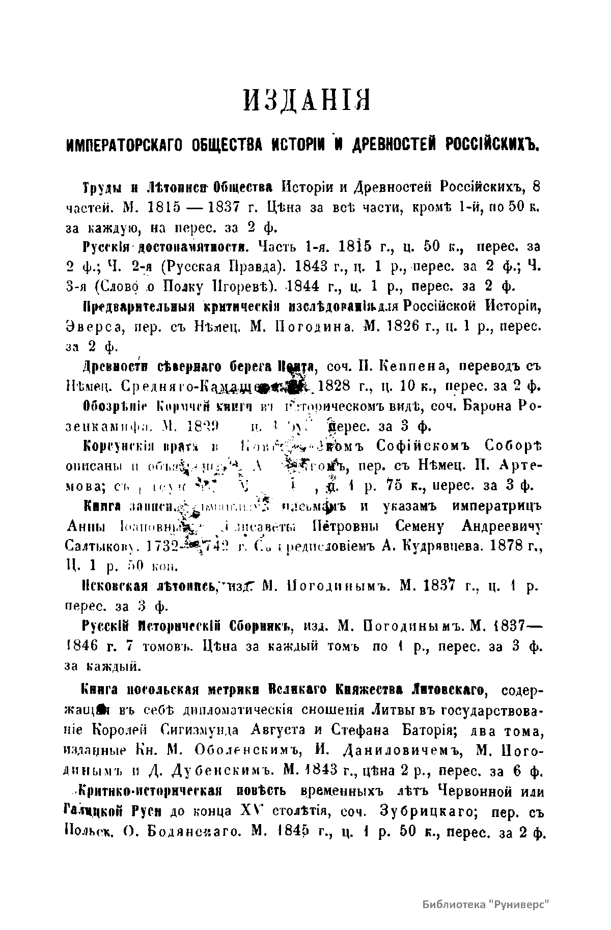 «Чтения в Императорском обществе истории и древностей российских» – периодическое издание трудов Общества. Выпускались отдельными книгами на протяжении 72 лет с десятилетним перерывом. Первая книга вышла в свет в январе 1846 г. Каждая книга состояла из четырех разделов: исторических исследований, отечественных исторических документальных материалов, иностранных материалов и смеси. Публиковались также исследования и материалы по археологии, этнографии, нумизматике, палеографии и другим дисциплинам. До июня 1848 г. было выпущено 23 книги «Чтений». В июньской книге за 1848 г. О. М. Бодянский поместил записки Дж. Флетчера о Московском государстве, что вызвало недовольство Николая I. «Чтения» были закрыты, а Бодянский удален из Московского университета. Издание «Чтений» возобновилось только в 1858 г., когда Бодянский снова стал секретарем общества. Издание приняло славянофильское направление, к прежним четырем разделам «Чтений» прибавился раздел славянских материалов. С 1858 г. «Чтения» выходили в свет четыре раза в год.