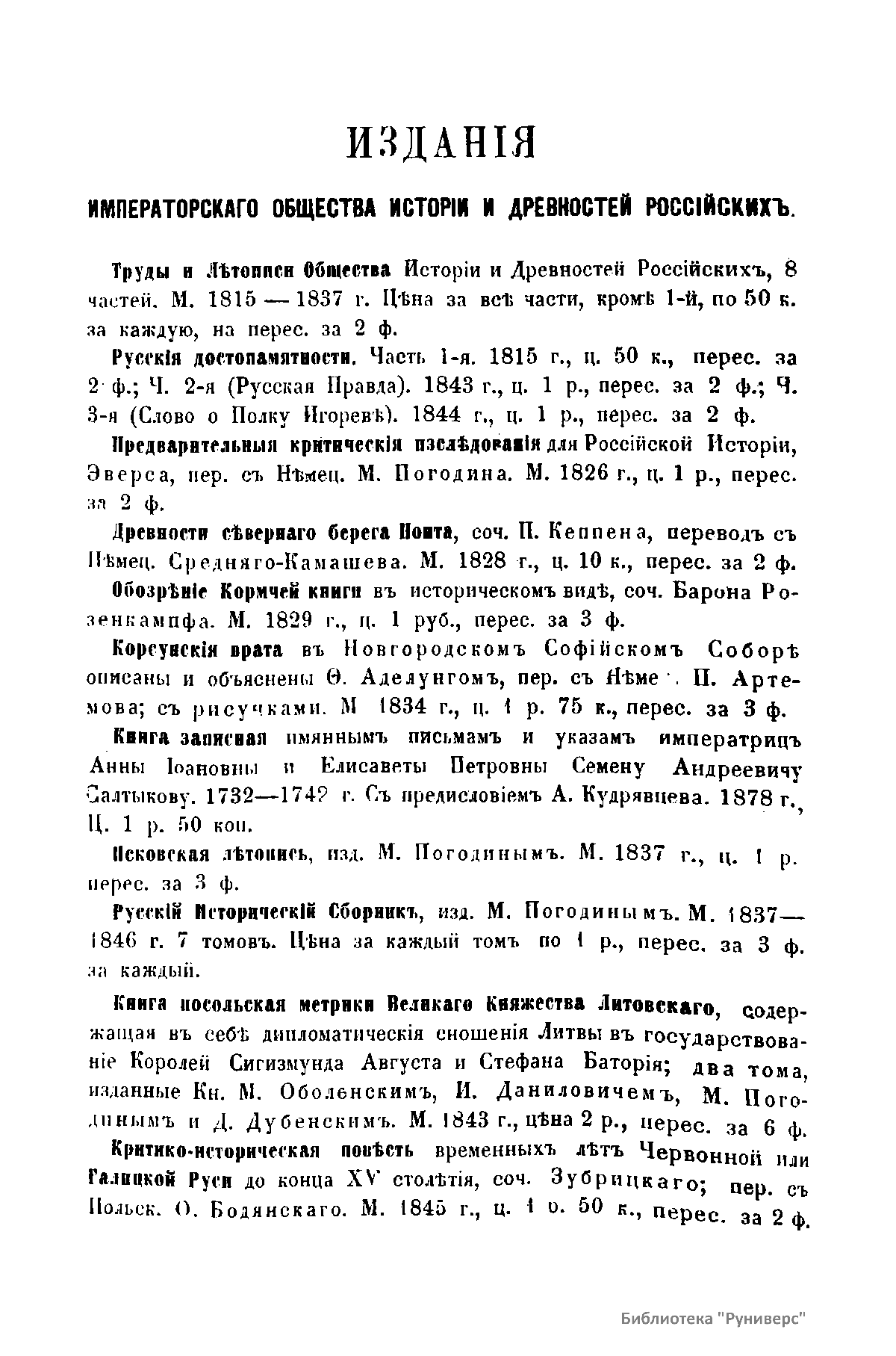 «Чтения в Императорском обществе истории и древностей российских» – периодическое издание трудов Общества. Выпускались отдельными книгами на протяжении 72 лет с десятилетним перерывом. Первая книга вышла в свет в январе 1846 г. Каждая книга состояла из четырех разделов: исторических исследований, отечественных исторических документальных материалов, иностранных материалов и смеси. Публиковались также исследования и материалы по археологии, этнографии, нумизматике, палеографии и другим дисциплинам. До июня 1848 г. было выпущено 23 книги «Чтений». В июньской книге за 1848 г. О. М. Бодянский поместил записки Дж. Флетчера о Московском государстве, что вызвало недовольство Николая I. «Чтения» были закрыты, а Бодянский удален из Московского университета. Издание «Чтений» возобновилось только в 1858 г., когда Бодянский снова стал секретарем общества. Издание приняло славянофильское направление, к прежним четырем разделам «Чтений» прибавился раздел славянских материалов. С 1858 г. «Чтения» выходили в свет четыре раза в год.