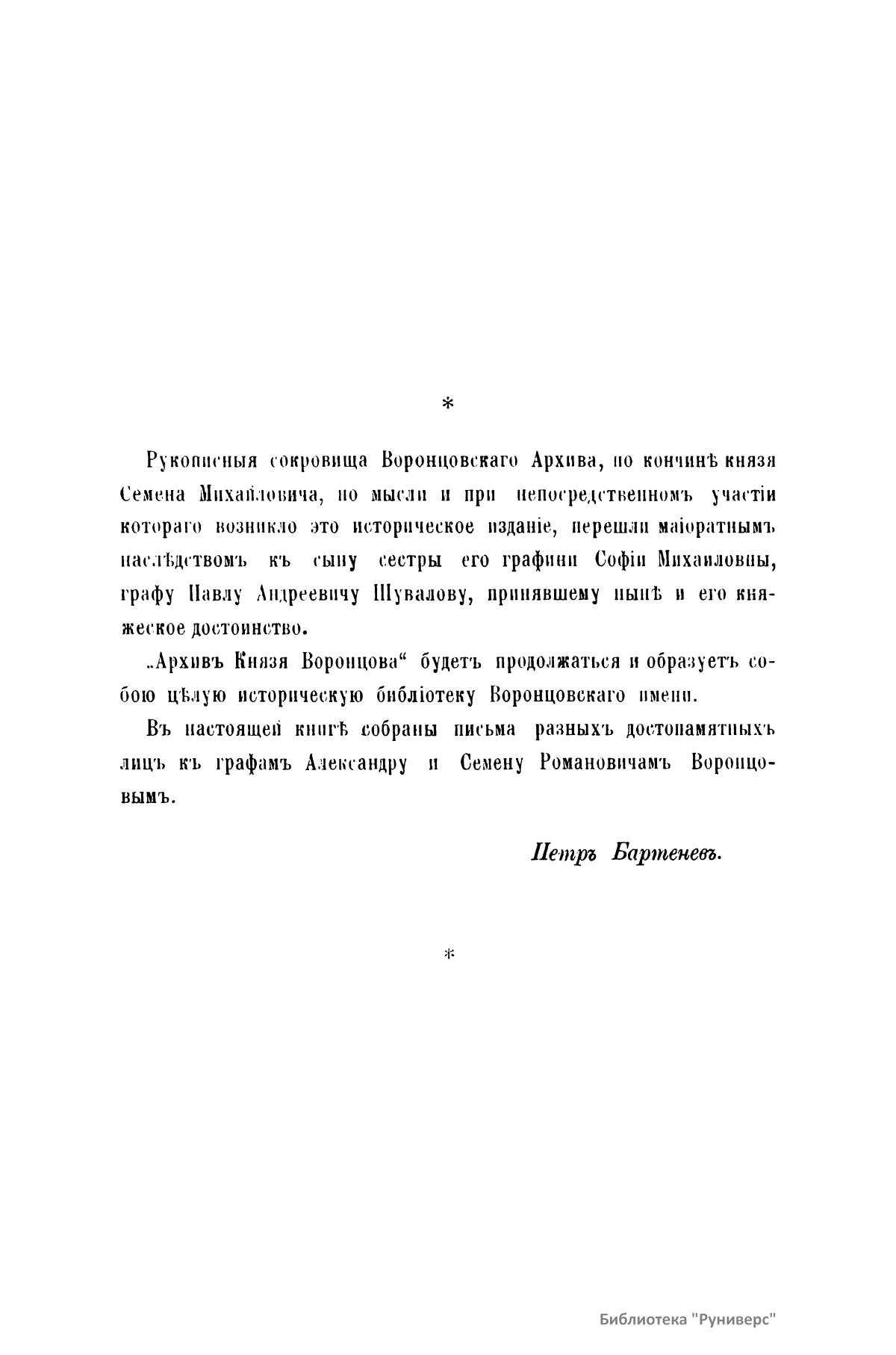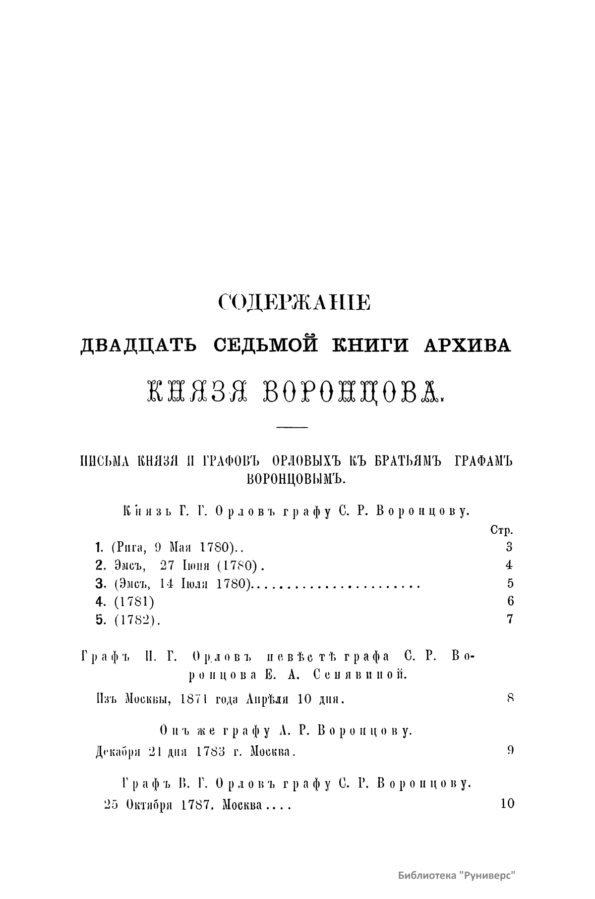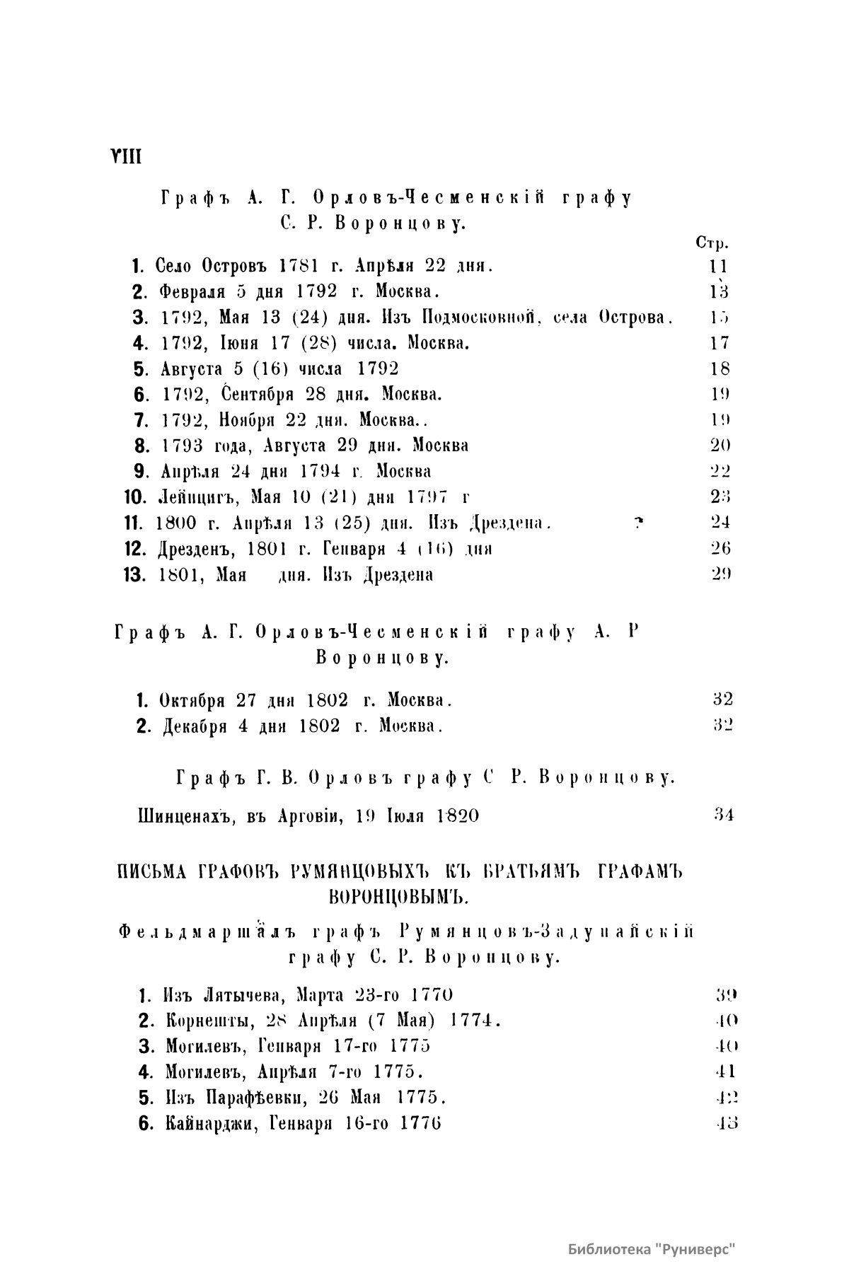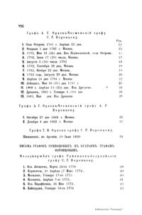 Издание представляет документы из архива графов (с 1845 г. князей) Воронцовых, крупных политических деятелей России XVIII и XIX вв.: Михаила Илларионовича (1714 – 1767) – канцлера при Елизавете Петровне; Романа Илларионовича (1707 – 1783); Александра Романовича (1741 – 1805) – канцлера в 1802 – 1804 гг.; Семена Романовича (1744 – 1832) – посла в Англии в 1785 – 1806 гг.; Михаила Семеновича (1782 – 1856) – фельдмаршала, наместника Кавказа в 1845 – 1853 гг. Архив издан в 40 тт. (1870 – 1895) под редакцией П. И. Бартенева. Содержит огромный материал по внешней политике, по управлению хозяйством Елизаветы Петровны (кн. 1), по делу Миниха и Бирона (кн. 2), о «чумном бунте» 1771 г. в Москве, о движении Е. И. Пугачева (кн. 16), о А. Н. Радищеве (кн. 5, 12, 24). Книга 21-я занята «Записками» Е. Р. Воронцовой (Дашковой). В книге 24-й – свыше 100 писем А. В. Суворова. Среди обширной переписки Воронцовых встречаются письма Вольтера, Д'Аламбера, Жозефа де Местра, Костюшки, Талейрана, Питта и др.