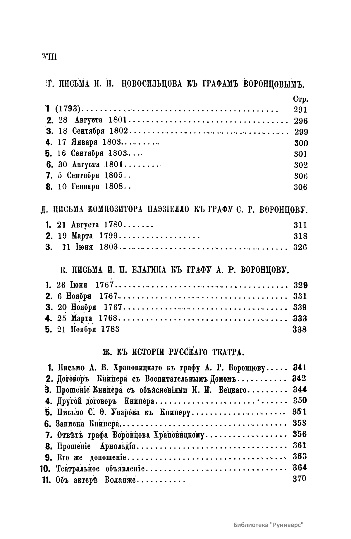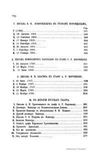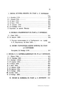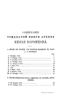 Издание представляет документы из архива графов (с 1845 г. князей) Воронцовых, крупных политических деятелей России XVIII и XIX вв.: Михаила Илларионовича (1714 – 1767) – канцлера при Елизавете Петровне; Романа Илларионовича (1707 – 1783); Александра Романовича (1741 – 1805) – канцлера в 1802 – 1804 гг.; Семена Романовича (1744 – 1832) – посла в Англии в 1785 – 1806 гг.; Михаила Семеновича (1782 – 1856) – фельдмаршала, наместника Кавказа в 1845 – 1853 гг. Архив издан в 40 тт. (1870 – 1895) под редакцией П. И. Бартенева. Содержит огромный материал по внешней политике, по управлению хозяйством Елизаветы Петровны (кн. 1), по делу Миниха и Бирона (кн. 2), о «чумном бунте» 1771 г. в Москве, о движении Е. И. Пугачева (кн. 16), о А. Н. Радищеве (кн. 5, 12, 24). Книга 21-я занята «Записками» Е. Р. Воронцовой (Дашковой). В книге 24-й – свыше 100 писем А. В. Суворова. Среди обширной переписки Воронцовых встречаются письма Вольтера, Д'Аламбера, Жозефа де Местра, Костюшки, Талейрана, Питта и др.