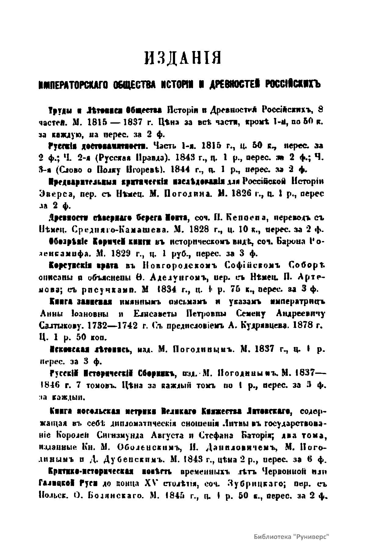 «Чтения в Императорском обществе истории и древностей российских» – периодическое издание трудов Общества. Выпускались отдельными книгами на протяжении 72 лет с десятилетним перерывом. Первая книга вышла в свет в январе 1846 г. Каждая книга состояла из четырех разделов: исторических исследований, отечественных исторических документальных материалов, иностранных материалов и смеси. Публиковались также исследования и материалы по археологии, этнографии, нумизматике, палеографии и другим дисциплинам. До июня 1848 г. было выпущено 23 книги «Чтений». В июньской книге за 1848 г. О. М. Бодянский поместил записки Дж. Флетчера о Московском государстве, что вызвало недовольство Николая I. «Чтения» были закрыты, а Бодянский удален из Московского университета. Издание «Чтений» возобновилось только в 1858 г., когда Бодянский снова стал секретарем общества. Издание приняло славянофильское направление, к прежним четырем разделам «Чтений» прибавился раздел славянских материалов. С 1858 г. «Чтения» выходили в свет четыре раза в год.