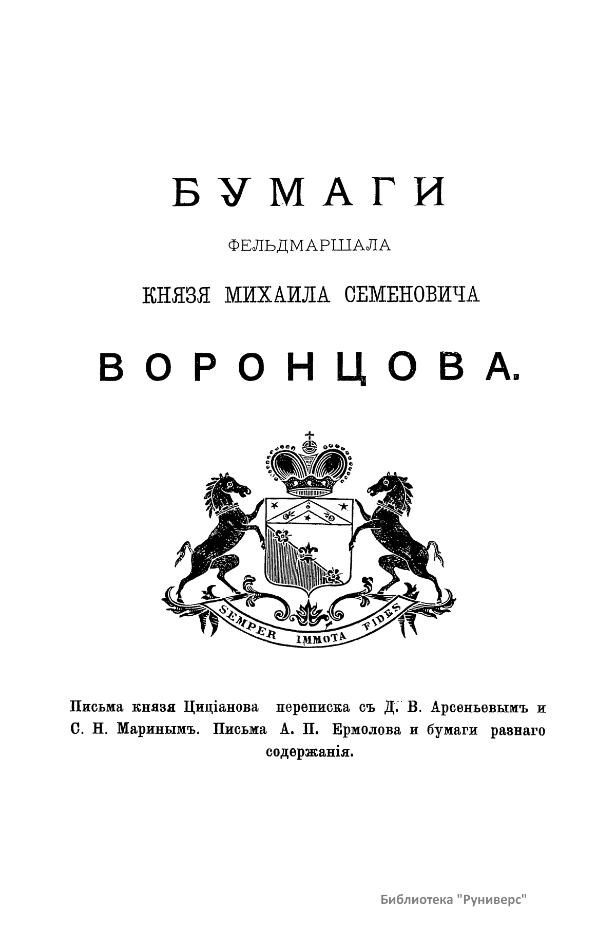 Издание представляет документы из архива графов (с 1845 г. князей) Воронцовых, крупных политических деятелей России XVIII и XIX вв.: Михаила Илларионовича (1714 – 1767) – канцлера при Елизавете Петровне; Романа Илларионовича (1707 – 1783); Александра Романовича (1741 – 1805) – канцлера в 1802 – 1804 гг.; Семена Романовича (1744 – 1832) – посла в Англии в 1785 – 1806 гг.; Михаила Семеновича (1782 – 1856) – фельдмаршала, наместника Кавказа в 1845 – 1853 гг. Архив издан в 40 тт. (1870 – 1895) под редакцией П. И. Бартенева. Содержит огромный материал по внешней политике, по управлению хозяйством Елизаветы Петровны (кн. 1), по делу Миниха и Бирона (кн. 2), о «чумном бунте» 1771 г. в Москве, о движении Е. И. Пугачева (кн. 16), о А. Н. Радищеве (кн. 5, 12, 24). Книга 21-я занята «Записками» Е. Р. Воронцовой (Дашковой). В книге 24-й – свыше 100 писем А. В. Суворова. Среди обширной переписки Воронцовых встречаются письма Вольтера, Д'Аламбера, Жозефа де Местра, Костюшки, Талейрана, Питта и др.