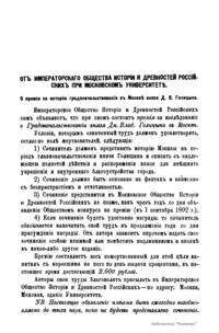 «Чтения в Императорском обществе истории и древностей российских» – периодическое издание трудов Общества. Выпускались отдельными книгами на протяжении 72 лет с десятилетним перерывом. Первая книга вышла в свет в январе 1846 г. Каждая книга состояла из четырех разделов: исторических исследований, отечественных исторических документальных материалов, иностранных материалов и смеси. Публиковались также исследования и материалы по археологии, этнографии, нумизматике, палеографии и другим дисциплинам. До июня 1848 г. было выпущено 23 книги «Чтений». В июньской книге за 1848 г. О. М. Бодянский поместил записки Дж. Флетчера о Московском государстве, что вызвало недовольство Николая I. «Чтения» были закрыты, а Бодянский удален из Московского университета. Издание «Чтений» возобновилось только в 1858 г., когда Бодянский снова стал секретарем общества. Издание приняло славянофильское направление, к прежним четырем разделам «Чтений» прибавился раздел славянских материалов. С 1858 г. «Чтения» выходили в свет четыре раза в год.