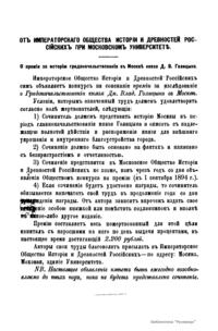 «Чтения в Императорском обществе истории и древностей российских» – периодическое издание трудов Общества. Выпускались отдельными книгами на протяжении 72 лет с десятилетним перерывом. Первая книга вышла в свет в январе 1846 г. Каждая книга состояла из четырех разделов: исторических исследований, отечественных исторических документальных материалов, иностранных материалов и смеси. Публиковались также исследования и материалы по археологии, этнографии, нумизматике, палеографии и другим дисциплинам. До июня 1848 г. было выпущено 23 книги «Чтений». В июньской книге за 1848 г. О. М. Бодянский поместил записки Дж. Флетчера о Московском государстве, что вызвало недовольство Николая I. «Чтения» были закрыты, а Бодянский удален из Московского университета. Издание «Чтений» возобновилось только в 1858 г., когда Бодянский снова стал секретарем общества. Издание приняло славянофильское направление, к прежним четырем разделам «Чтений» прибавился раздел славянских материалов. С 1858 г. «Чтения» выходили в свет четыре раза в год.