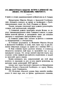 «Чтения в Императорском обществе истории и древностей российских» – периодическое издание трудов Общества. Выпускались отдельными книгами на протяжении 72 лет с десятилетним перерывом. Первая книга вышла в свет в январе 1846 г. Каждая книга состояла из четырех разделов: исторических исследований, отечественных исторических документальных материалов, иностранных материалов и смеси. Публиковались также исследования и материалы по археологии, этнографии, нумизматике, палеографии и другим дисциплинам. До июня 1848 г. было выпущено 23 книги «Чтений». В июньской книге за 1848 г. О. М. Бодянский поместил записки Дж. Флетчера о Московском государстве, что вызвало недовольство Николая I. «Чтения» были закрыты, а Бодянский удален из Московского университета. Издание «Чтений» возобновилось только в 1858 г., когда Бодянский снова стал секретарем общества. Издание приняло славянофильское направление, к прежним четырем разделам «Чтений» прибавился раздел славянских материалов. С 1858 г. «Чтения» выходили в свет четыре раза в год.