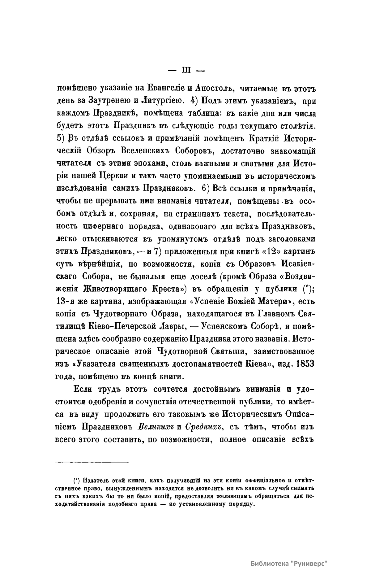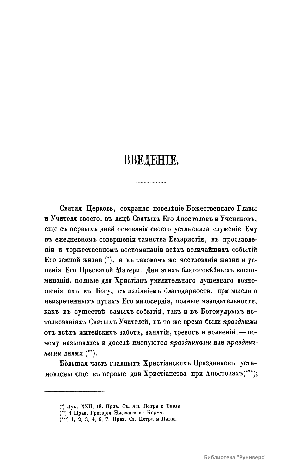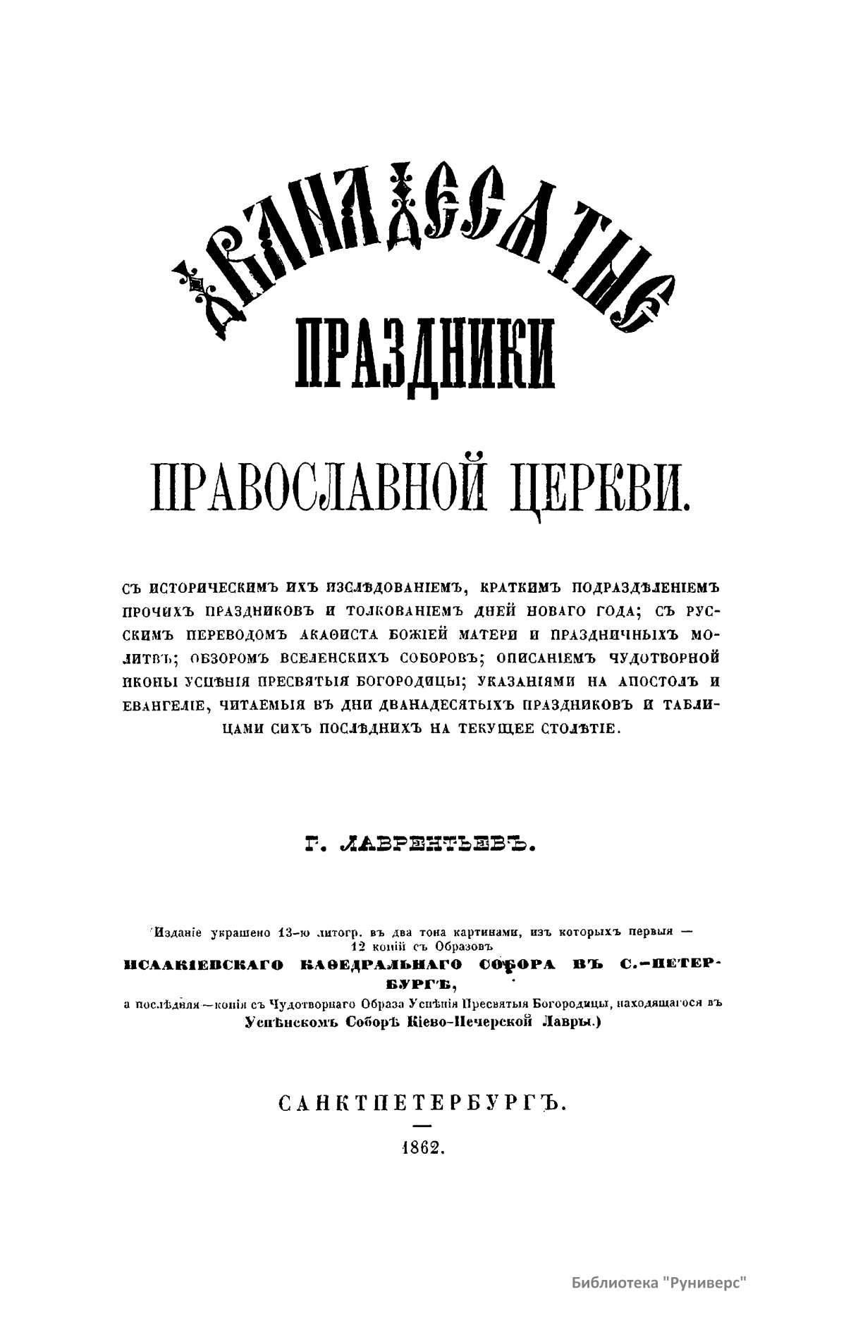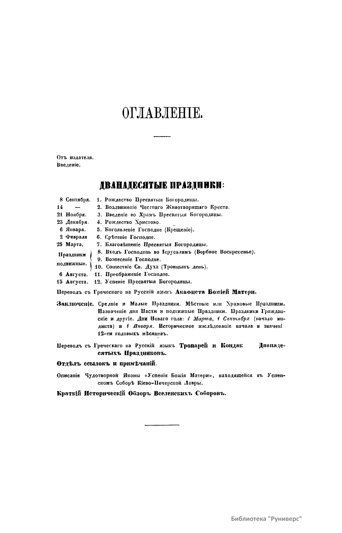 Книга посвящена двенадцати праздникам православной церкви: Рождество Пресвятой Богородицы (8 сентября ст. ст.); Воздвижение (14 сентября ст. ст.); Введение во храм Пресвятой Богородицы (21 ноября ст. ст.); Рождество Христово (25 декабря ст. ст.); Богоявление Господне (Крещение) (6 января ст. ст.); Сретение Господне (2 февраля ст. ст.); Благовещение Пресвятой Богородицы (25 марта ст. ст.); Вход господень в Иерусалим (Вербное воскресенье) (подвижный праздник); Вознесение Господне (подвижный праздник); Сошествие Святого Духа (Троицын день) (подвижный праздник); Преображение Господне (6 августа ст. ст.); Успение Пресвятой Богородицы (15 августа ст. ст.). Автор дает полные сведения о содержании каждого праздника, его историческом происхождении и религиозном достоинстве. К описанию каждого праздника присоединены песнопения: тропарь, кондак и величание. После праздника «Успение Пресвятой Богородицы» помещен перевод на русский язык акафиста Божией Матери, который обычно читается на Богородичных молебнах. В отделе ссылок и примечаний находится краткий исторический обзор Вселенских соборов. Издание украшено 13 литографиями.