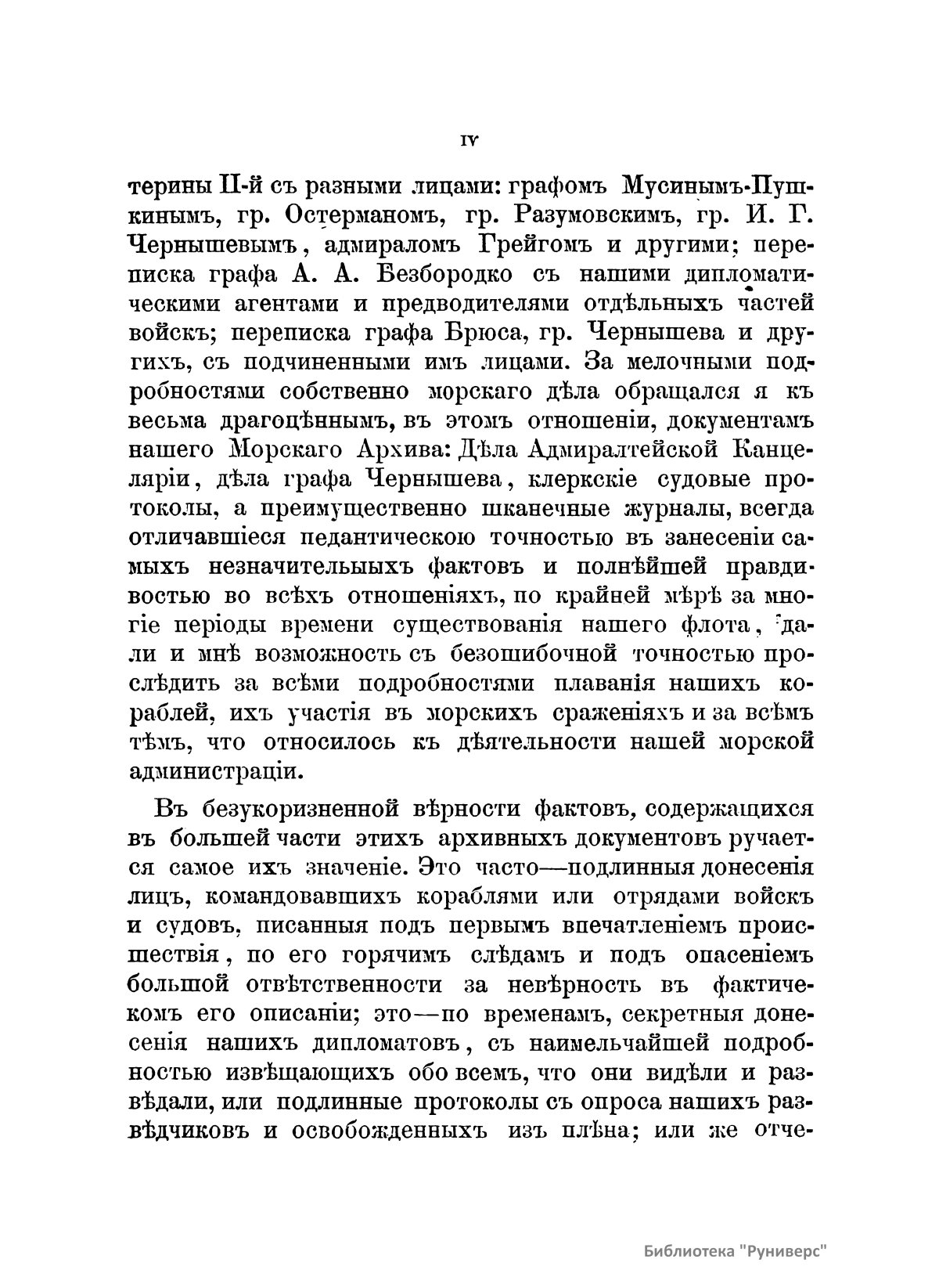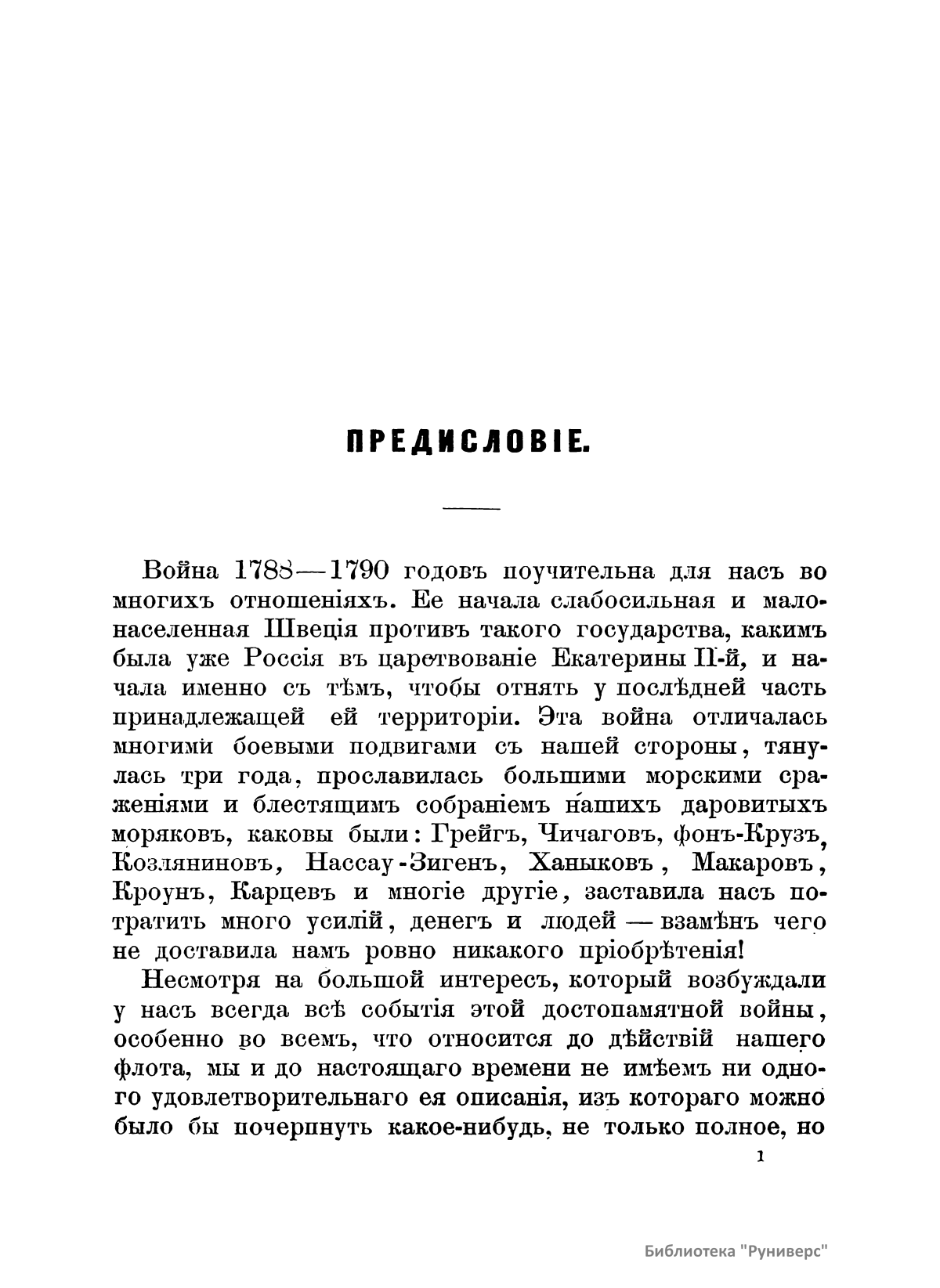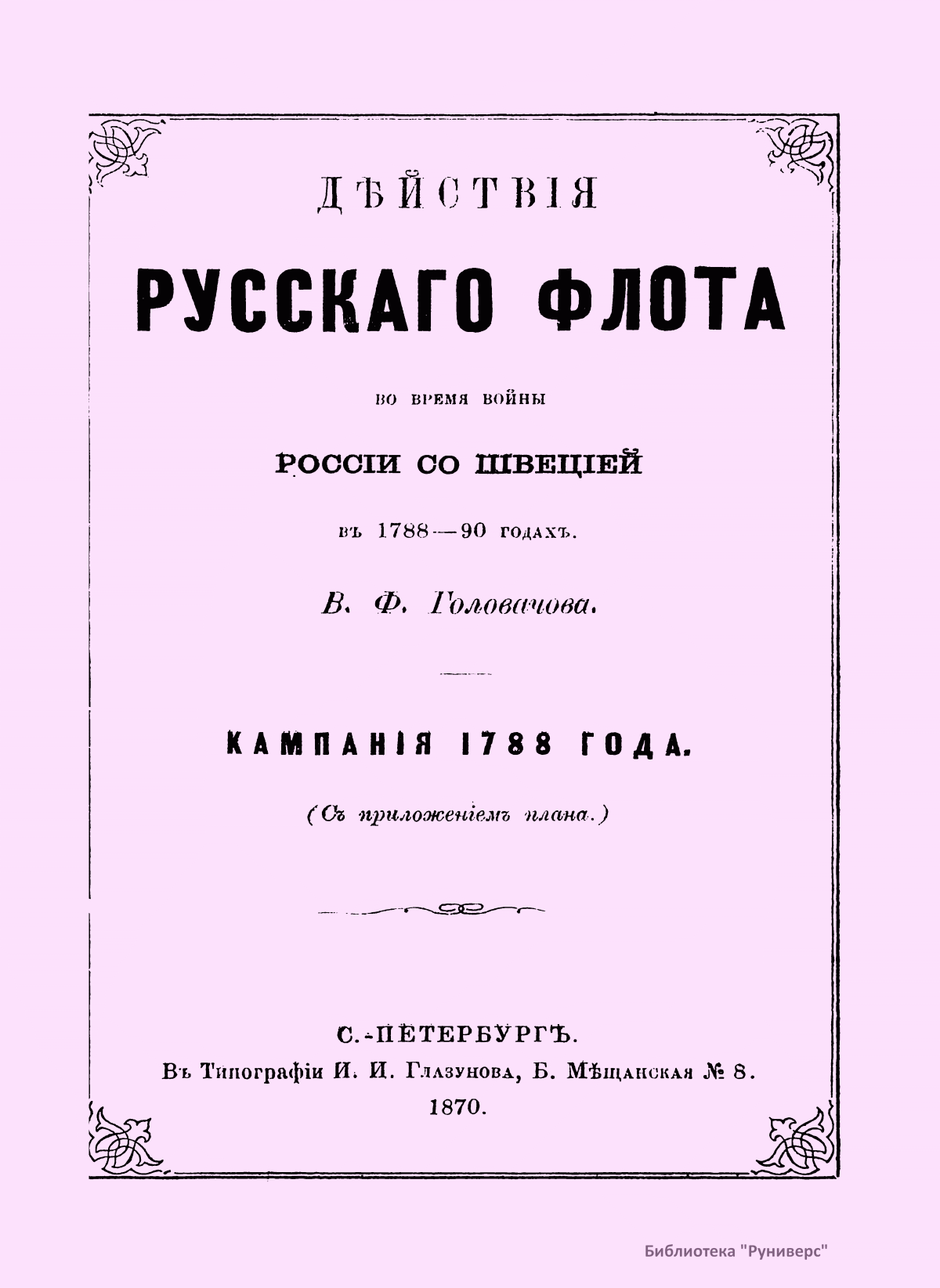 Русско-шведская война 1788 – 1790 гг. – попытка Швеции вернуть владения в Прибалтике. Русский флот победил в Гогландском (1788) и Выборгском (1790) сражениях. Шведы неудачно провели наступление в Финляндии. Война завершилась Верельским миром 1790 г. «Эта война отличалась многими боевыми подвигами с нашей стороны, тянулась три года, прославилась большими морскими сражениями и блестящим собранием наших даровитых моряков, каковы были: Грейг, Чичагов, фон-Круз, Козлянинов, Нассау-Зиген, Ханыков, Макаров, Кроун, Карцев и многие другие, – заставила нас потратить много усилий, денег и людей, взамен чего не доставила нам ровно никакого приобретения». Книга (с приложением плана) посвящена кампании 1788 г. Автор использовал документы Государственного архива и Архива министерства иностранных дел (переписка Екатерины II с разными лицами; переписка графа А.А. Безбородко с русскими дипломатическими агентами и предводителями отдельных частей войск); документы Морского архива (дела Адмиралтейской канцелярии, дела графа Чернышева, клеркские судовые протоколы – преимущественно шканечные журналы). Автор часто прибегает к подлинному тексту самих документов, так как это «живой современный разговор, часто незаменимый никаким красноречивым изложением историка».