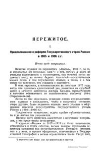Автор вспоминает о своем участии в обсуждении проектов переустройства государственного уклада России 1905 – 1906 гг. В первый выпуск очерка вошли: петергофское совещание в июле 1906 г. о проекте Государственной думы; первое царскосельское совещание по пересмотру избирательного права на основании манифеста 17 октября 1905 г.; комиссия грфа Сольского об изменении учреждения Государственного совета в 1905 г.; второе царскосельское совещание по пересмотру высших законодательных учреждений в феврале 1906 г.; третье царскосельское совещание по реформе основных законов при графе Витте.
