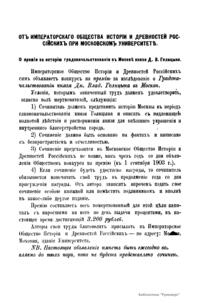 «Чтения в Императорском обществе истории и древностей российских» – периодическое издание трудов Общества. Выпускались отдельными книгами на протяжении 72 лет с десятилетним перерывом. Первая книга вышла в свет в январе 1846 г. Каждая книга состояла из четырех разделов: исторических исследований, отечественных исторических документальных материалов, иностранных материалов и смеси. Публиковались также исследования и материалы по археологии, этнографии, нумизматике, палеографии и другим дисциплинам. До июня 1848 г. было выпущено 23 книги «Чтений». В июньской книге за 1848 г. О. М. Бодянский поместил записки Дж. Флетчера о Московском государстве, что вызвало недовольство Николая I. «Чтения» были закрыты, а Бодянский удален из Московского университета. Издание «Чтений» возобновилось только в 1858 г., когда Бодянский снова стал секретарем общества. Издание приняло славянофильское направление, к прежним четырем разделам «Чтений» прибавился раздел славянских материалов. С 1858 г. «Чтения» выходили в свет четыре раза в год.