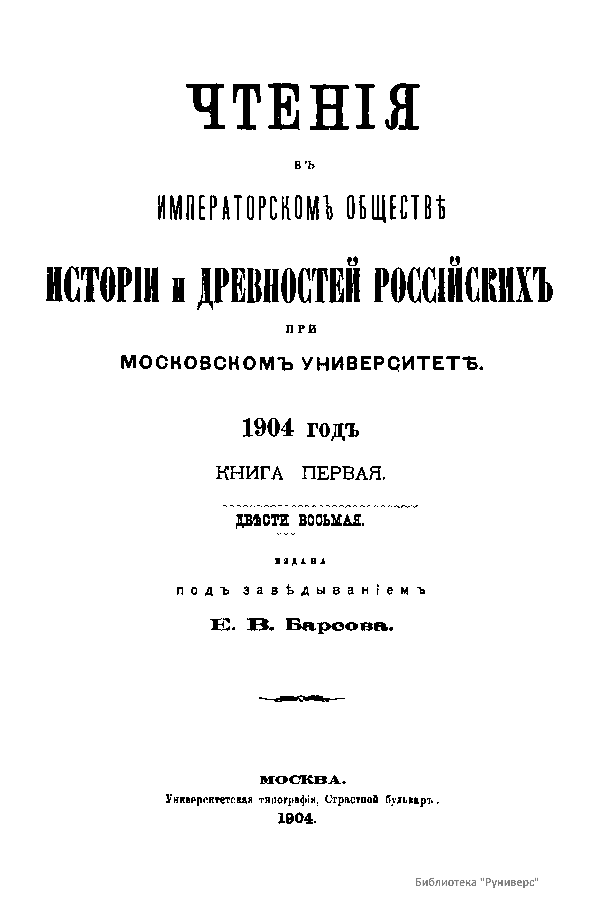 Чтенiя въ Императорскомъ Обществѣ Исторiи и Древностей Россiйскихъ при Московскомъ Университетѣ. 1904 годъ. Книга первая