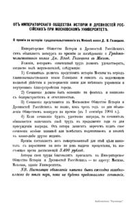 «Чтения в Императорском обществе истории и древностей российских» – периодическое издание трудов Общества. Выпускались отдельными книгами на протяжении 72 лет с десятилетним перерывом. Первая книга вышла в свет в январе 1846 г. Каждая книга состояла из четырех разделов: исторических исследований, отечественных исторических документальных материалов, иностранных материалов и смеси. Публиковались также исследования и материалы по археологии, этнографии, нумизматике, палеографии и другим дисциплинам. До июня 1848 г. было выпущено 23 книги «Чтений». В июньской книге за 1848 г. О. М. Бодянский поместил записки Дж. Флетчера о Московском государстве, что вызвало недовольство Николая I. «Чтения» были закрыты, а Бодянский удален из Московского университета. Издание «Чтений» возобновилось только в 1858 г., когда Бодянский снова стал секретарем общества. Издание приняло славянофильское направление, к прежним четырем разделам «Чтений» прибавился раздел славянских материалов. С 1858 г. «Чтения» выходили в свет четыре раза в год.