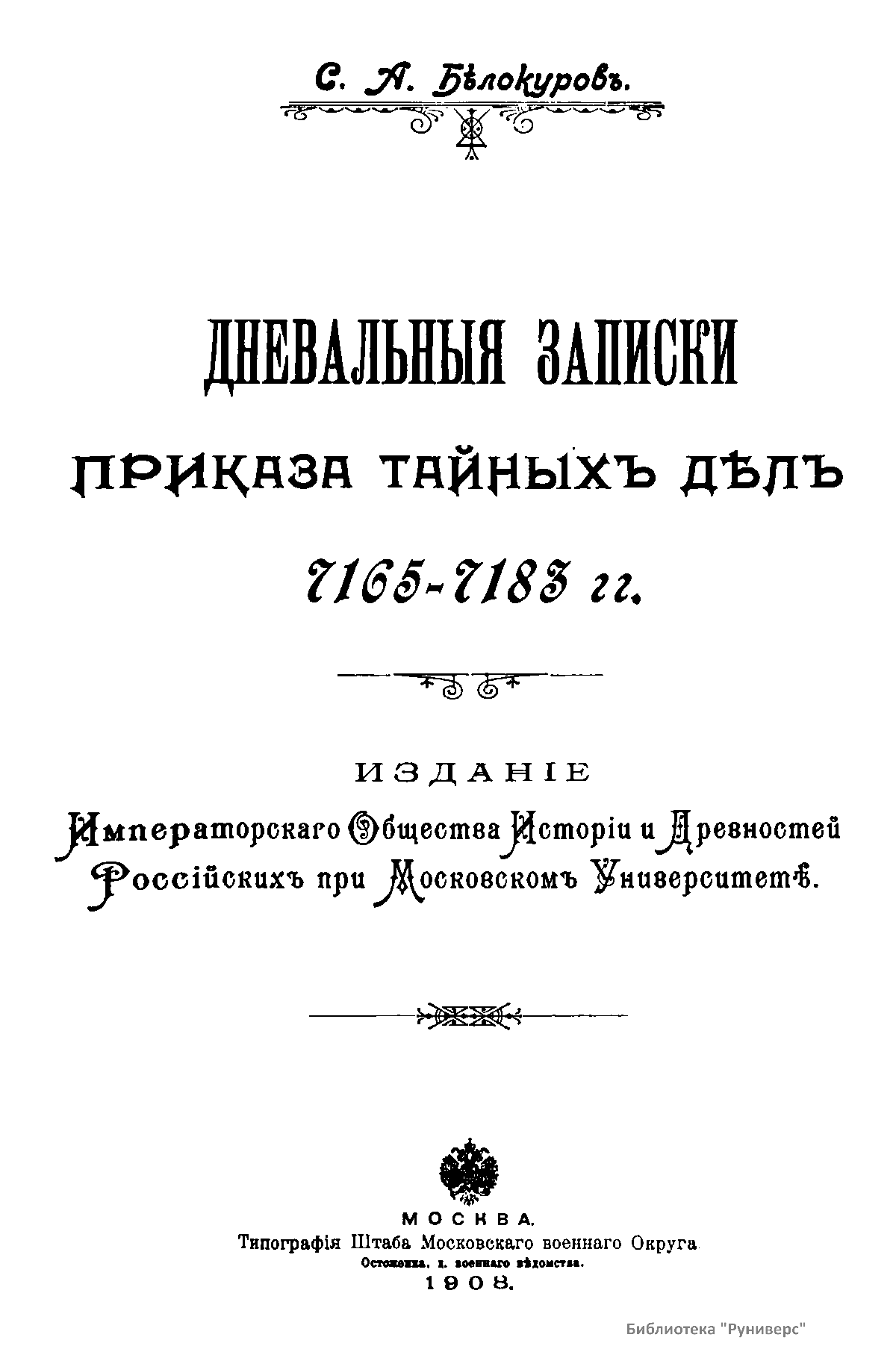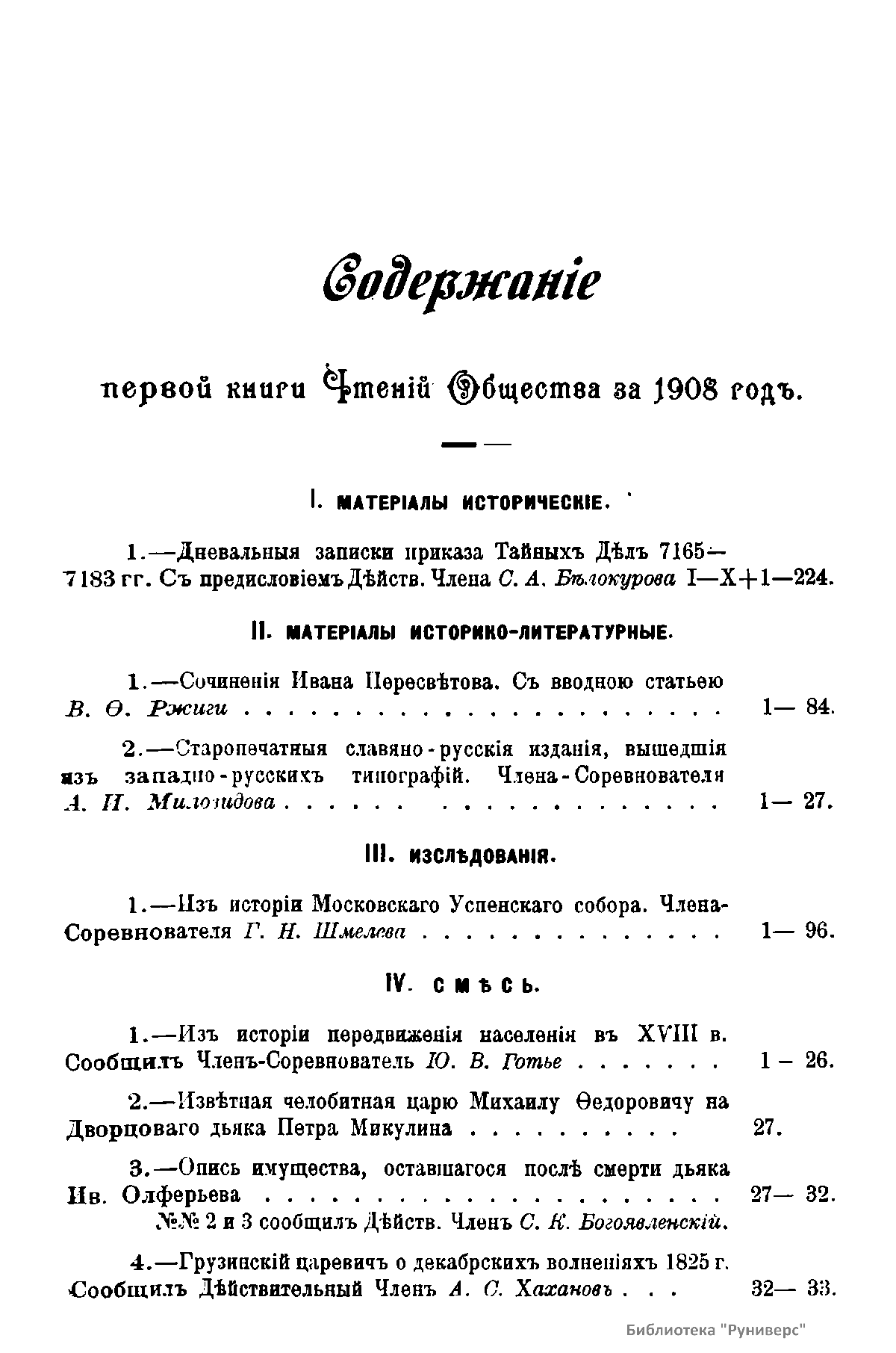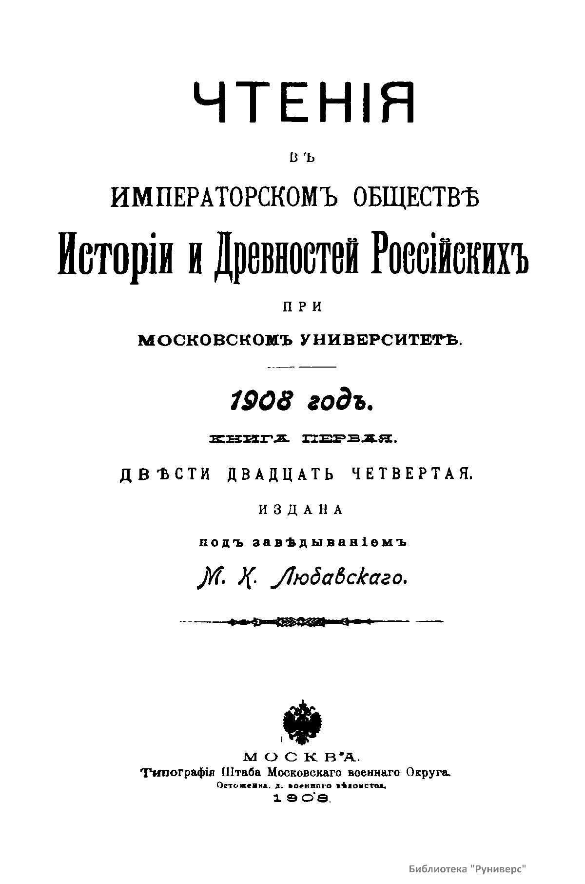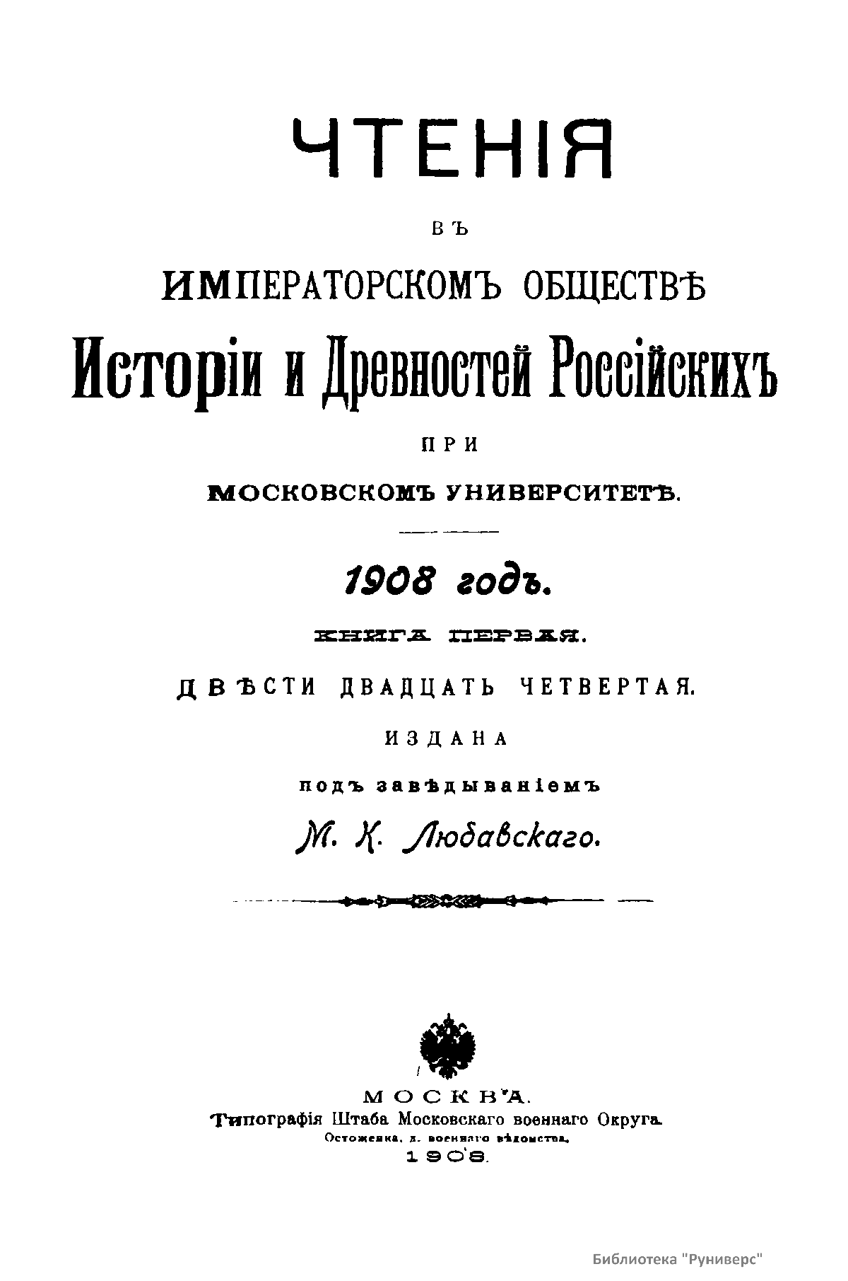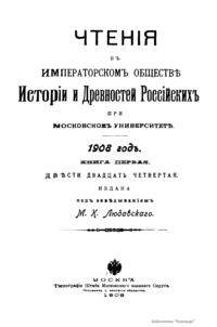 Чтенiя въ императорскомъ обществѣ Исторiи и Древностей Россiйских при Московском Университетѣ. 1908 годъ. Книга первая