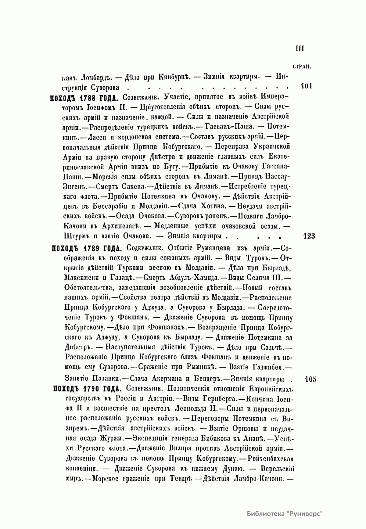 В настоящем сочинении подробно описаны две русско-турецкие войны в царствование императрицы Екатерины II (1769 – 1774; 1787 – 1791). К изданию прилагаются: карта пространства, служившего главным театром описанных войн; планы сражений при Кагуле и Рымнике; план Измаильского штурма. Потемкин Григорий Александрович (1739 – 1791) – русский государственный и военный деятель, генерал-фельдмаршал, организатор дворцового переворота 1762 г., фаворит и ближайший помощник Екатерины II. Способствовал освоению Северного Причерноморья, руководил строительством Черноморского флота. После присоединения Крыма получил титул светлейшего князя Таврического. Главнокомандующий русской армией в русско-турецкой войне 1787 – 1791 гг. Румянцев-Задунайский Петр Александрович (1725 – 1796) – граф (1744), русский полководец, генерал-фельдмаршал (1770). В Семилетней войне овладел крепостью Кольберг (Колобжег). С 1764 г. – президент Малороссийской коллегии. В русско-турецкой войне 1768 – 1774 гг. одержал победы при Рябой Могиле, Ларге и Кагуле (1770). Впервые применил сочетание каре, колонн и легких батальонов, положив начало зарождению новой тактики колонн и рассыпного строя. Имеет военно-теоретические работы. Суворов Александр Васильевич (1729 или 1730 – 1800), граф Рымникский (1789), князь Италийский (1799), русский полководец, генералиссимус (1799). Начал службу капралом в 1748 г. Участник семилетней войны. Во время русско-турецких войн (1749 – 1774, 1787 – 1791) одержал победы при Козлудже (1774), Кинбурне (1787), Фокшанах (1789), Рымнике (1789) и штурмом овладел крепостью Измаил (1790). При императоре Павле I в опале. В 1799 г. блестяще провел Итальянский и Швейцарские походы, разбив французские войска на рр. Адда и Требия и при Нови, а затем перешел швейцарские Альпы и вышел из окружения. Автор военно-теоретических работ. Создал оригинальную и прогрессивную систему взглядов на способы ведения войны и боя, воспитания и обучения войск, во многом опередив свое время. Стратегия Суворова носила наступательный характер, ставила главной задачей полный разгром противника в полевом сражении. Развил тактику колонн и рассыпного строя. Не проиграл ни одного сражения.