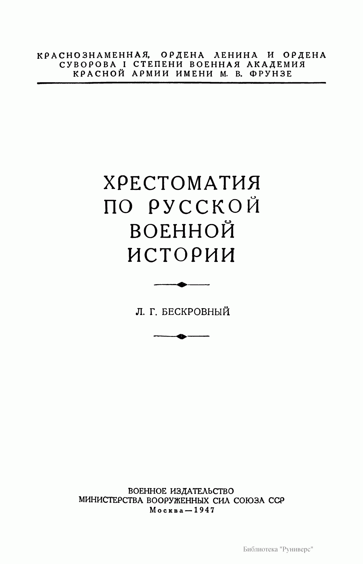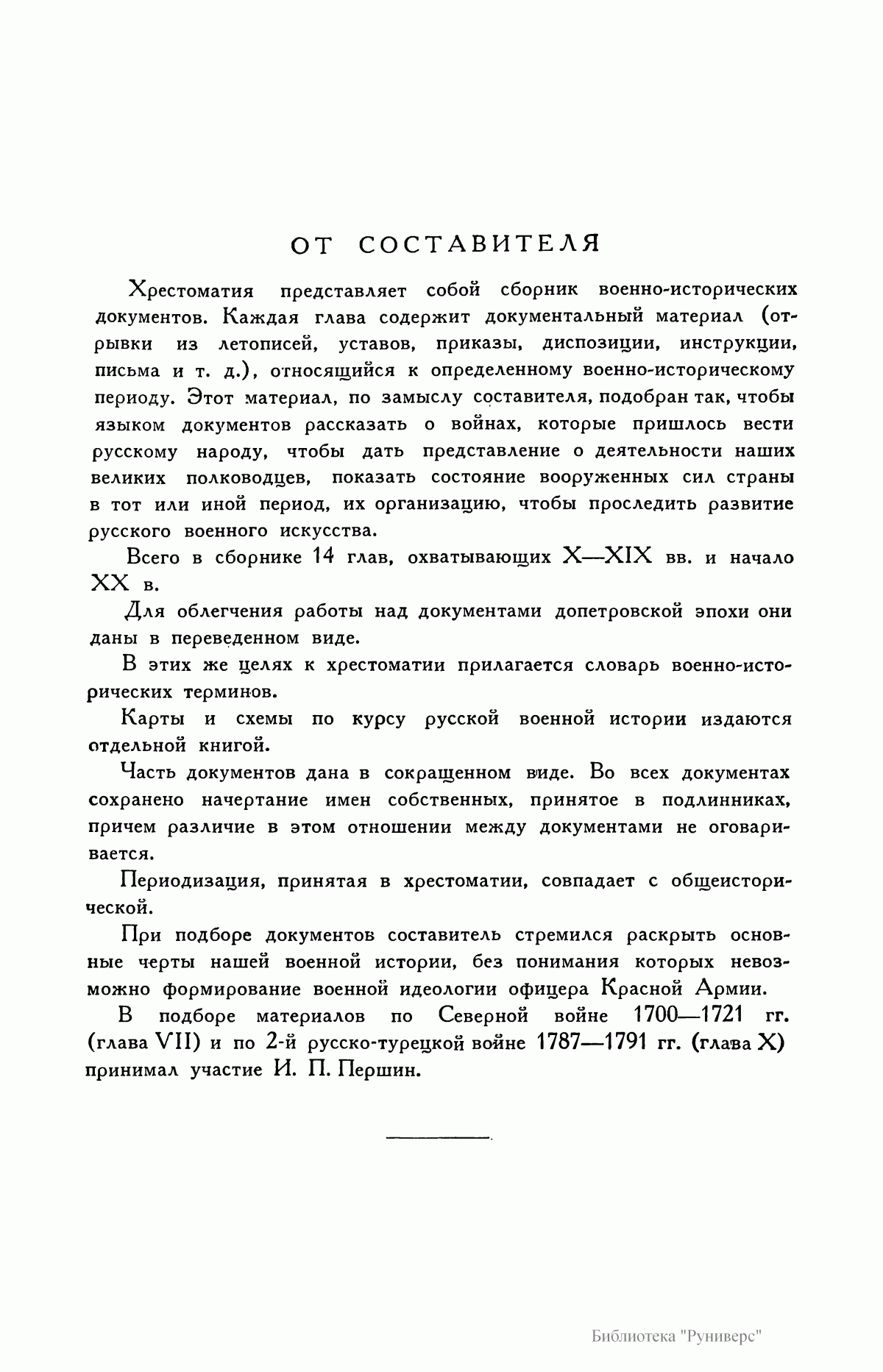 Хрестоматия представляет собой сборник военно-исторических документов. Каждая глава содержит документальный материал (отрывки из летописей, уставов, приказы, диспозиции, инструкции, письма и т.д.), относящиеся к определенному военно-историческому периоду. Этот материал, по замыслу составителя, подобран так, чтобы языком документов рассказать о войнах, которые пришлось вести русскому народу, чтобы дать представление о деятельности наших великих полководцев, показать состояние вооруженных сил страны в тот или иной период, их организацию, чтобы проследить развитие русского военного искусства. Всего в сборнике 14 глав, охватывающих X-XIX вв. и начало XX в. Для облегчения работы над документами допетровской эпохи они даны в переведенном виде. В этих целях к хрестоматии прилагается словарь военно-исторических терминов. Карты и схемы пл курсу русской военной истории издаются отдельной книгой. Часть документов дана в сокращенном виде. Во всех документах сохранено начертание имен собственных, принятое в подлинниках, причем различие в этом отношении между документами не оговаривается. Периодизация, принятая в хрестоматии, совпадает с общеисторической. При подборе документов составитель стремился раскрыть основные черты нашей военной истории, без понимания которых невозможно формирование военной идеологии офицера Красной Армии. В подборе материалов по Северной войне 1700-1721 гг. (глава VII) и по 2-й русско-турецкой войне 1787-1791 гг. (глава X) принимал участие И.П. Першин.