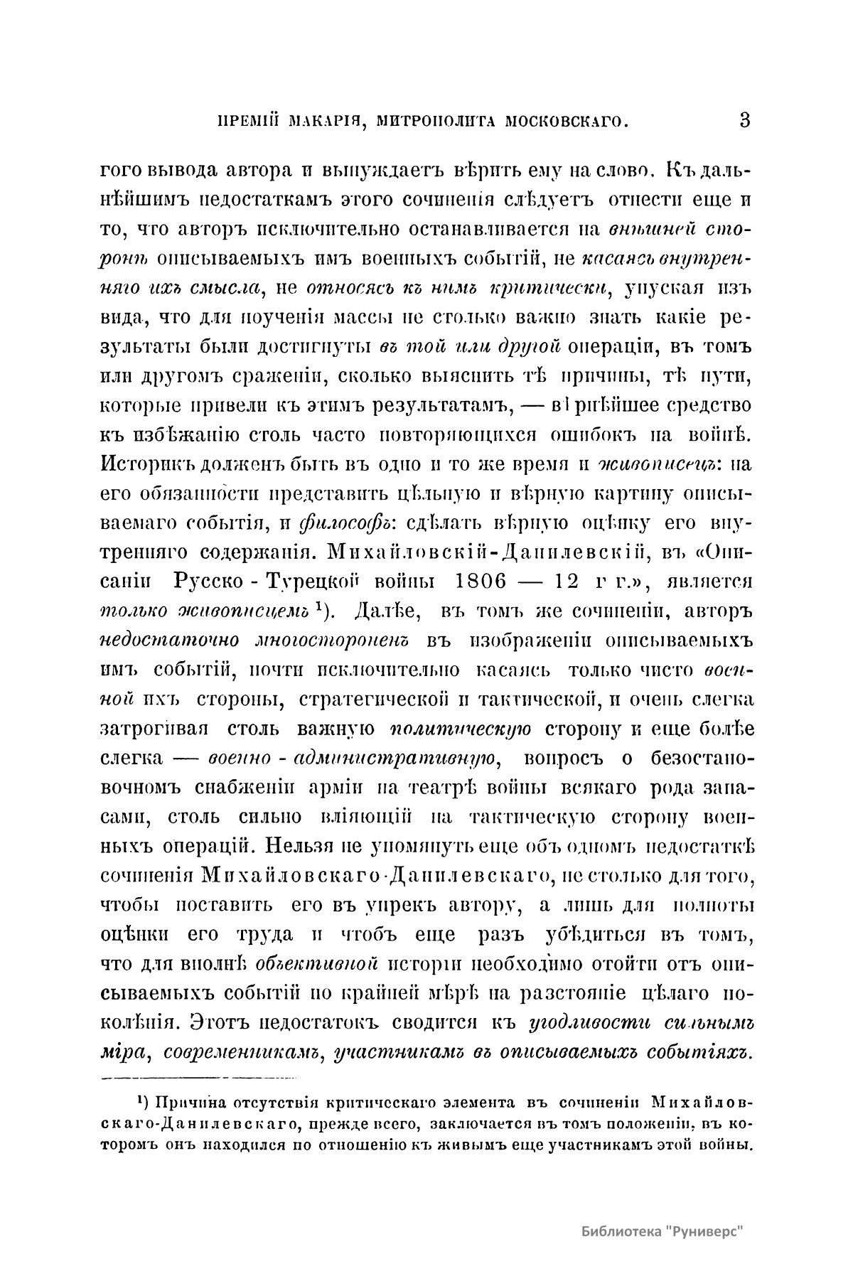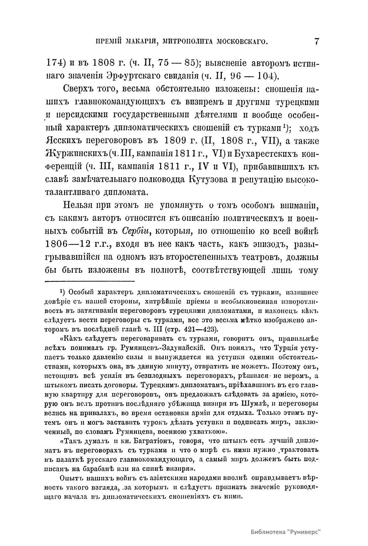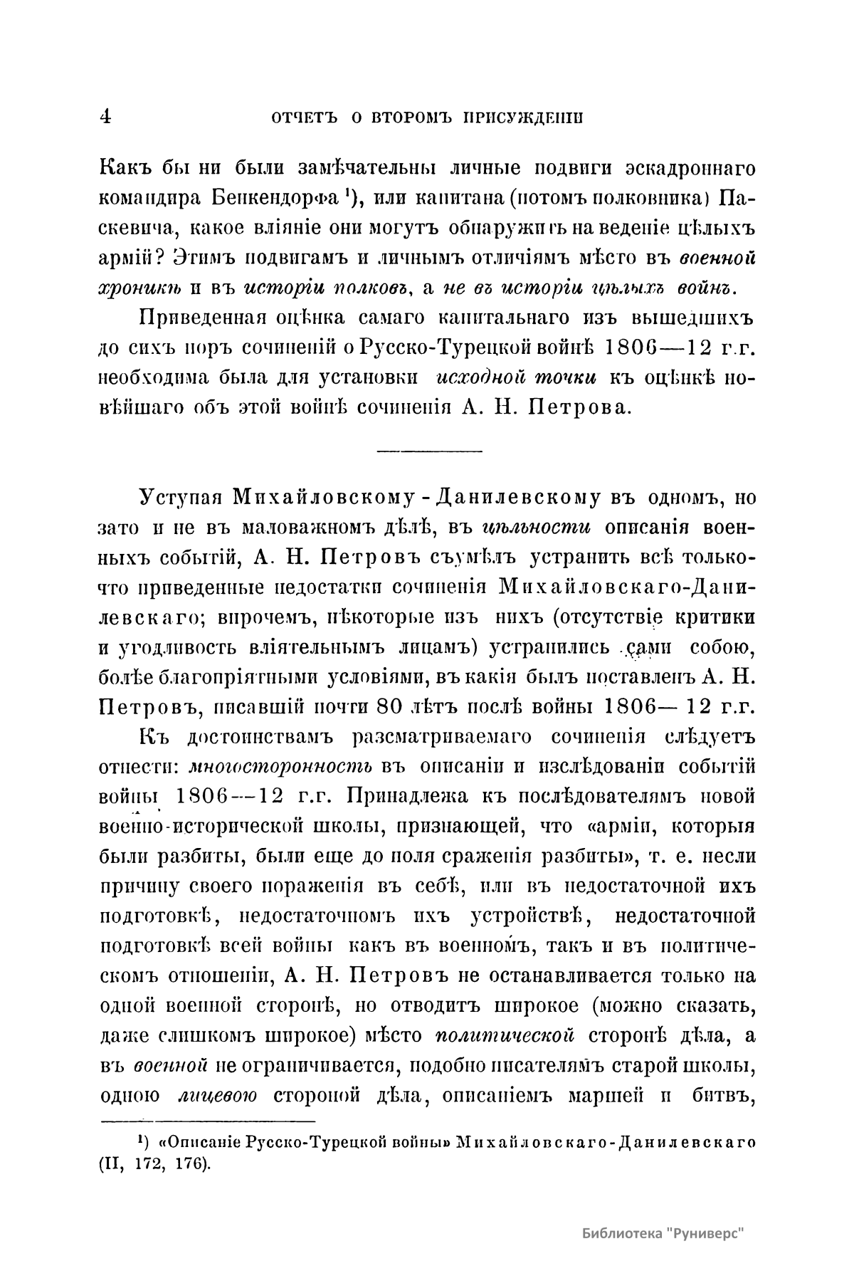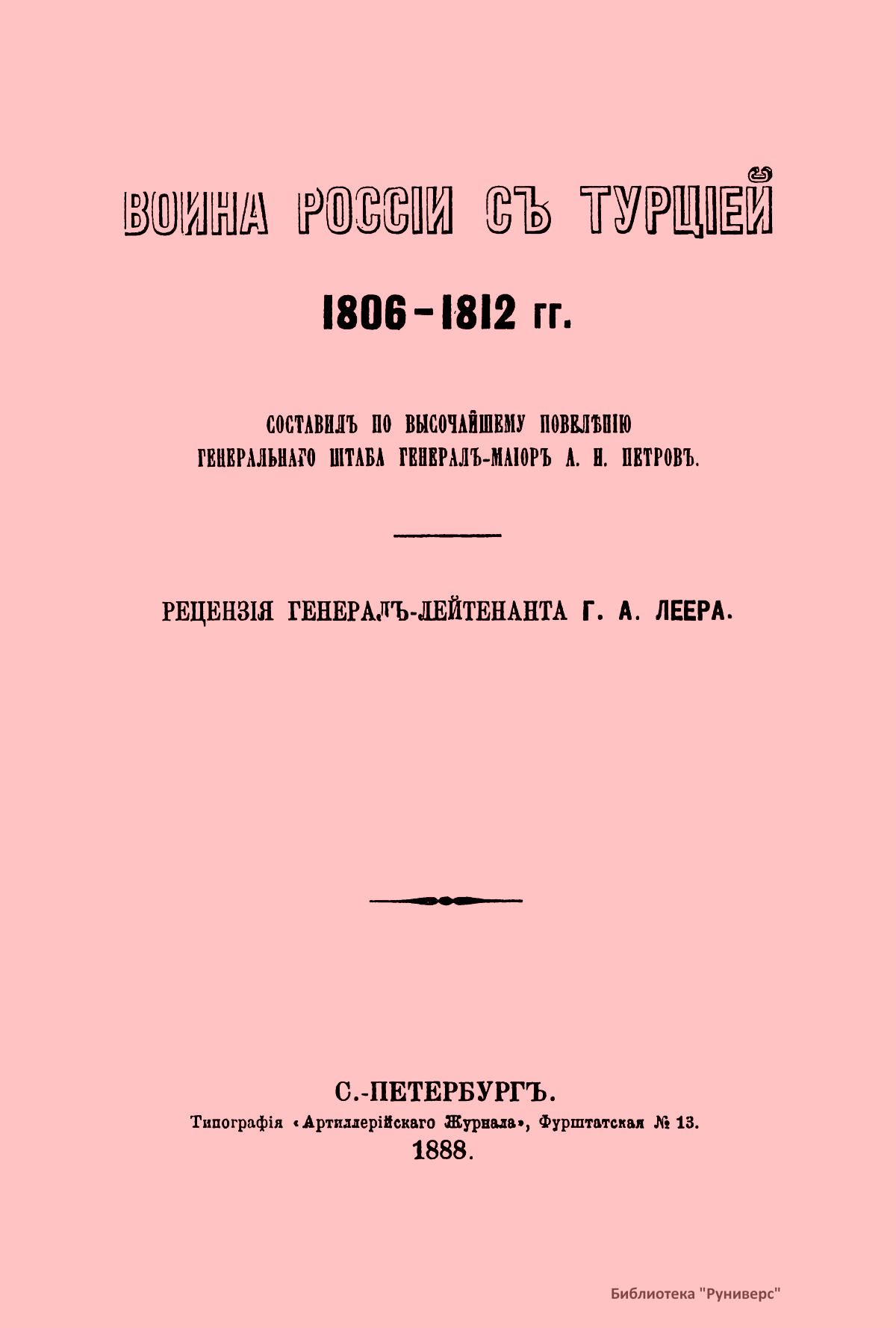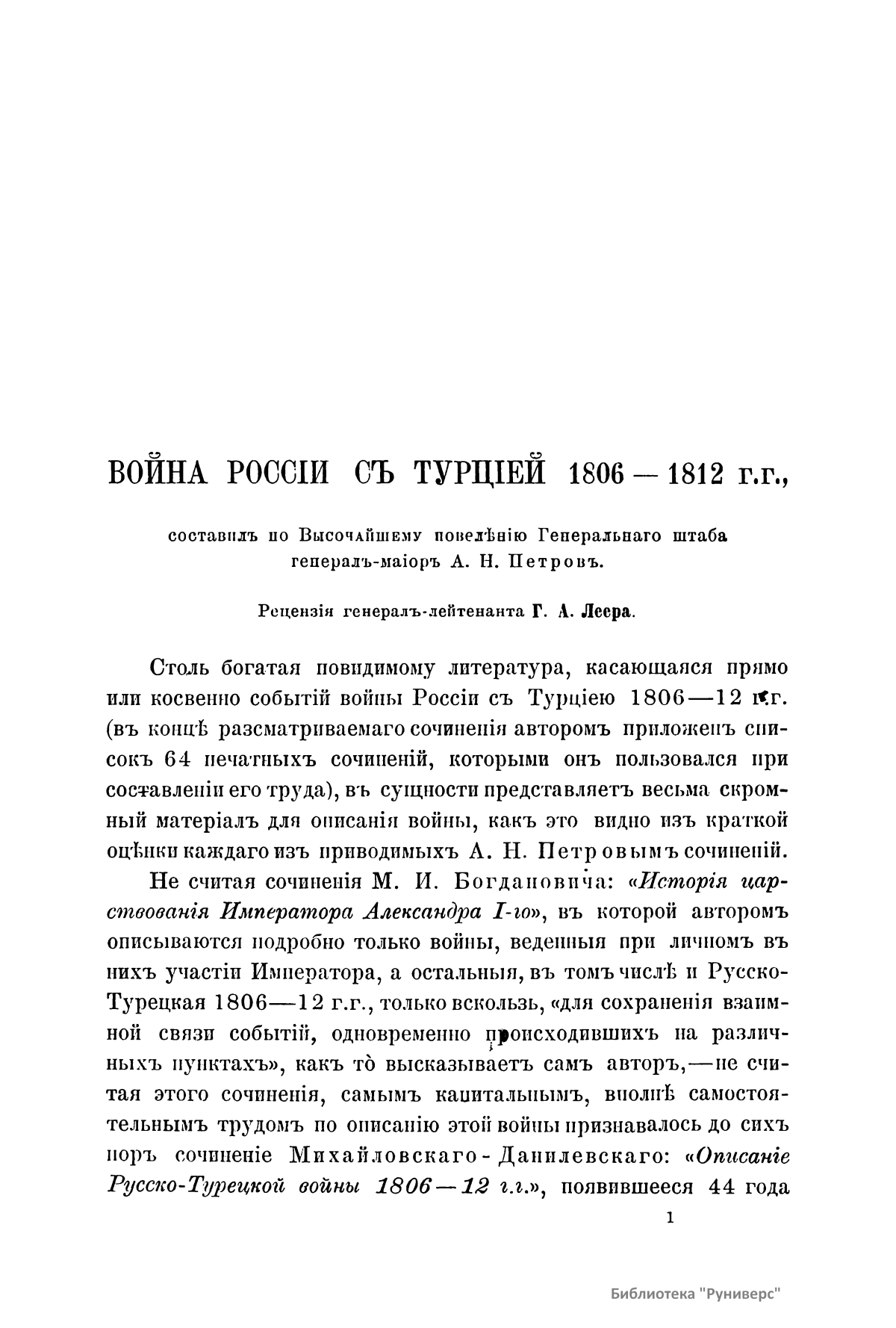 Настоящая публикация – обстоятельная рецензия генерал-лейтенанта Г. А. Леера на фундаментальное сочинение А. Н. Петрова «Война России с Турцией с 1806 по 1812 г.» (1885 – 1887) в сопоставлении с трудом А. И. Михайловского-Данилевского «Описание русско-турецкой войны 1806 – 1812 гг.» (1843). Рецензент считает, что данное сочинение является весьма ценным вкладом в литературу русско-турецких войн, исследованию которых автор посвятил 27-летний в высшей степени добросовестный труд, и просит удостоить его одной из премий митрополита Макария. Русско-турецкая война 1806 – 1812 гг. начата Турцией с целью возврата бывших владений в Северном Причерноморье и на Кавказе. Победы русских войск и дипломатическое искусство М. И. Кутузова привели к Бухарестскому миру 1812 г.