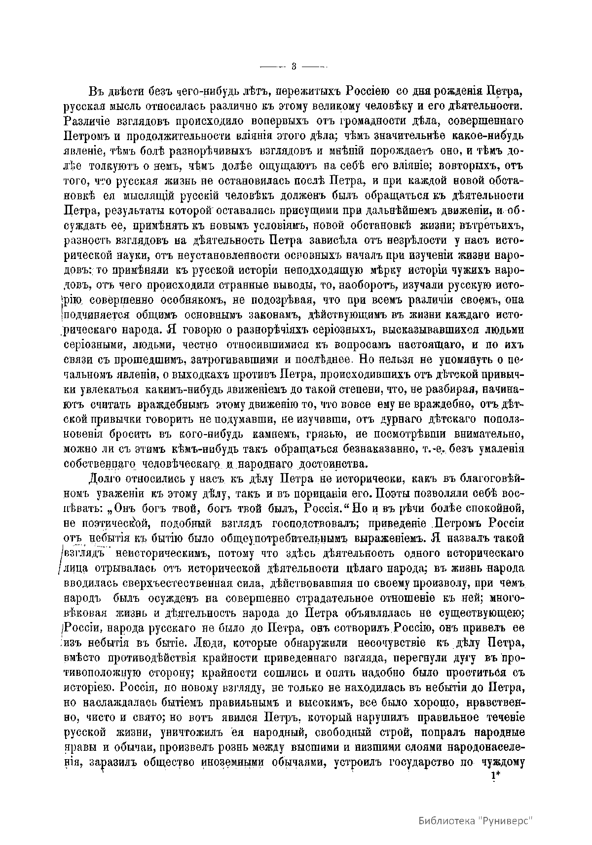 Двенадцать лекций о Петре Великом, посвященные 200-летию со дня его рождения. «Можно ли в кратком очерке обозначить деятельность небывалую в истории человечества? Нужно было обозначить деятельность человека, который прибавил в историю целый великий народ, целое великое племя, деятельность человека, который имел полное право сказать, что не жалел ничего для своего народа, который сильной рукой помог своему народу совершить переход необходимый, но страшно трудный, какого ни один народ не совершал при таких неблагоприятных обстоятельствах».
