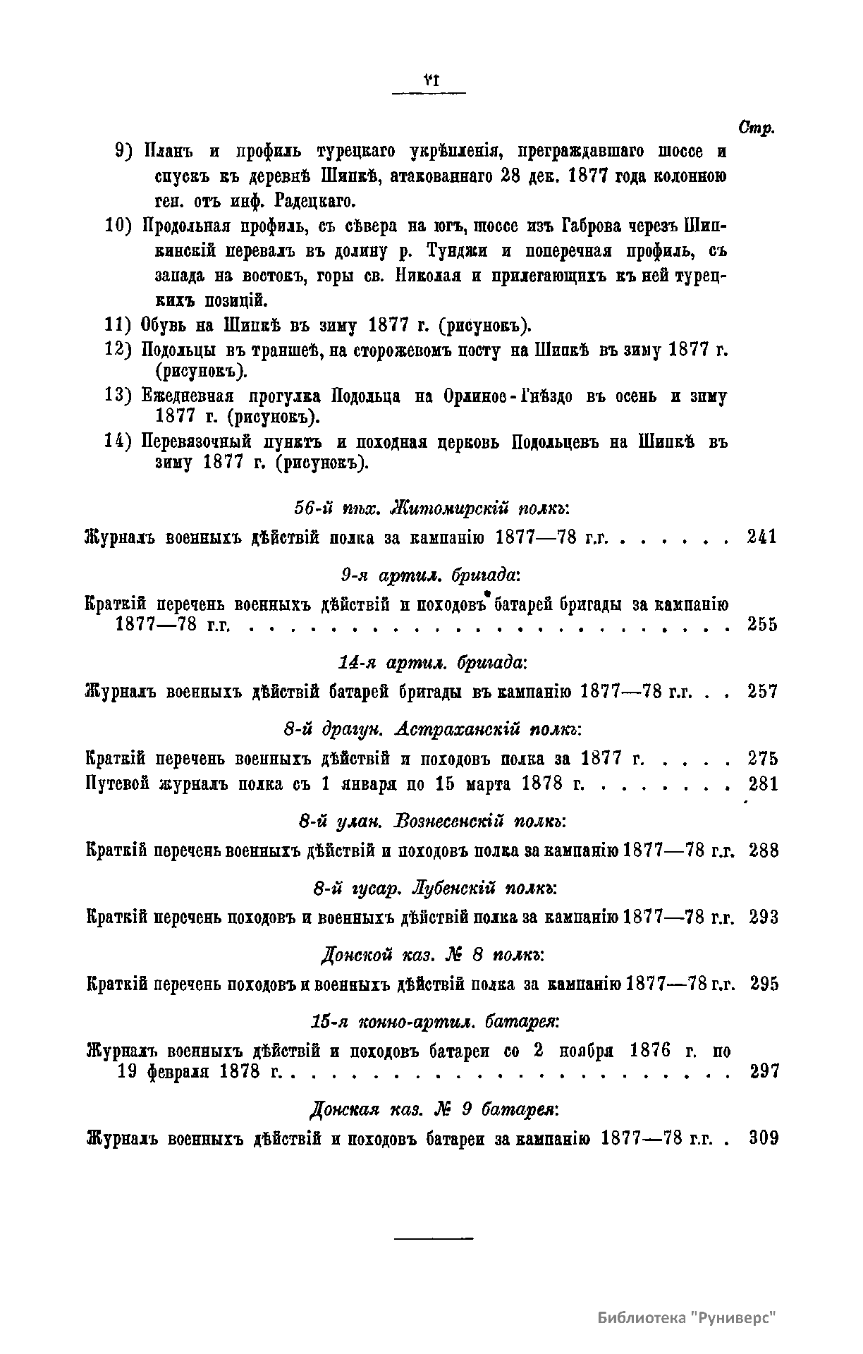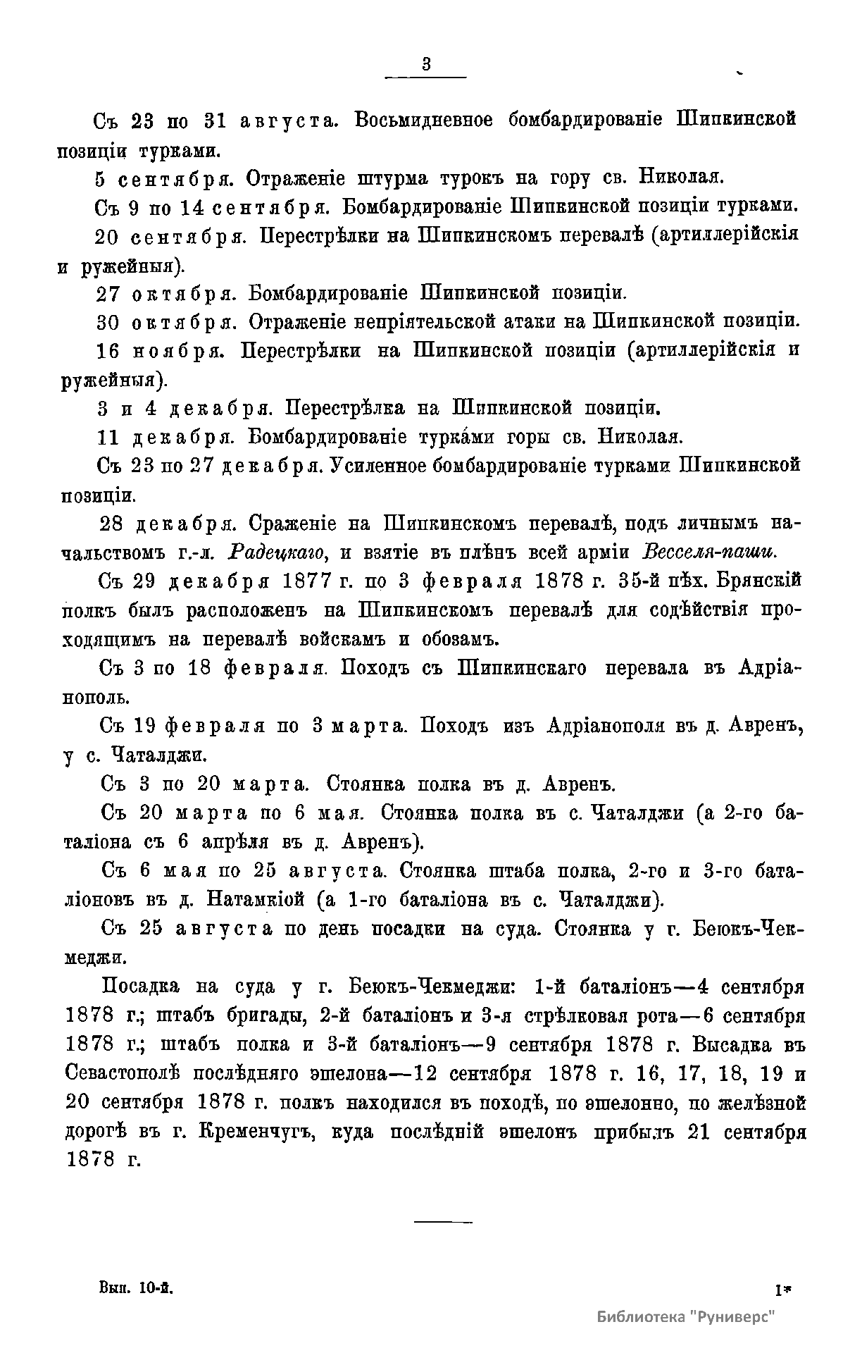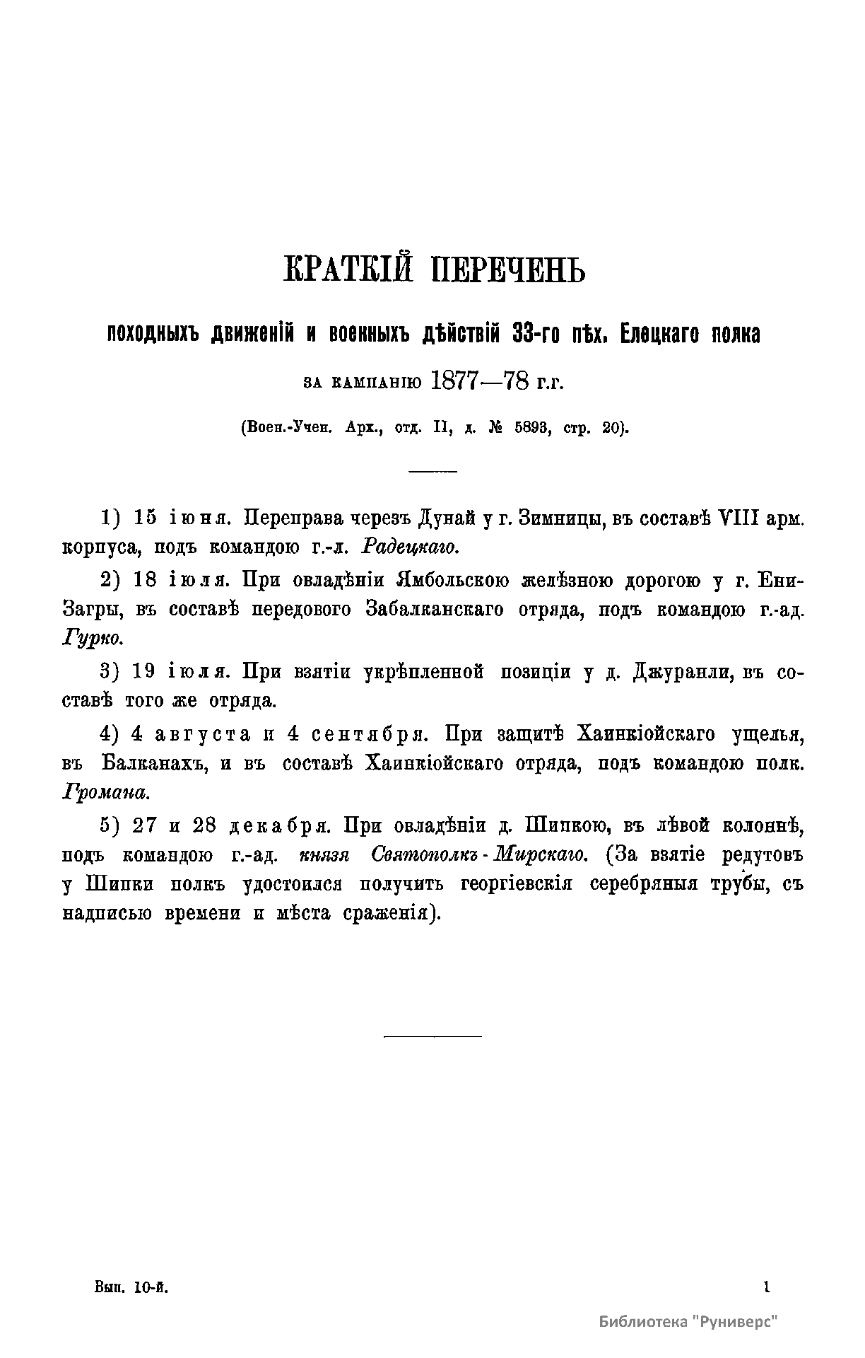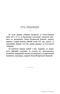 Военно-историческая комиссия Генерального штаба представляет сборник материалов по русско-турецкой войне 1877 – 1878 гг. на Балканском полуострове в 97 выпусках. Издание формирует полное представление о военных действиях и участниках этой войны. Русско-турецкая война 1877 – 1878 гг. была вызвана нежеланием Турции принять меры к улучшению положения подвластных ей христианских княжеств, обусловленному парижским трактатом 1856 г, и стремлением России укрепить свое влияние на Балканах. Способствовала освобождению народов Балканского полуострова от османского владычества. Россия объявила войну Турции 12 апреля 1877 г. Основные события: 1877 – сражение на Шипке, осада и взятие русскими войсками Плевны и Карса; 1878 – зимний переход русской армии через Балканский хребет, победы у Шипки – Шейново, Филиппополя, взятие Адрианополя. Завершилась Сан-Стефанским миром 1878 г., который обеспечил независимость балканским народам и территориальные приобретения России. Но Берлинский трактат ограничил независимость Болгарии и влияние России на Балканах.
