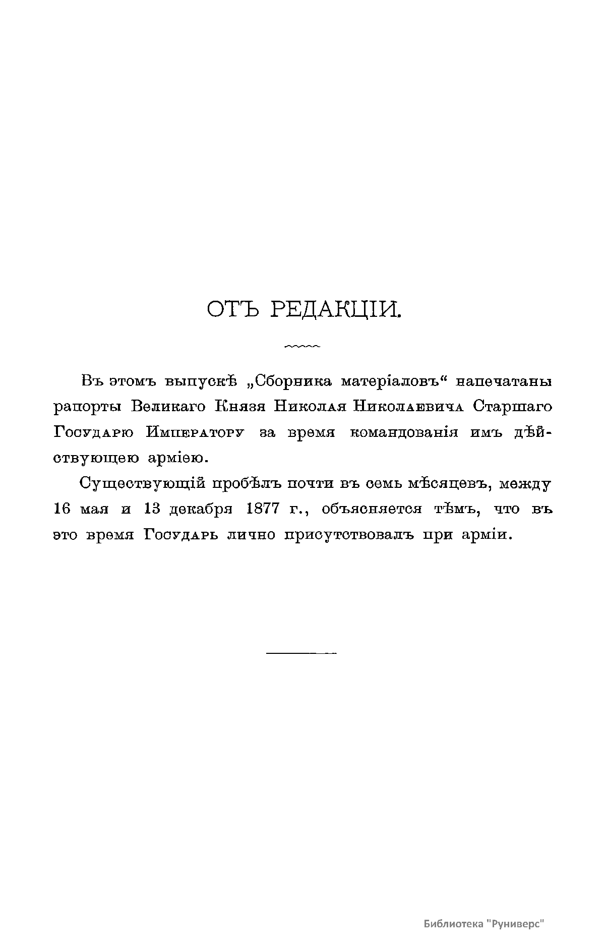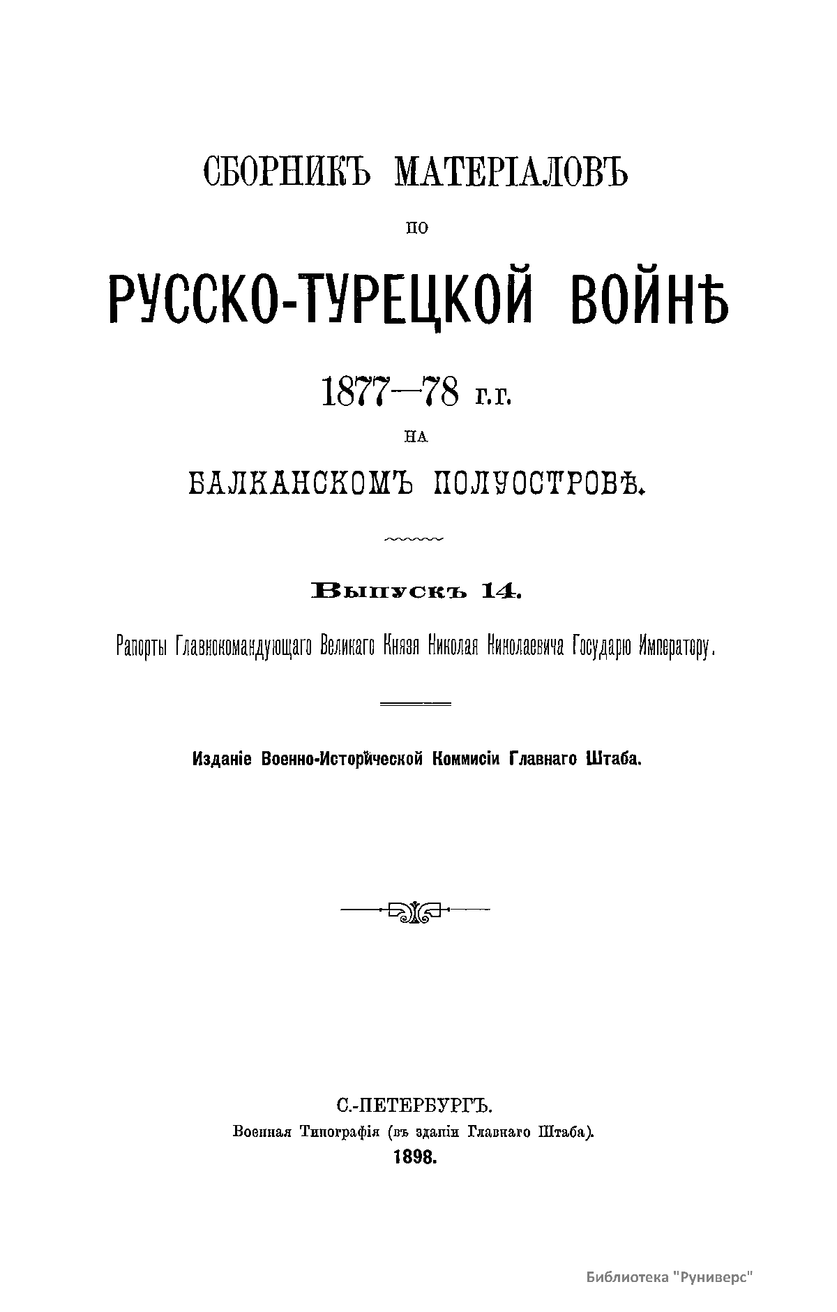 Сборникъ матерiаловъ по русско-турецкой войнѣ 1877-1878 г.г. на Балканскомъ полуостровѣ. Выпускъ 14. Рапорты Главнокомандующаго Великаго Князя Николая Николаевича Государю Императору