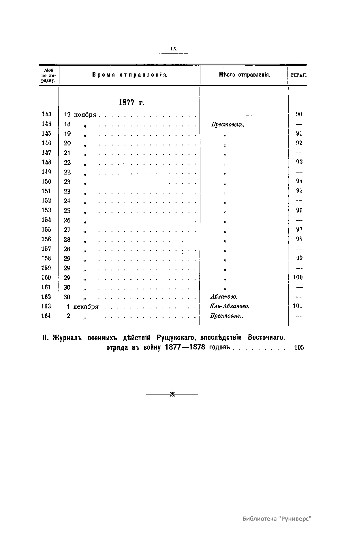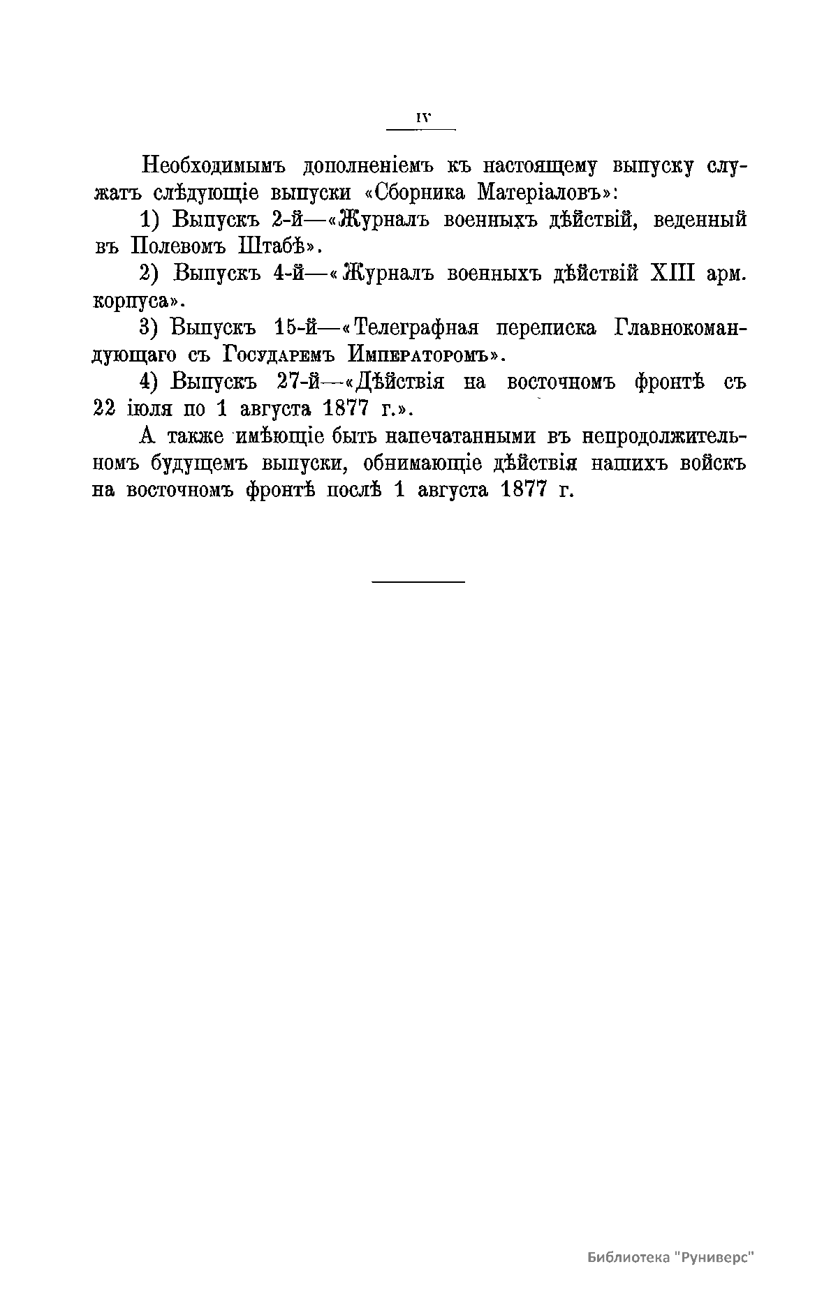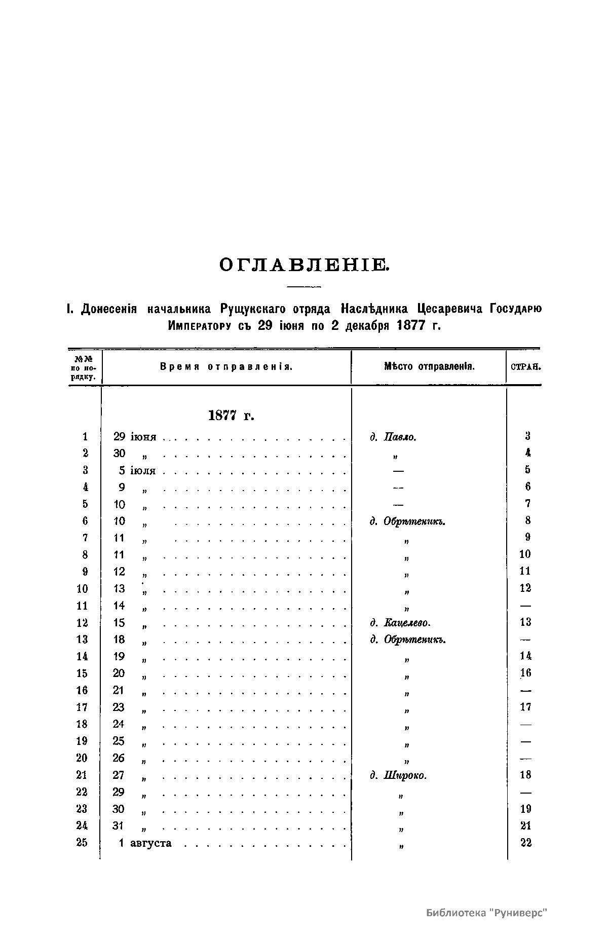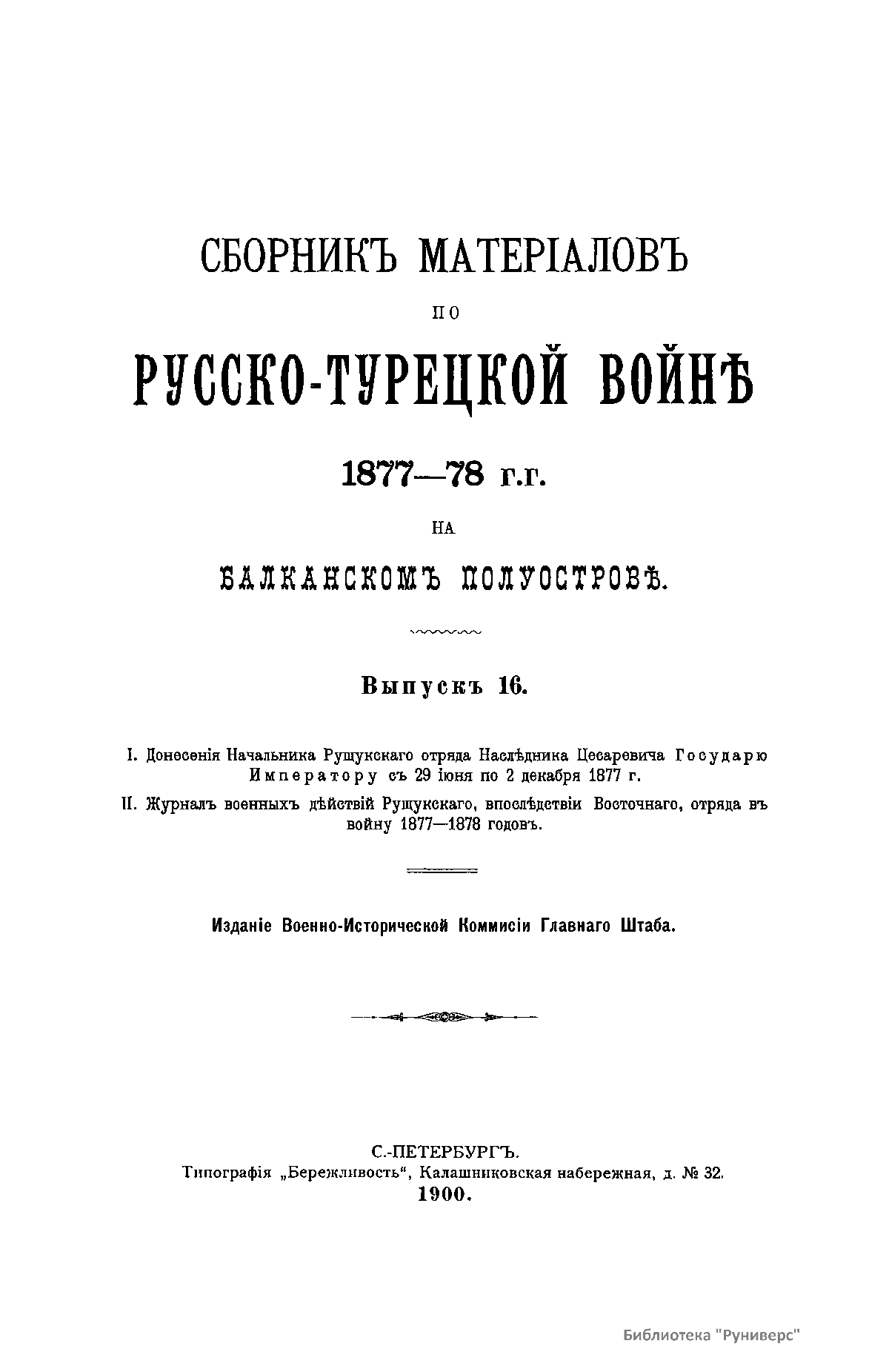 Сборникъ матерiаловъ по русско-турецкой войнѣ 1877-1878 г.г. на Балканскомъ полуостровѣ. Выпускъ 16. I. Донесенiя Начальника Рущукскаго отряда Наслѣдника Цесаревича Государю Императору съ 29 iюня по 2 декабря 1877 г. II. Журналъ военныхъ дѣйствiй Рущукскаго, впослѣдствши Восточнаго, отряда въ войну 1877-1878 годовъ