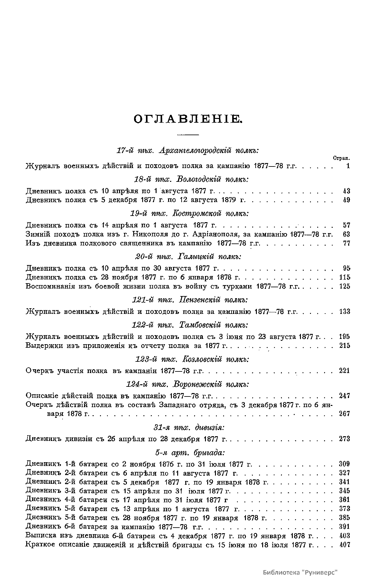 Военно-историческая комиссия Генерального штаба представляет сборник материалов по русско-турецкой войне 1877 – 1878 гг. на Балканском полуострове в 97 выпусках. Издание формирует полное представление о военных действиях и участниках этой войны. Русско-турецкая война 1877 – 1878 гг. была вызвана нежеланием Турции принять меры к улучшению положения подвластных ей христианских княжеств, обусловленному парижским трактатом 1856 г, и стремлением России укрепить свое влияние на Балканах. Способствовала освобождению народов Балканского полуострова от османского владычества. Россия объявила войну Турции 12 апреля 1877 г. Основные события: 1877 – сражение на Шипке, осада и взятие русскими войсками Плевны и Карса; 1878 – зимний переход русской армии через Балканский хребет, победы у Шипки – Шейново, Филиппополя, взятие Адрианополя. Завершилась Сан-Стефанским миром 1878 г., который обеспечил независимость балканским народам и территориальные приобретения России. Но Берлинский трактат ограничил независимость Болгарии и влияние России на Балканах.