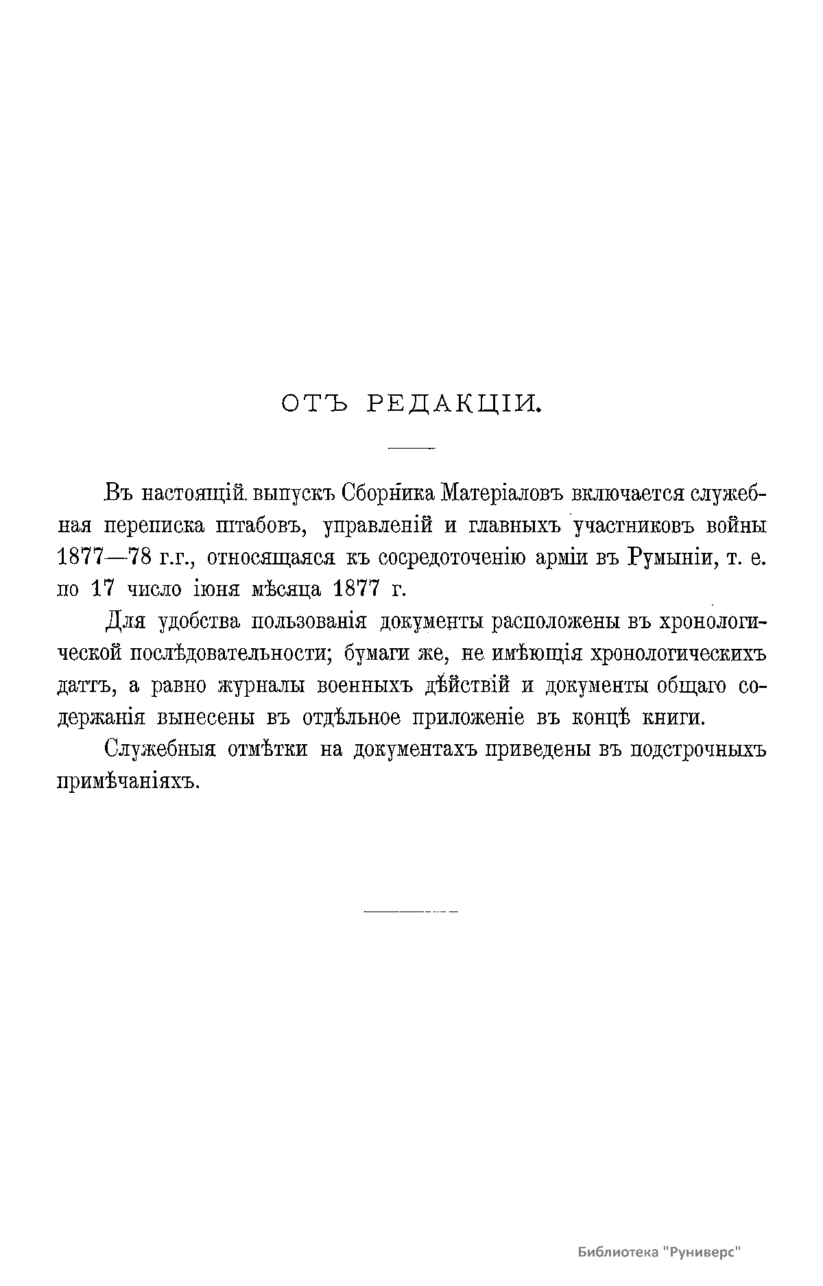 Военно-историческая комиссия Генерального штаба представляет сборник материалов по русско-турецкой войне 1877 – 1878 гг. на Балканском полуострове в 97 выпусках. Издание формирует полное представление о военных действиях и участниках этой войны. Русско-турецкая война 1877 – 1878 гг. была вызвана нежеланием Турции принять меры к улучшению положения подвластных ей христианских княжеств, обусловленному парижским трактатом 1856 г, и стремлением России укрепить свое влияние на Балканах. Способствовала освобождению народов Балканского полуострова от османского владычества. Россия объявила войну Турции 12 апреля 1877 г. Основные события: 1877 – сражение на Шипке, осада и взятие русскими войсками Плевны и Карса; 1878 – зимний переход русской армии через Балканский хребет, победы у Шипки – Шейново, Филиппополя, взятие Адрианополя. Завершилась Сан-Стефанским миром 1878 г., который обеспечил независимость балканским народам и территориальные приобретения России. Но Берлинский трактат ограничил независимость Болгарии и влияние России на Балканах.