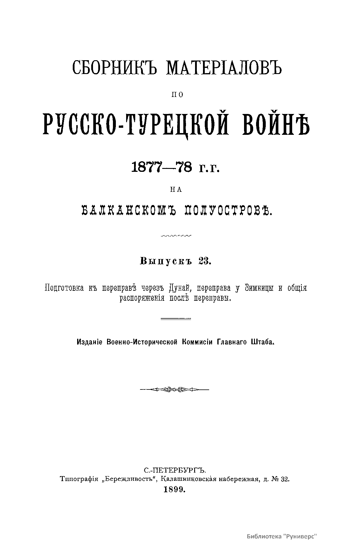 Сборникъ матерiаловъ по русско-турецкой войнѣ 1877-1878 г.г. на Балканскомъ полуостровѣ. Выпускъ 23. Подготовка къ переправѣ черезъ Дунай, переправа у Зимницы и общiя распоряженiя послѣ переправы