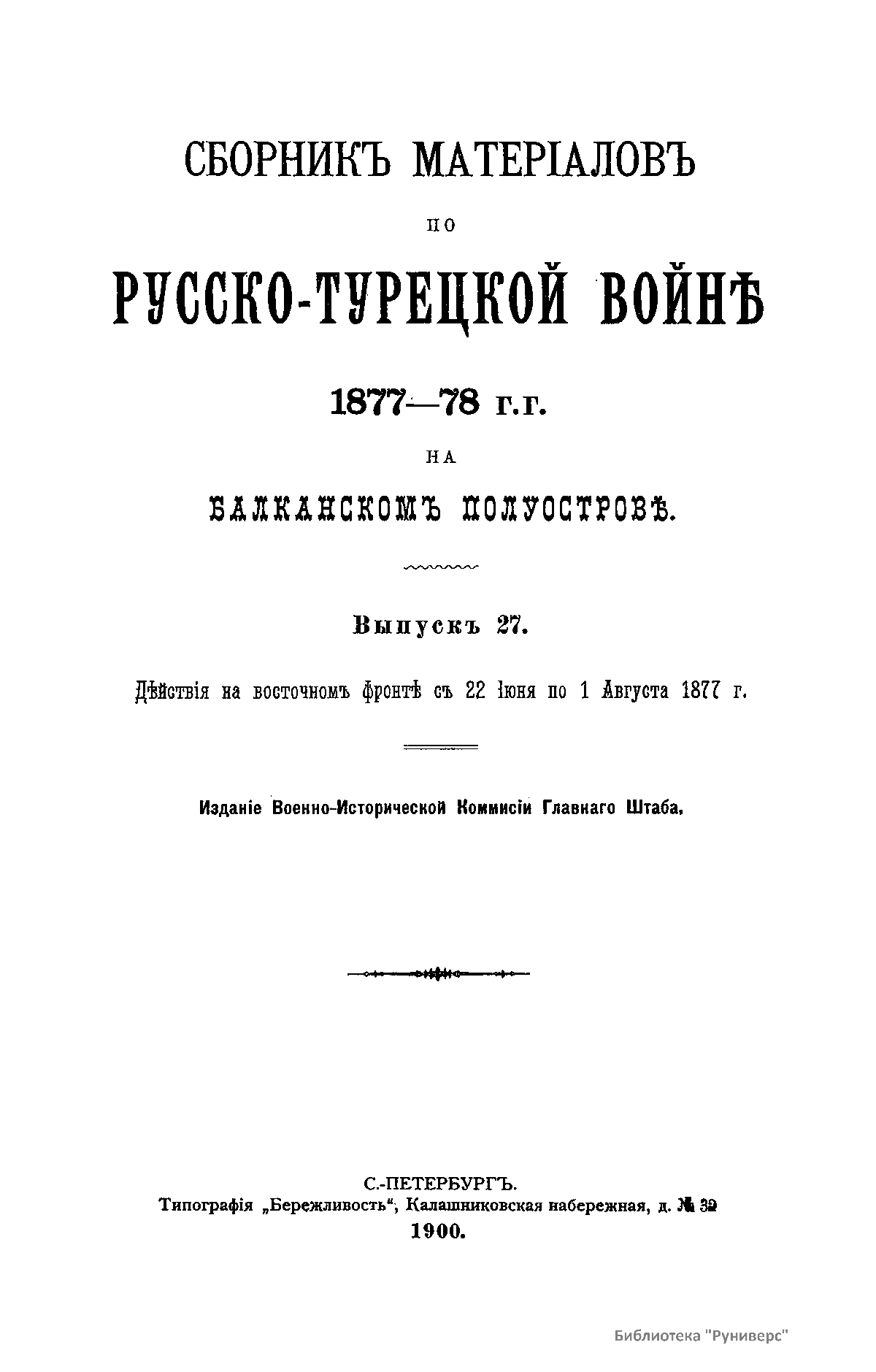 Сборникъ матерiаловъ по русско-турецкой войнѣ 1877-1878 г.г. на Балканскомъ полуостровѣ. Выпускъ 27. Дѣйствiя на восточномъ фронтѣ съ 22 Iюня по 1 августа 1877 г.