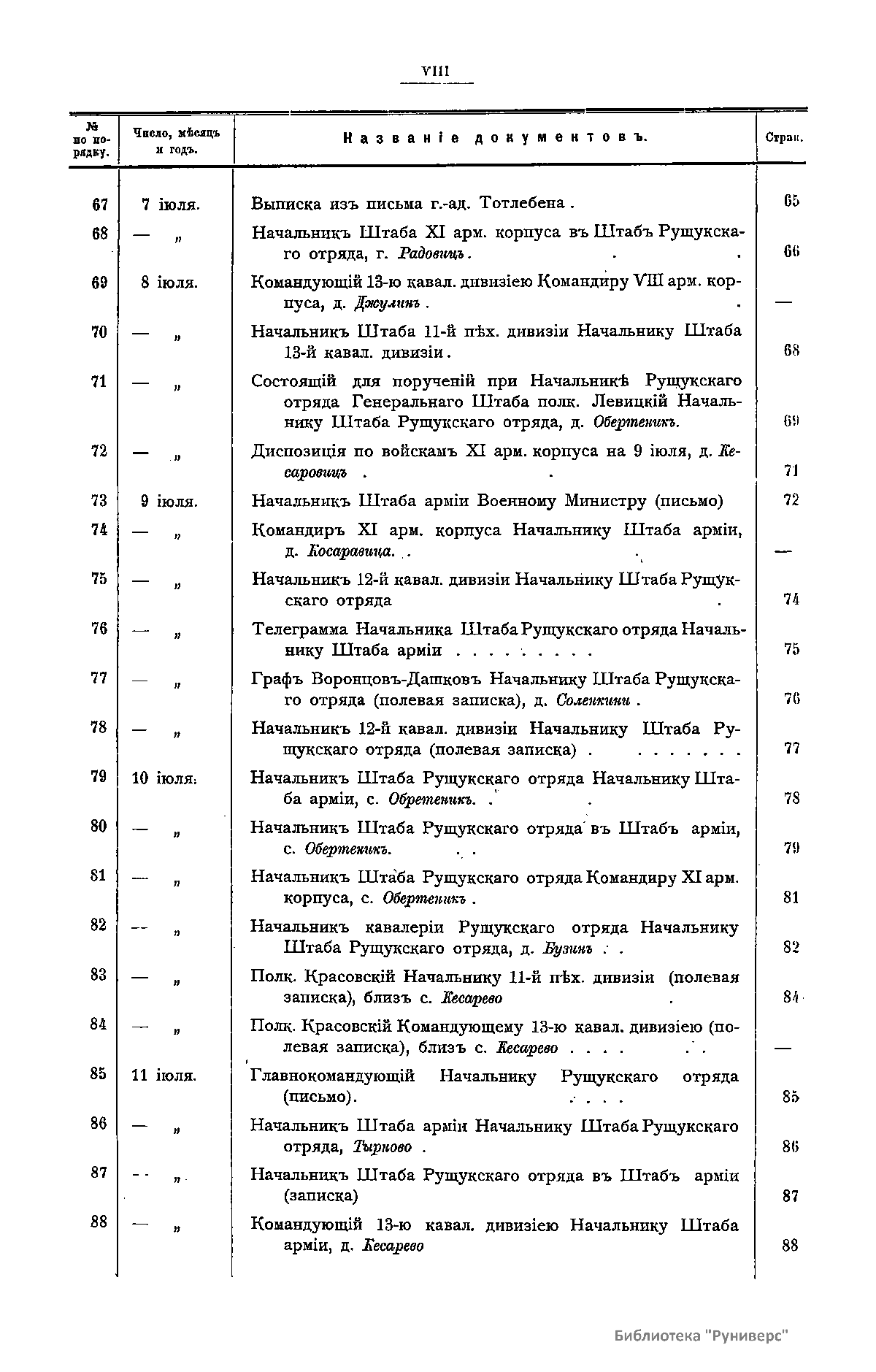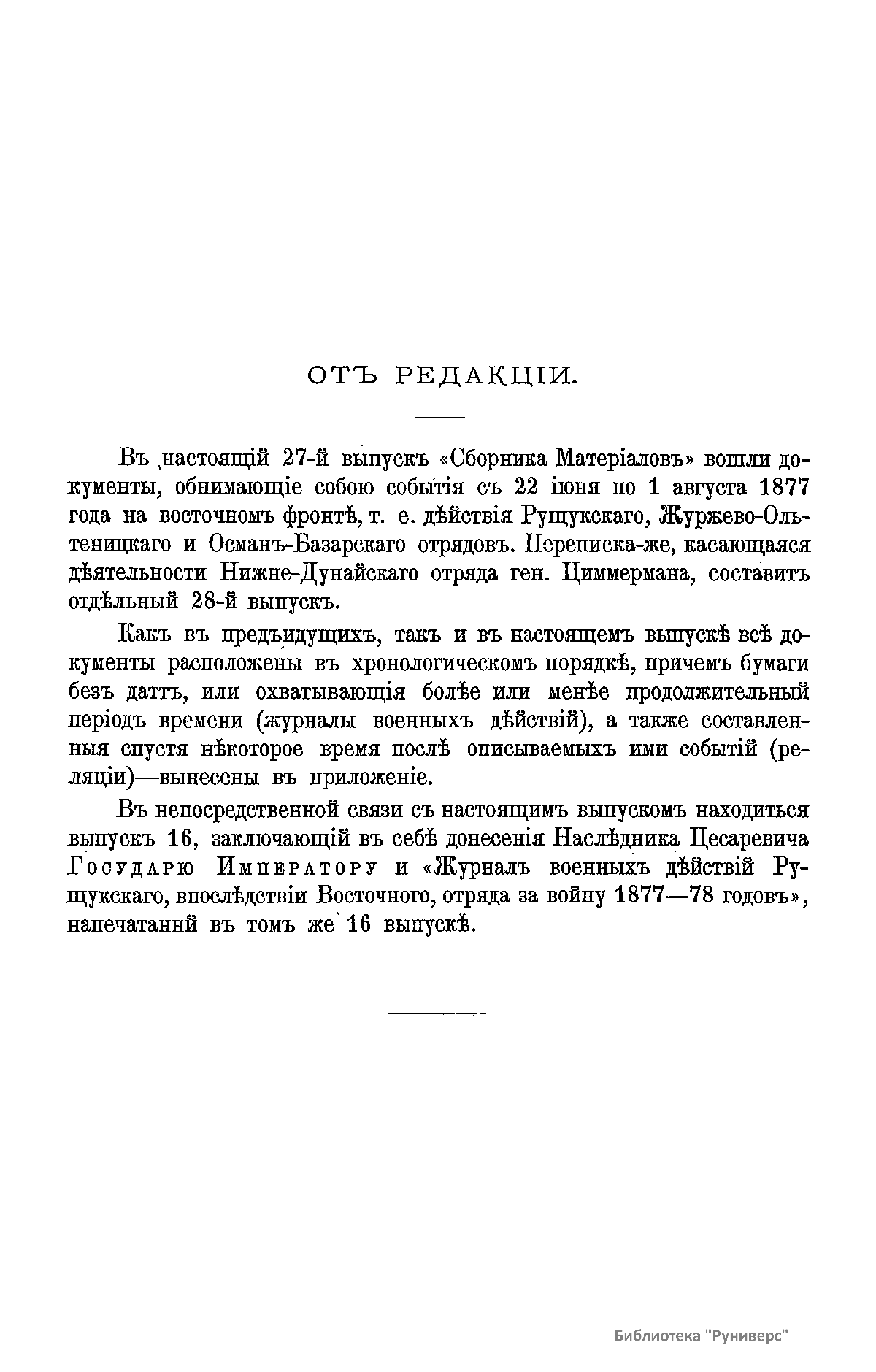 Военно-историческая комиссия Генерального штаба представляет сборник материалов по русско-турецкой войне 1877 – 1878 гг. на Балканском полуострове в 97 выпусках. Издание формирует полное представление о военных действиях и участниках этой войны. Русско-турецкая война 1877 – 1878 гг. была вызвана нежеланием Турции принять меры к улучшению положения подвластных ей христианских княжеств, обусловленному парижским трактатом 1856 г, и стремлением России укрепить свое влияние на Балканах. Способствовала освобождению народов Балканского полуострова от османского владычества. Россия объявила войну Турции 12 апреля 1877 г. Основные события: 1877 – сражение на Шипке, осада и взятие русскими войсками Плевны и Карса; 1878 – зимний переход русской армии через Балканский хребет, победы у Шипки – Шейново, Филиппополя, взятие Адрианополя. Завершилась Сан-Стефанским миром 1878 г., который обеспечил независимость балканским народам и территориальные приобретения России. Но Берлинский трактат ограничил независимость Болгарии и влияние России на Балканах.
