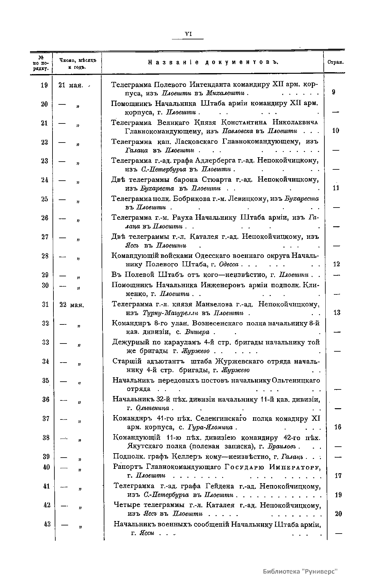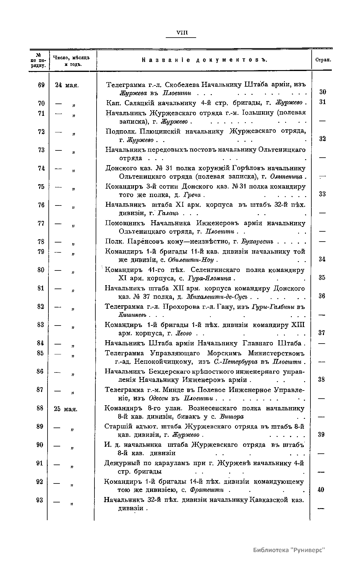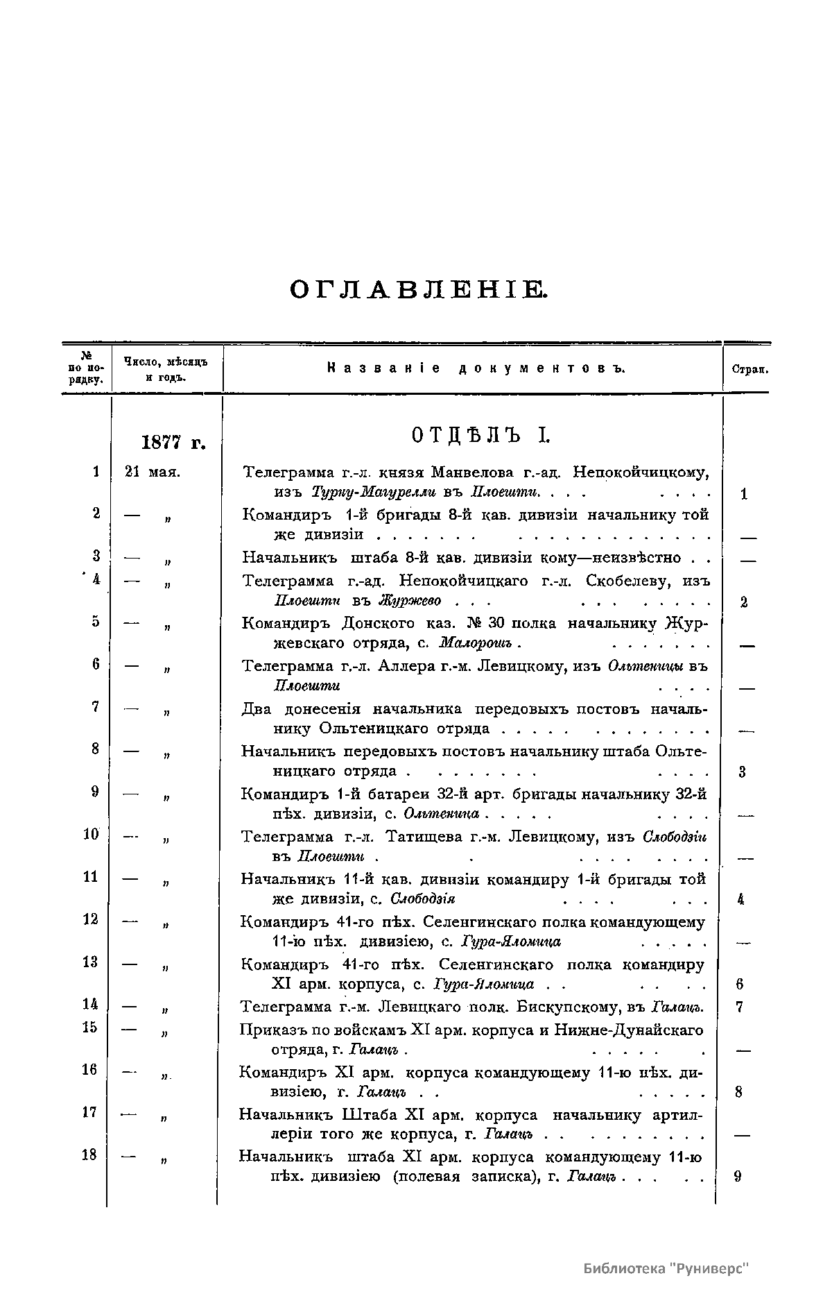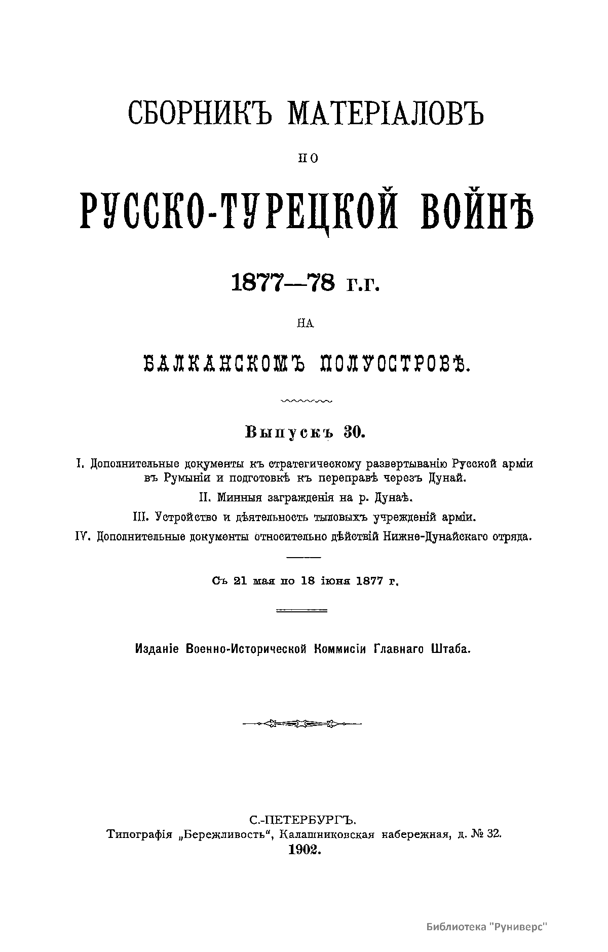 Сборникъ матерiаловъ по русско-турецкой войнѣ 1877-1878 г.г. на Балканскомъ полуостровѣ. Выпускъ 30. I. Дополнительные документы къ стратегическому развертыванiю Русской армiи въ Румынiи и подготовкѣ къ переправѣ черезъ Дунай. II. Минныя загражденiя на р. Дунаѣ. III. Устройство и дѣятельность тыловыхъ учрежденiй армiи. IV. Дополнительные документы относительно дѣйствiй Нижне-Дунайскаго отряда. Съ 21 мая по 18 iюня 1877 г.