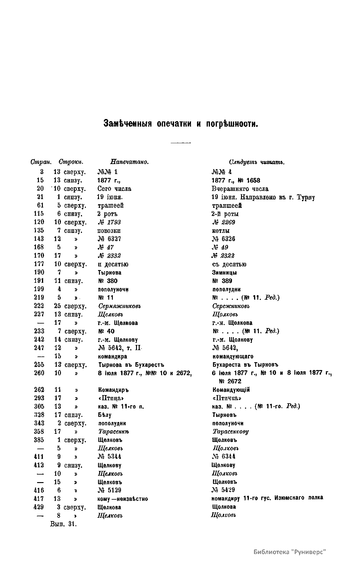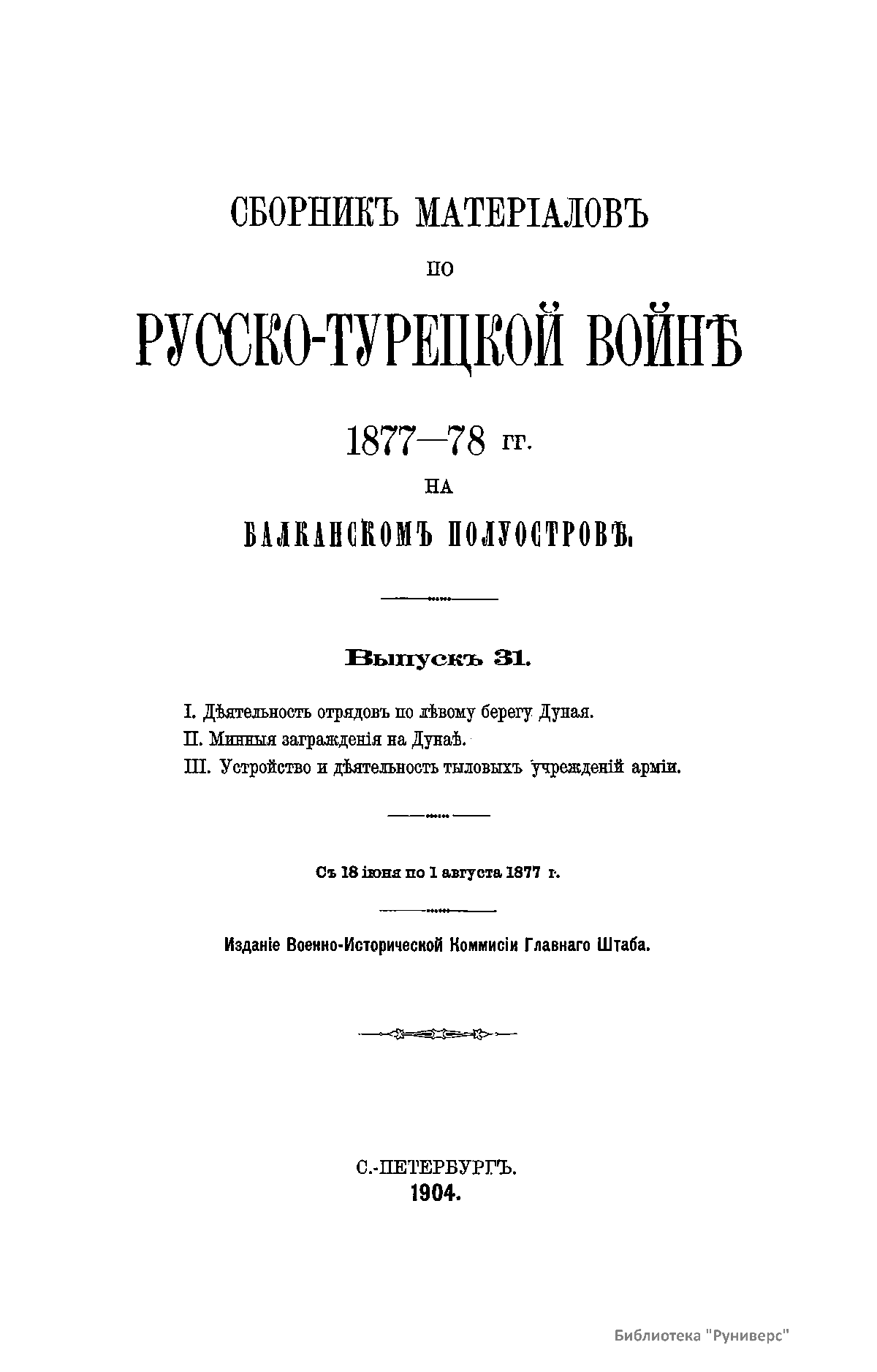 Сборникъ матерiаловъ по русско-турецкой войнѣ 1877-1878 г.г. на Балканскомъ полуостровѣ. Выпускъ 31. I. Дѣятельность отрядовъ по лѣвому берегу Дуная. II Минныя загражденiя на Дунаѣ. III. Устройство и дѣятельность тыловыхъ учрежденiй армiи. Съ 18 iюня по 1 августа 1877 г.