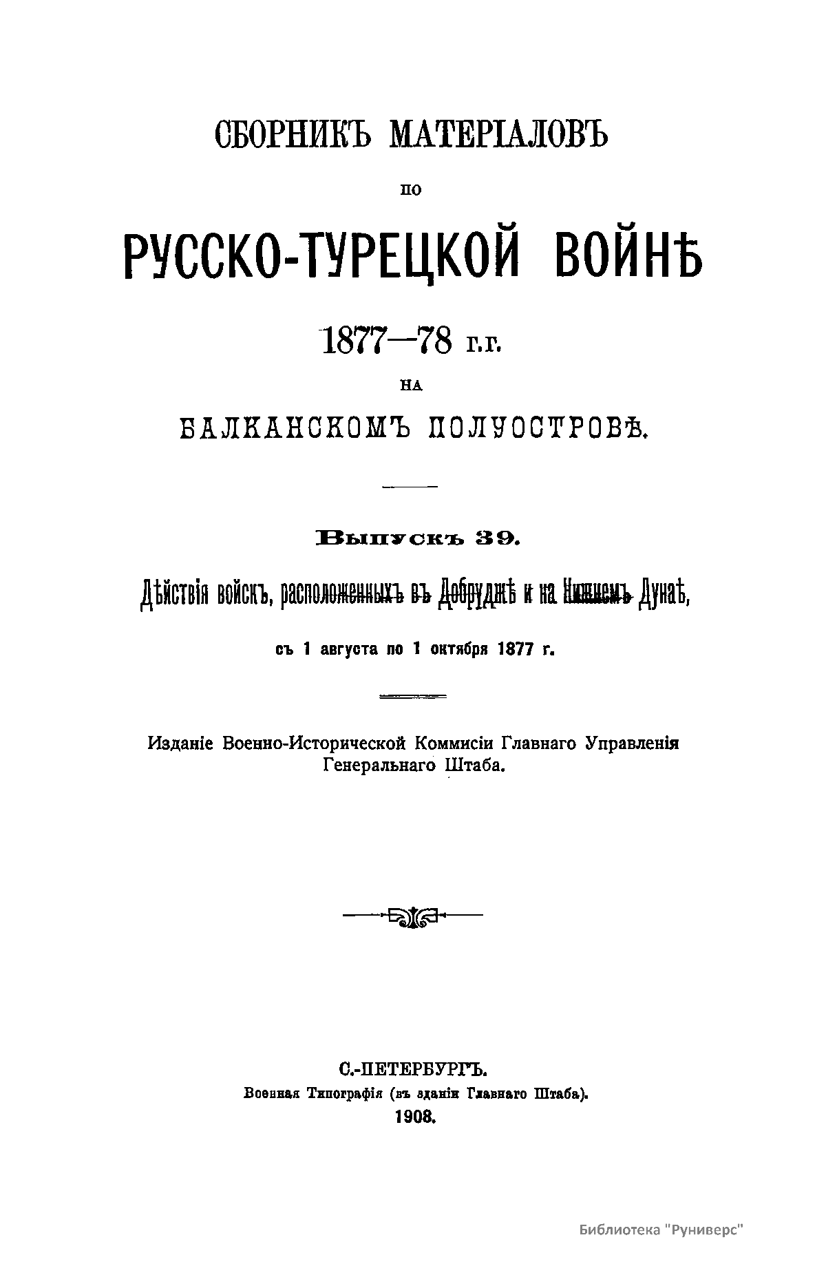 Сборникъ матерiаловъ по русско-турецкой войнѣ 1877-1878 г.г. на Балканскомъ полуостровѣ. Выпускъ 39. Дѣйствія войскъ, расположенныхъ въ Добруджѣ и на Нижнемъ Дунаѣ съ 1 августа по 1 октября 1877 г.