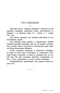 Военно-историческая комиссия Генерального штаба представляет сборник материалов по русско-турецкой войне 1877 – 1878 гг. на Балканском полуострове в 97 выпусках. Издание формирует полное представление о военных действиях и участниках этой войны. Русско-турецкая война 1877 – 1878 гг. была вызвана нежеланием Турции принять меры к улучшению положения подвластных ей христианских княжеств, обусловленному парижским трактатом 1856 г, и стремлением России укрепить свое влияние на Балканах. Способствовала освобождению народов Балканского полуострова от османского владычества. Россия объявила войну Турции 12 апреля 1877 г. Основные события: 1877 – сражение на Шипке, осада и взятие русскими войсками Плевны и Карса; 1878 – зимний переход русской армии через Балканский хребет, победы у Шипки – Шейново, Филиппополя, взятие Адрианополя. Завершилась Сан-Стефанским миром 1878 г., который обеспечил независимость балканским народам и территориальные приобретения России. Но Берлинский трактат ограничил независимость Болгарии и влияние России на Балканах.