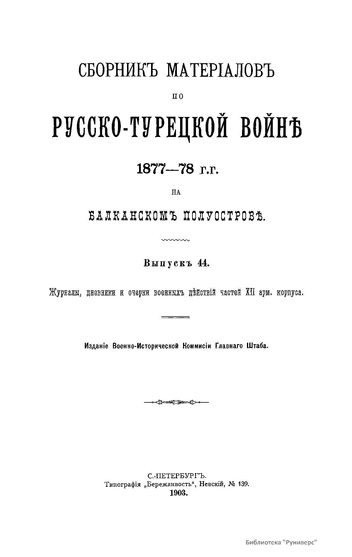 Сборникъ матерiаловъ по русско-турецкой войнѣ 1877-1878 г.г. на Балканскомъ полуостровѣ. Выпускъ 44. Журналы, дневники и очерки военныхъ дѣйствiй частей XII арм. корпуса
