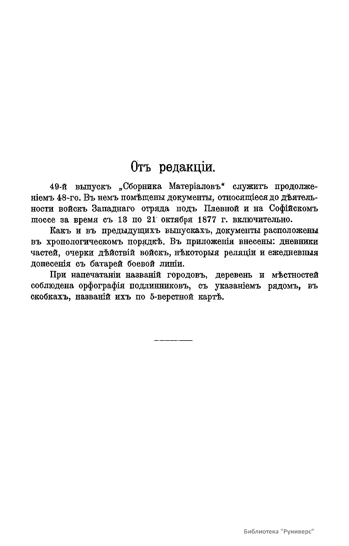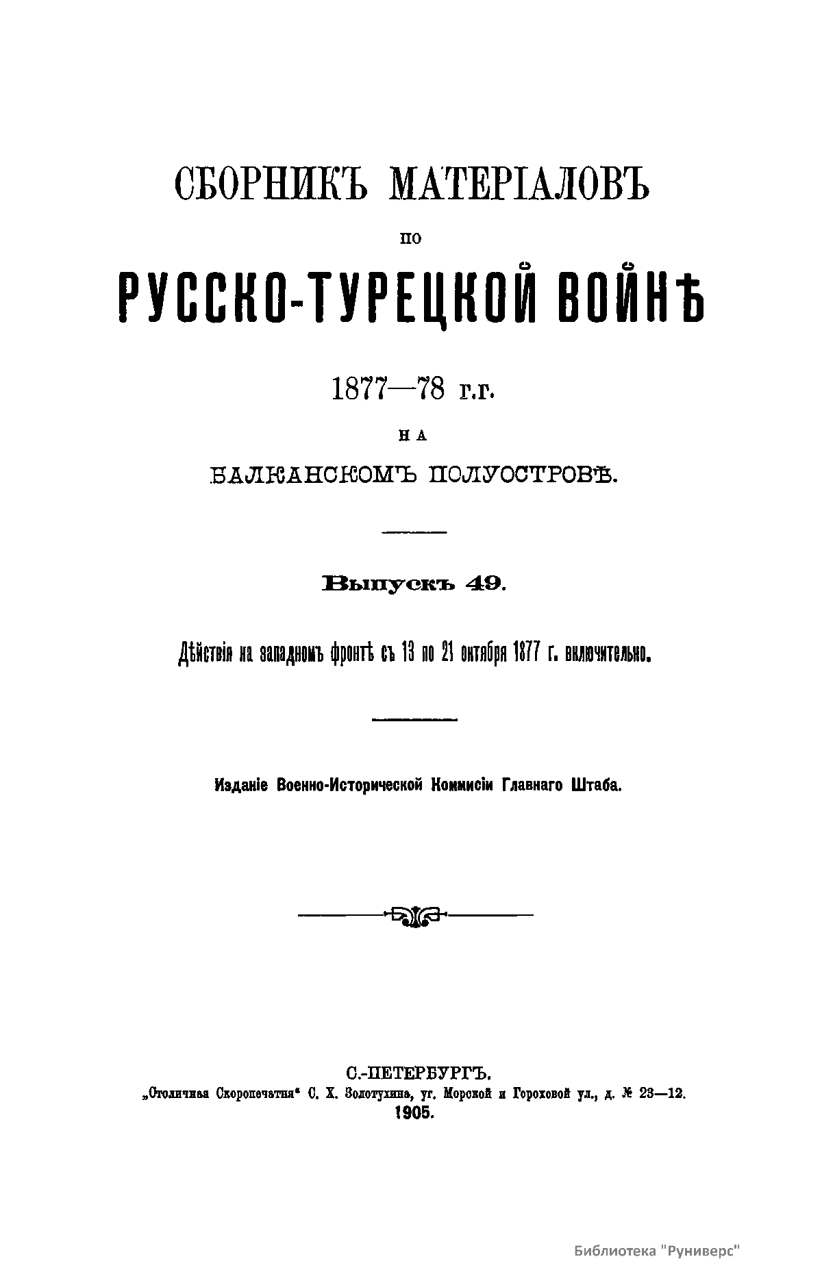 Сборникъ матерiаловъ по русско-турецкой войнѣ 1877-1878 г.г. на Балканскомъ полуостровѣ. Выпускъ 49. Дѣйствiя на западномъ фронтѣ съ 13 по 21 октября 1877 г. включительно