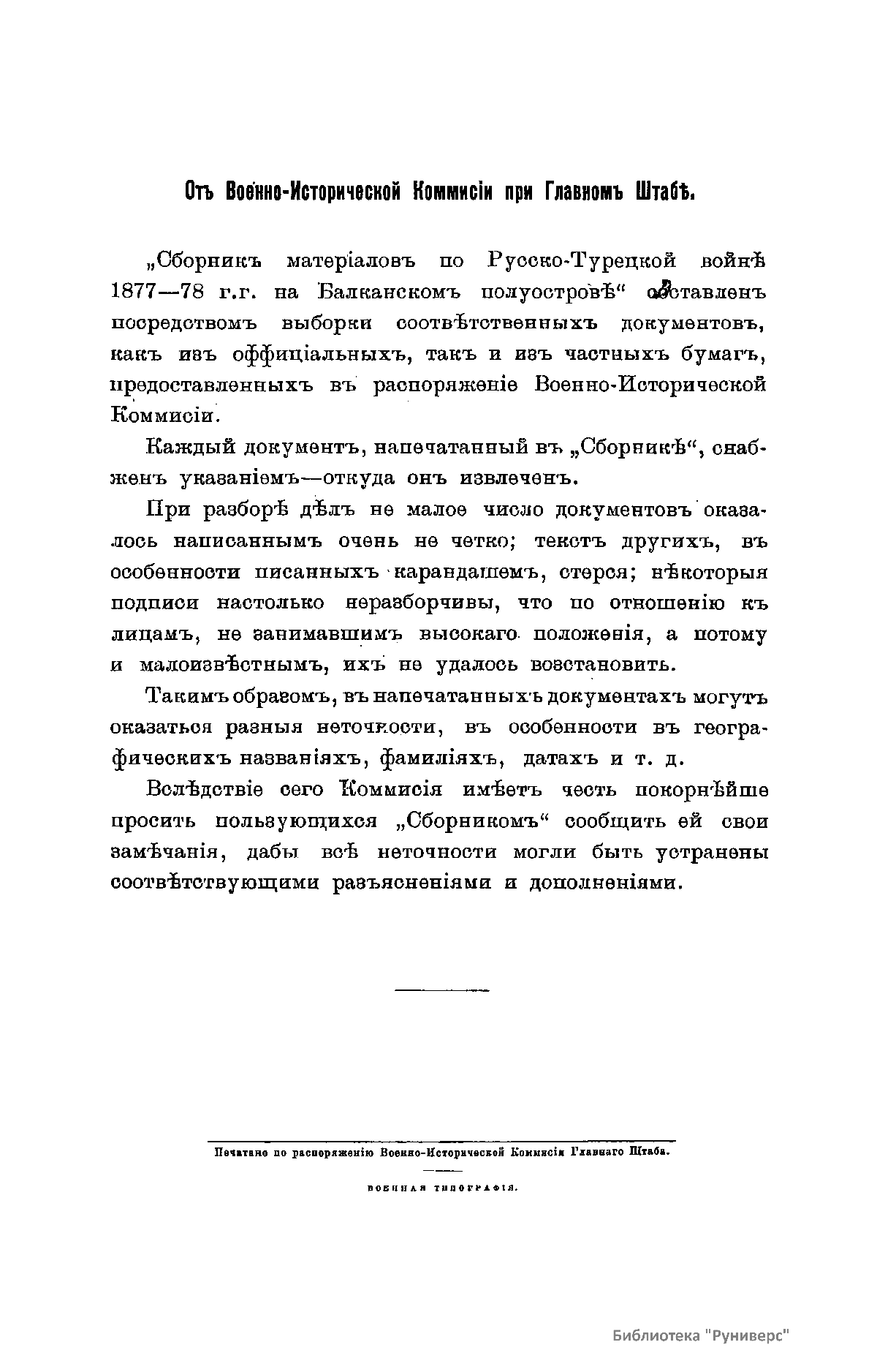 Военно-историческая комиссия Генерального штаба представляет сборник материалов по русско-турецкой войне 1877 – 1878 гг. на Балканском полуострове в 97 выпусках. Издание формирует полное представление о военных действиях и участниках этой войны. Русско-турецкая война 1877 – 1878 гг. была вызвана нежеланием Турции принять меры к улучшению положения подвластных ей христианских княжеств, обусловленному парижским трактатом 1856 г, и стремлением России укрепить свое влияние на Балканах. Способствовала освобождению народов Балканского полуострова от османского владычества. Россия объявила войну Турции 12 апреля 1877 г. Основные события: 1877 – сражение на Шипке, осада и взятие русскими войсками Плевны и Карса; 1878 – зимний переход русской армии через Балканский хребет, победы у Шипки – Шейново, Филиппополя, взятие Адрианополя. Завершилась Сан-Стефанским миром 1878 г., который обеспечил независимость балканским народам и территориальные приобретения России. Но Берлинский трактат ограничил независимость Болгарии и влияние России на Балканах.