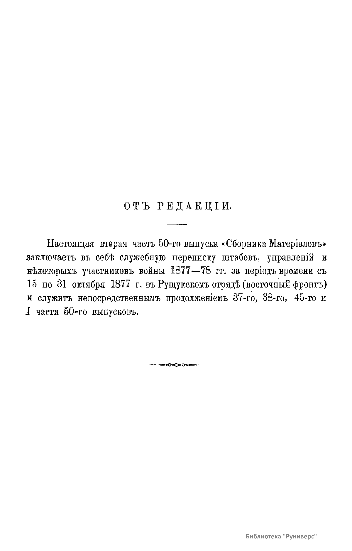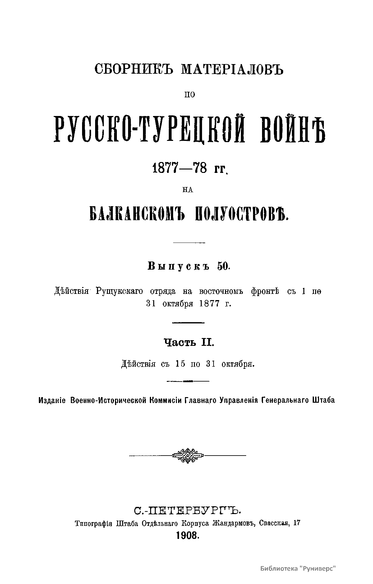 Сборникъ матерiаловъ по русско-турецкой войнѣ 1877-1878 г.г. на Балканскомъ полуостровѣ. Выпускъ 50. Дѣйствiя Рущукскаго отряда на восточномъ фронтѣ съ 1 по 31 октября 1877 г. Часть I. Дѣйствiя съ 15 по 31 октября