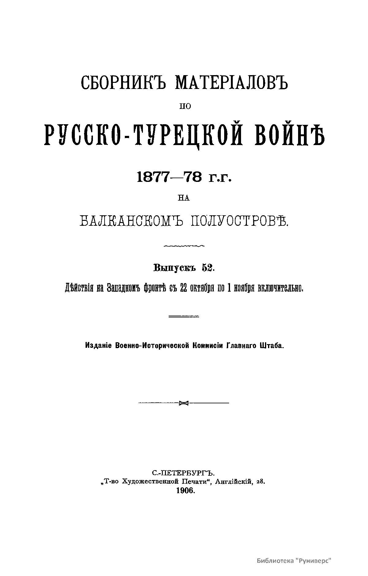 Сборникъ матерiаловъ по русско-турецкой войнѣ 1877-1878 г.г. на Балканскомъ полуостровѣ. Выпускъ 52. Дѣйствiя на Западномъ фронтѣ съ 22 октября по 1 ноября включительно